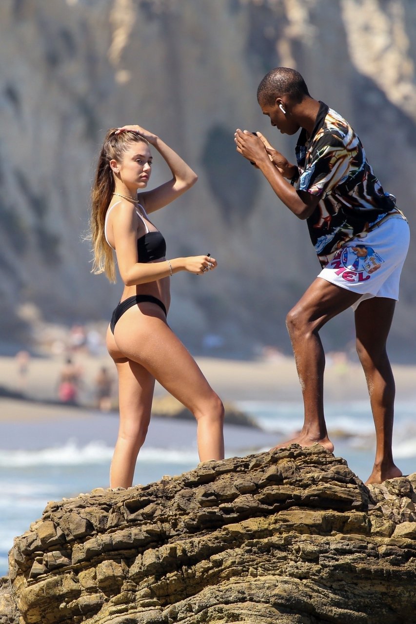 Звезда реалити-шоу Лиза и Гарри Хэмлин дочь, Делайла Хэмлин (20), выглядит безупречно в черно-белом бикини во время любительской фотосессии с другом в Малибу, 15.07.2018. Друг Делайлы делает снимки, направляя ее позы с помощью мобильного телефона. Они вместе смеются, пока фотографы делают снимки.