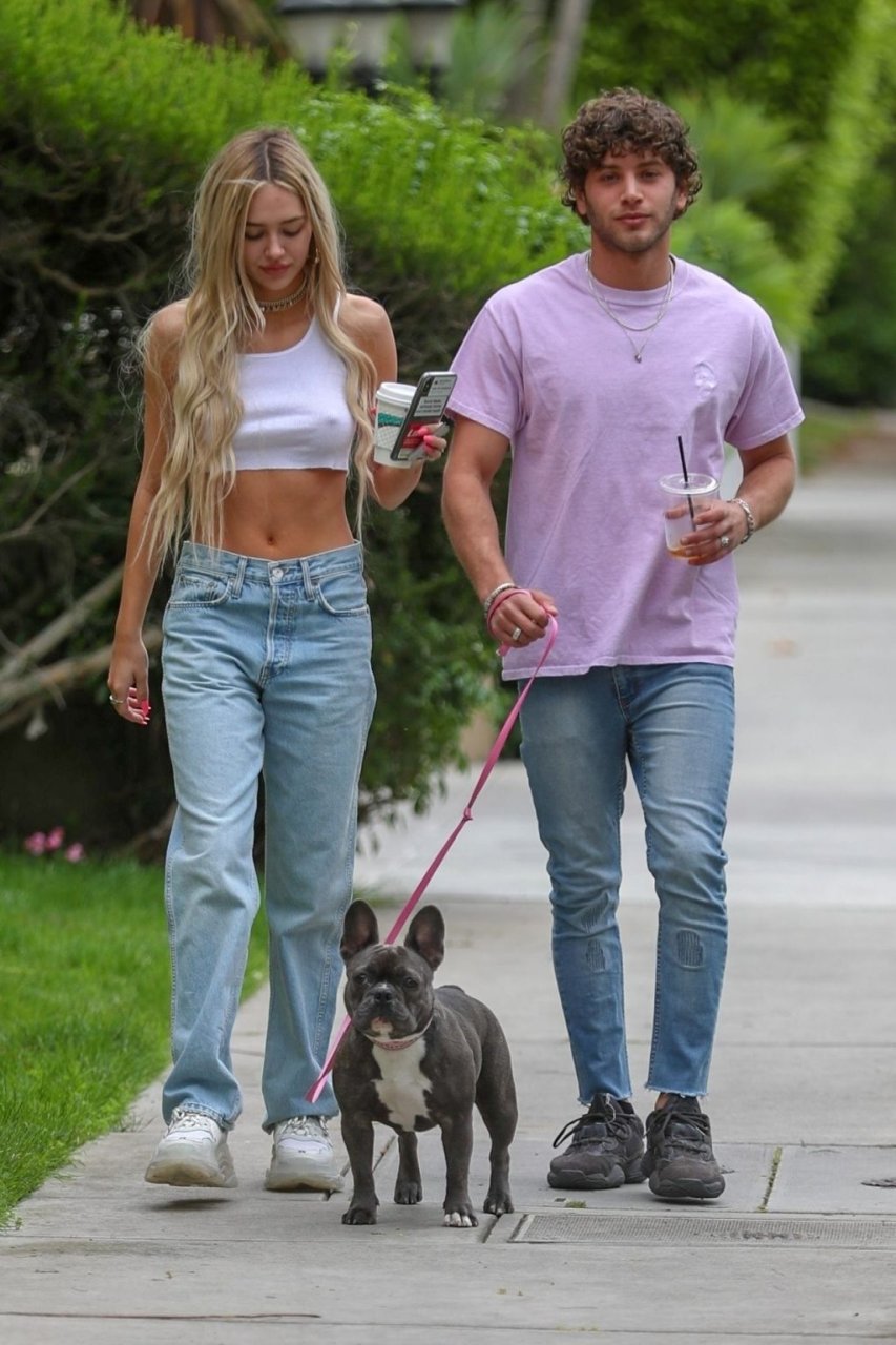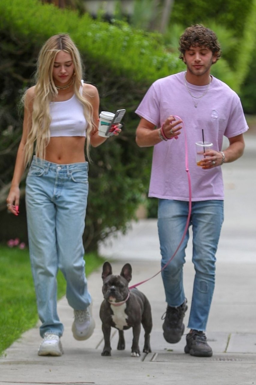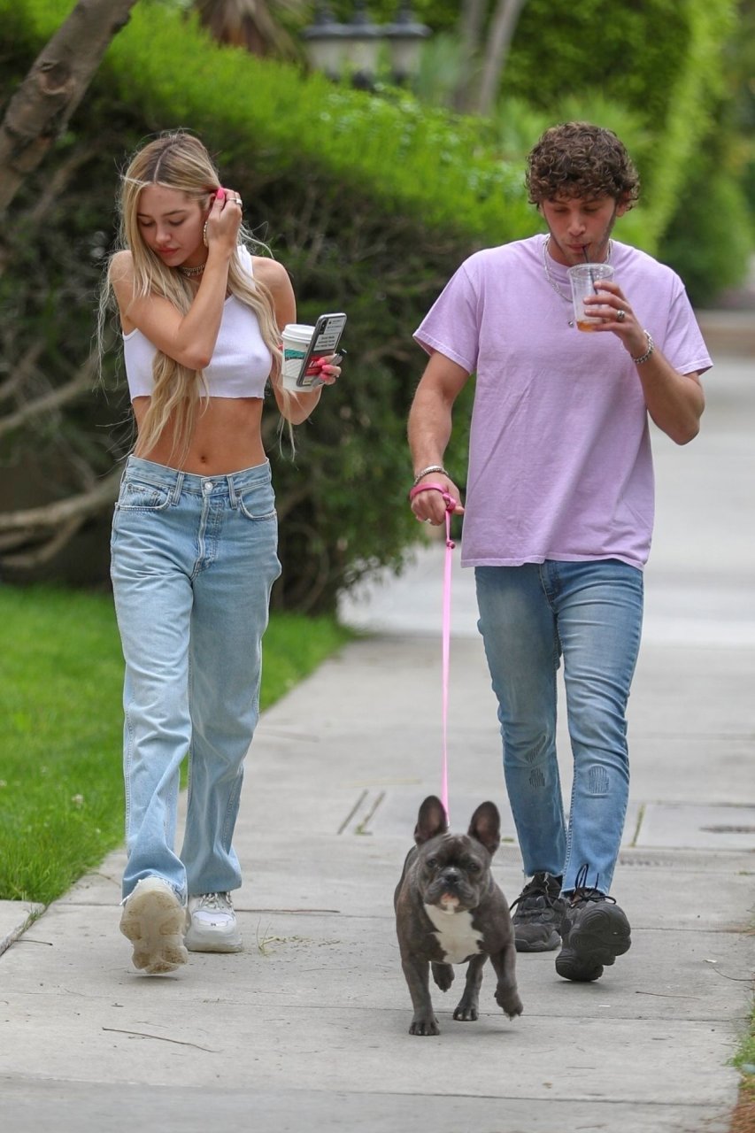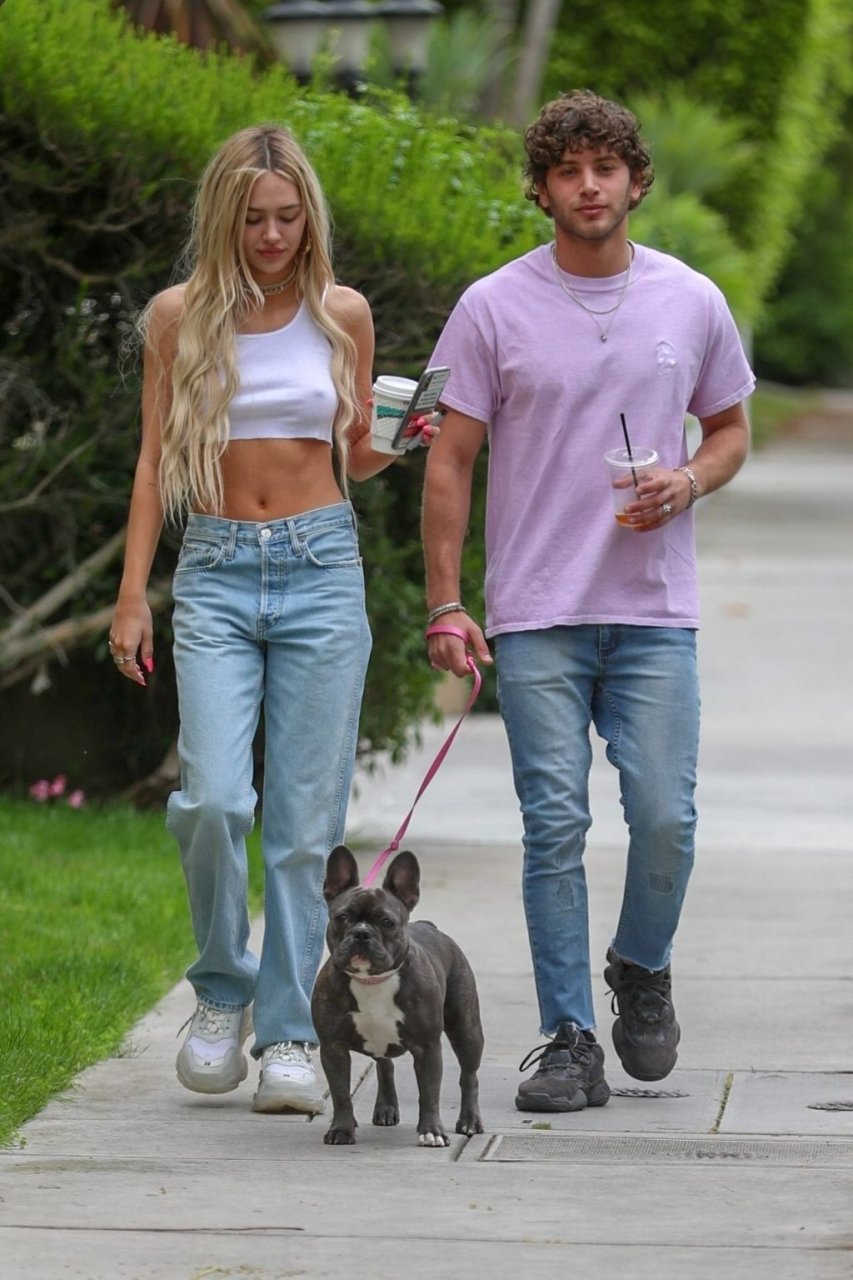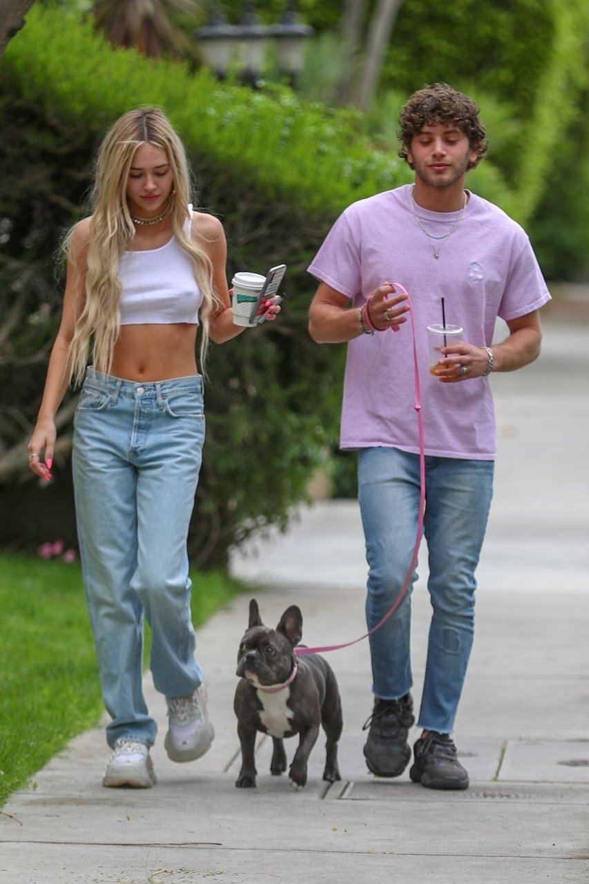 Модель Делайла Белль Хэмлин (20) без бюстгальтера и её партнёр Калли Смоллер наслаждаются завтраком в компании своего французского бульдога.