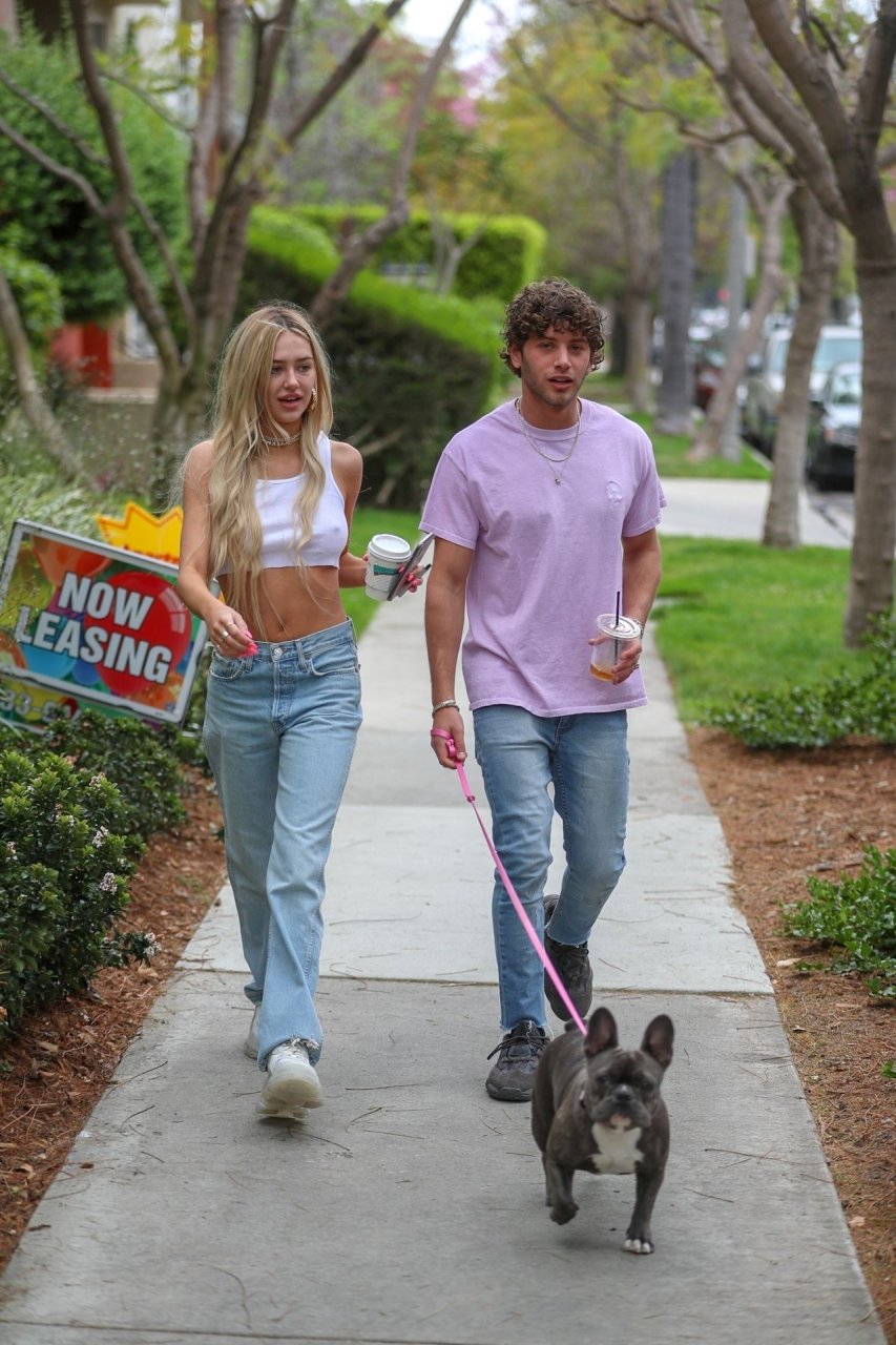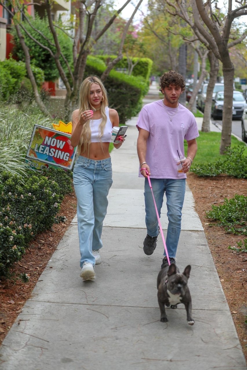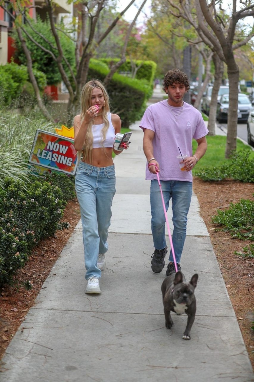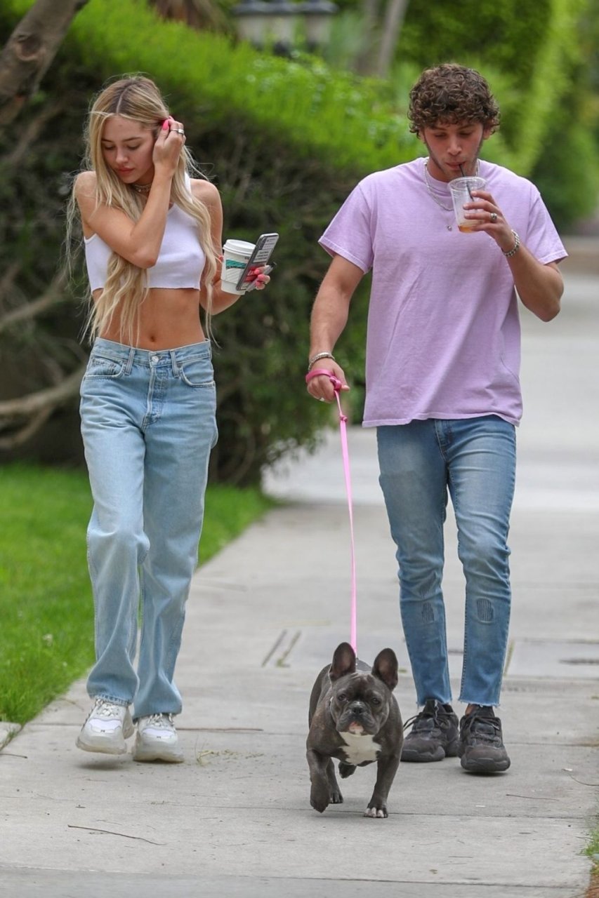 Модель Делайла Белль Хэмлин (20) без бюстгальтера и её партнёр Калли Смоллер наслаждаются завтраком в компании своего французского бульдога.