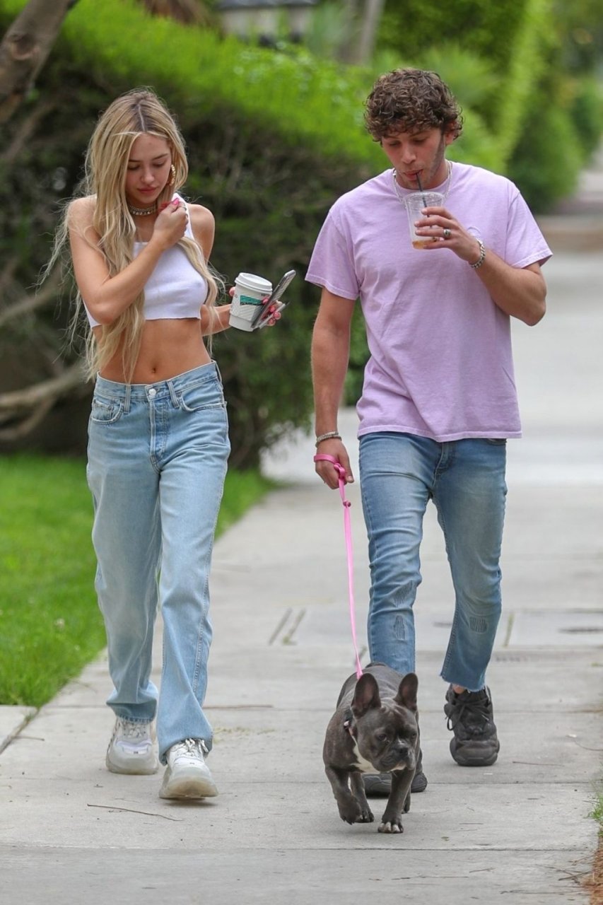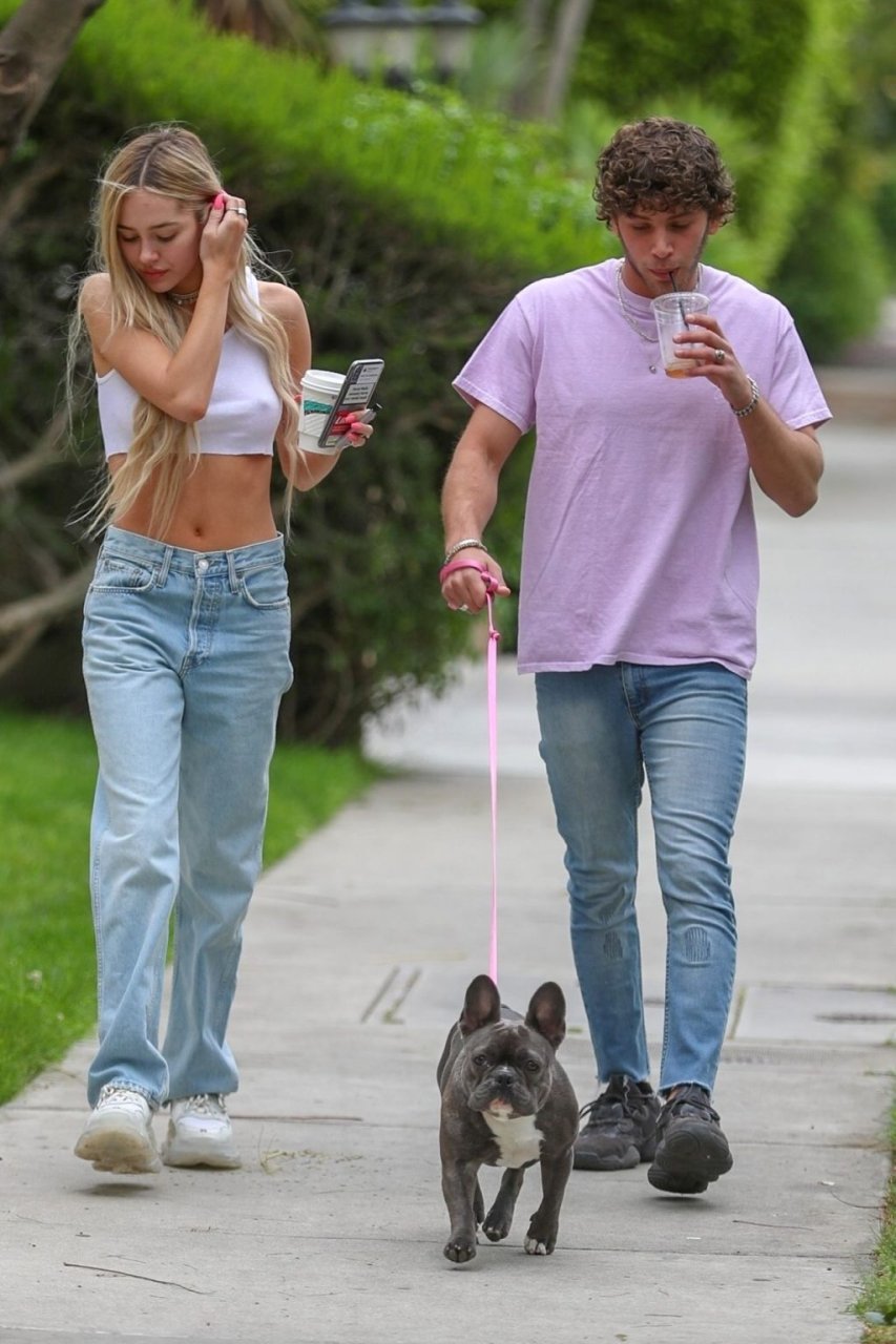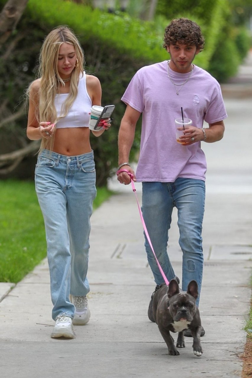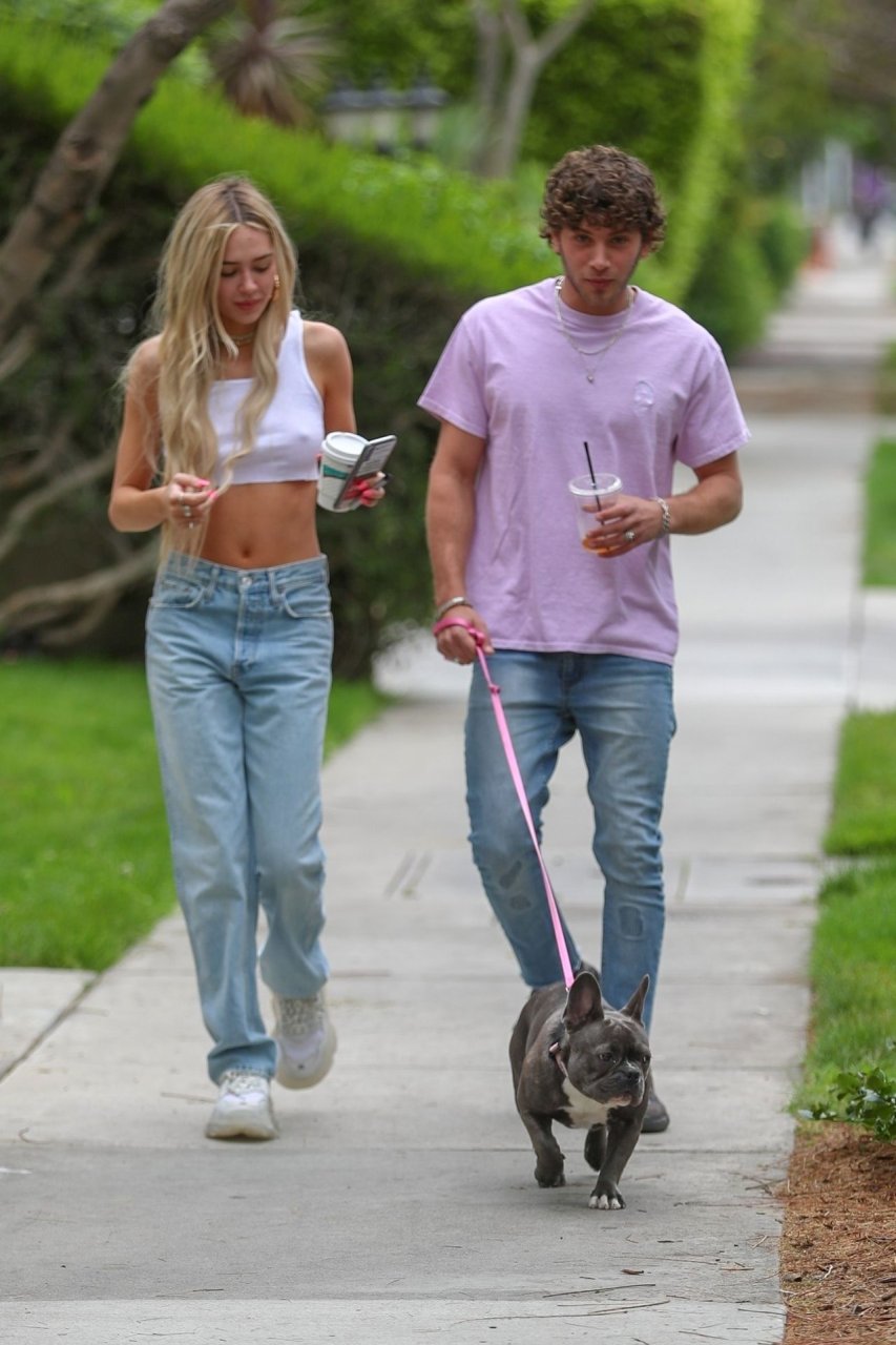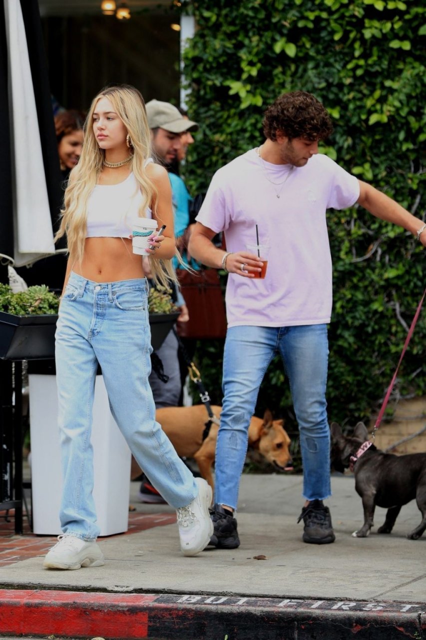 Модель Делайла Белль Хэмлин (20) без бюстгальтера и её партнёр Калли Смоллер наслаждаются завтраком в компании своего французского бульдога.