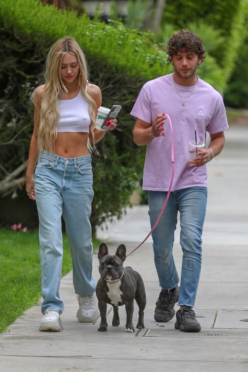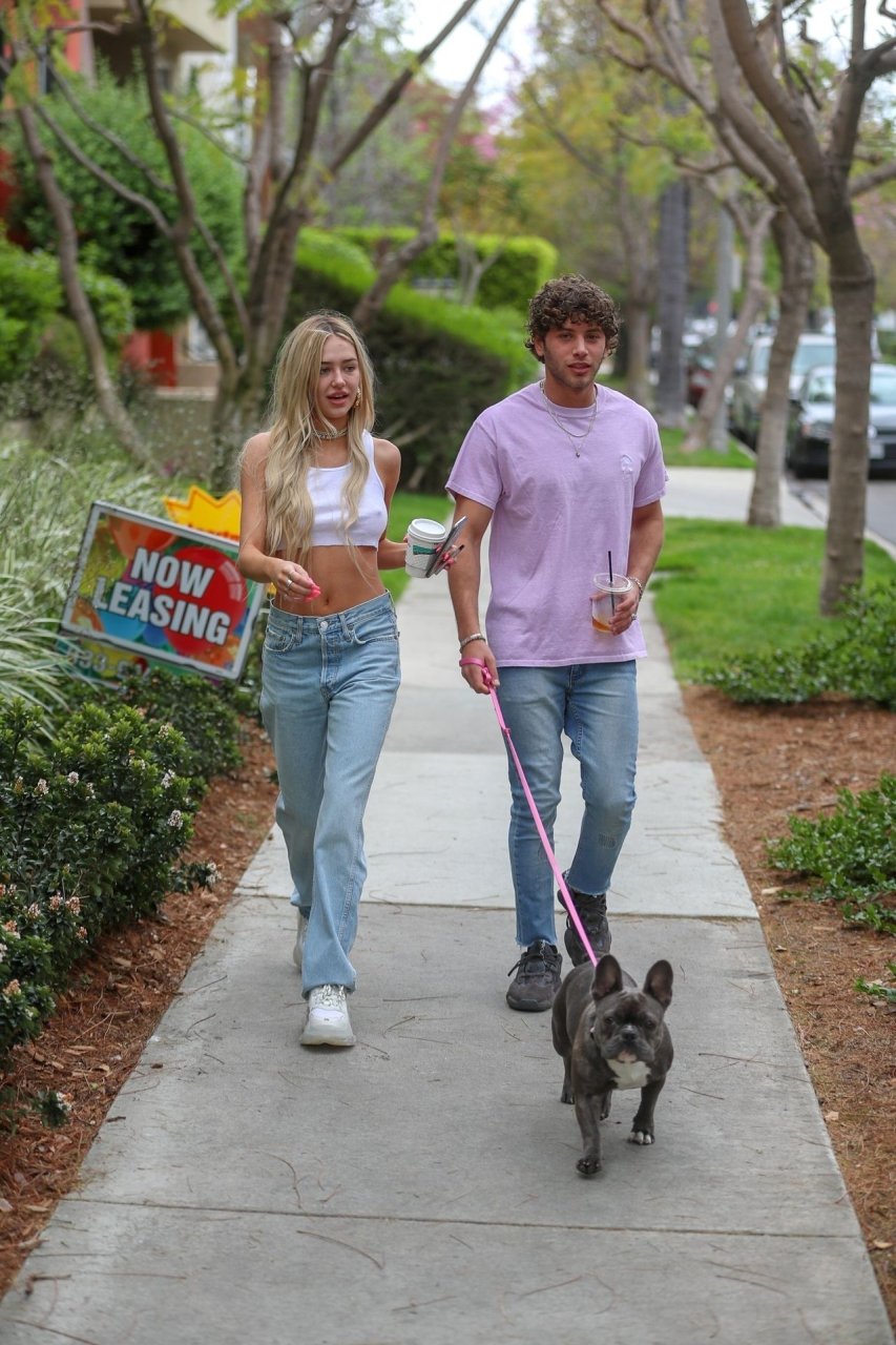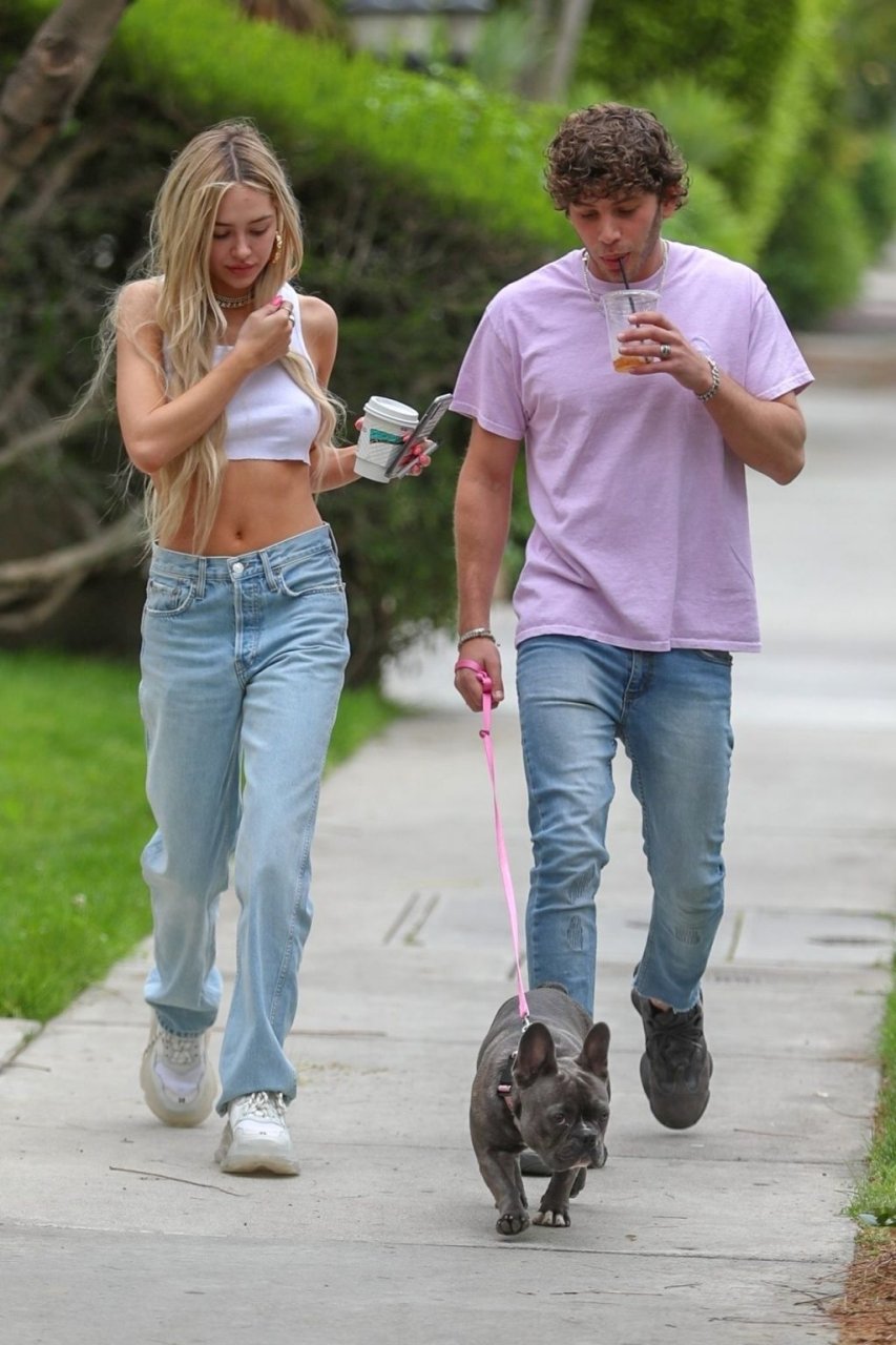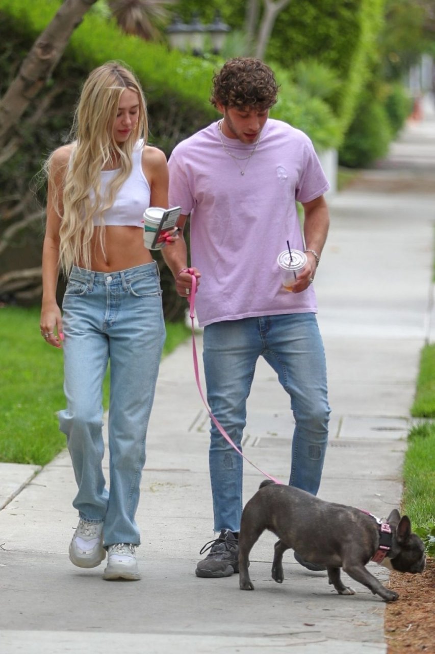 Модель Делайла Белль Хэмлин (20) без бюстгальтера и её партнёр Калли Смоллер наслаждаются завтраком в компании своего французского бульдога.