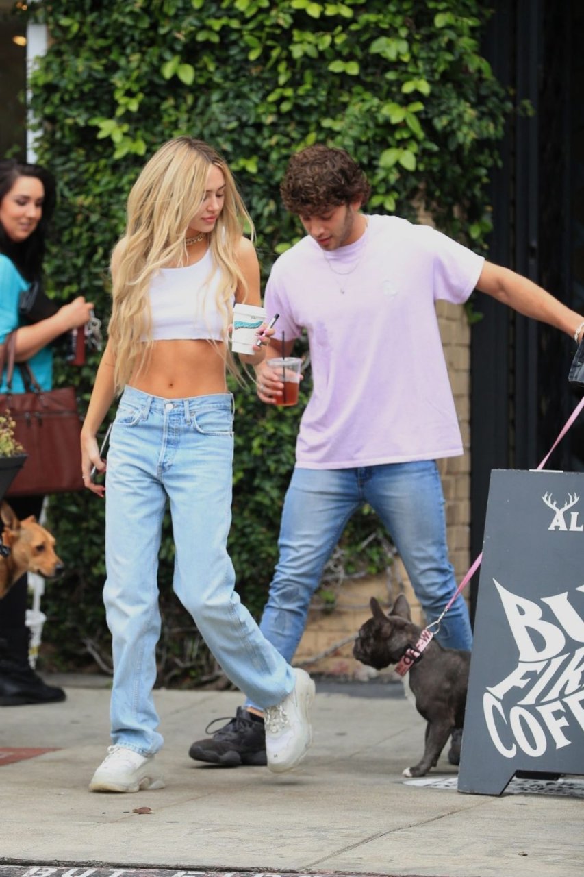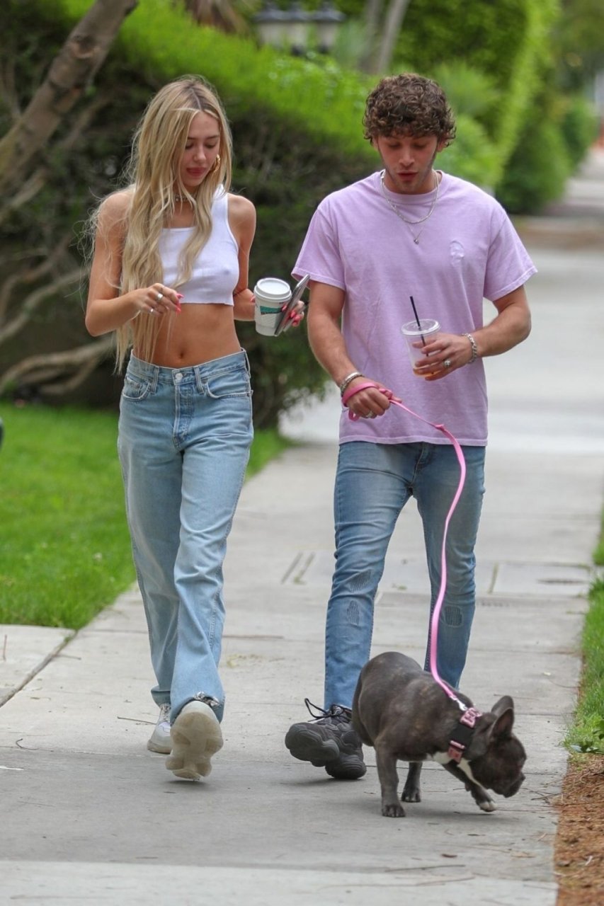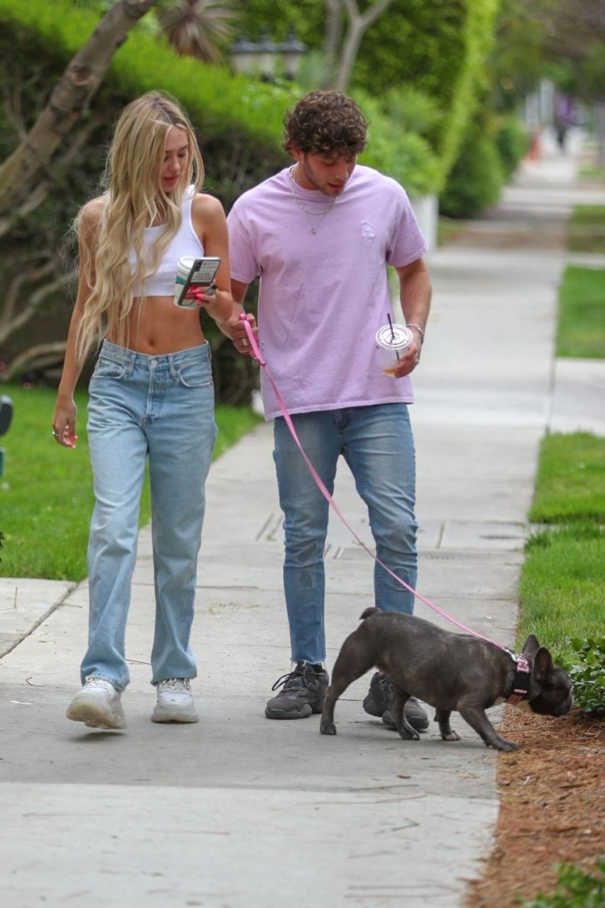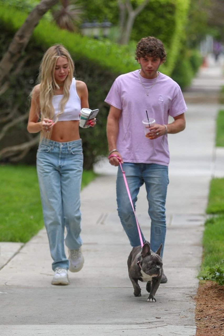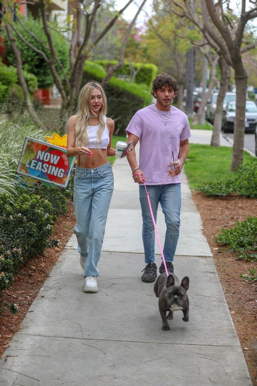Модель Делайла Белль Хэмлин (20) без бюстгальтера и её партнёр Калли Смоллер наслаждаются завтраком в компании своего французского бульдога.