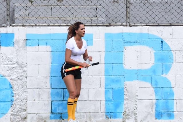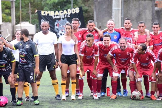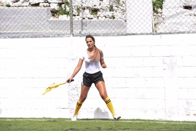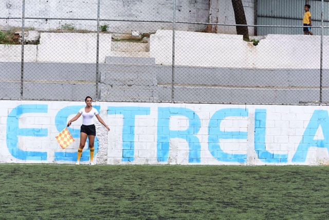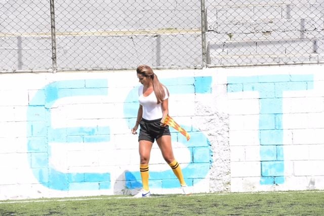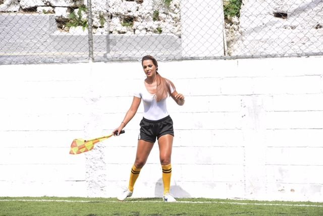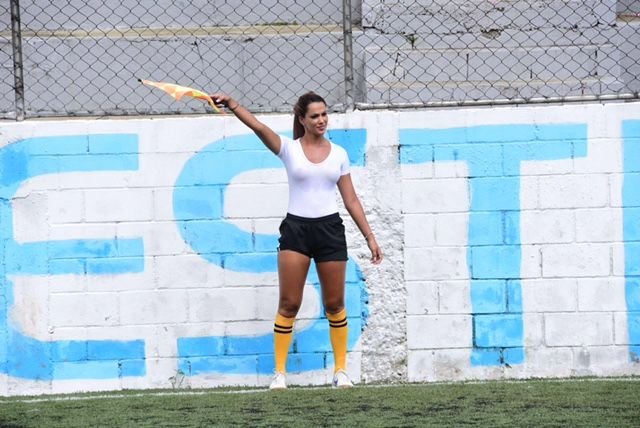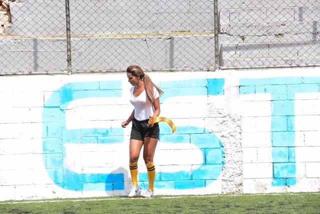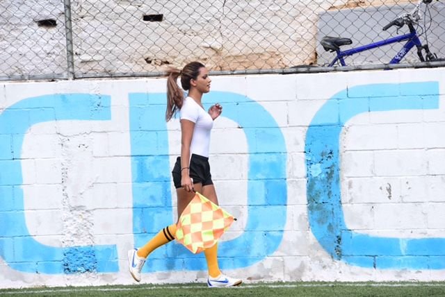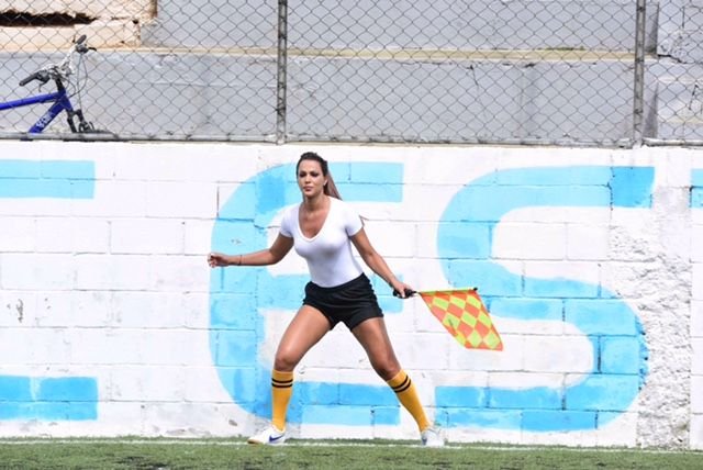 Безбюстгальтерная бразильская ассистентка судьи Дениз Буэно в очень обтягивающей белой футболке на матче Воскресной лиги в Сан-Паулу, 17.04.2017. Это хороший опыт для главных лиг!