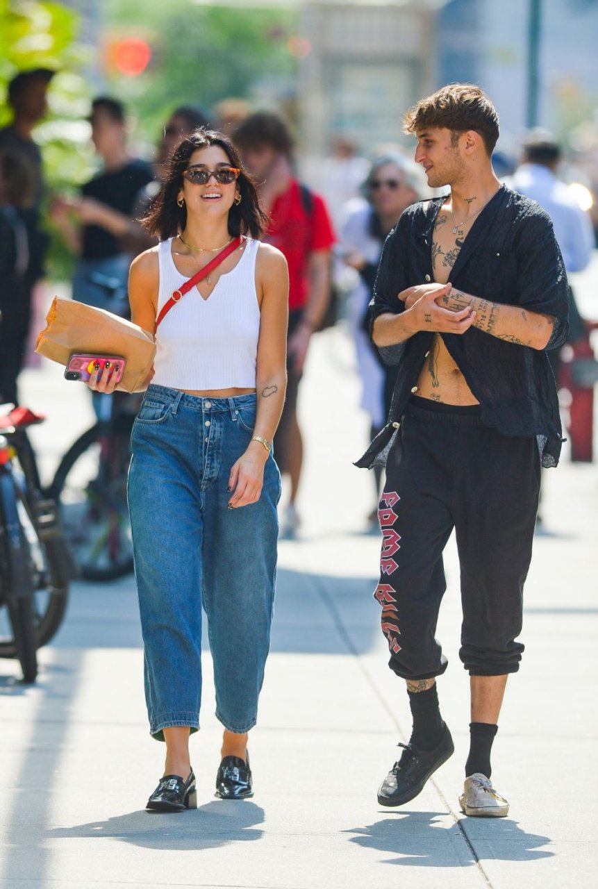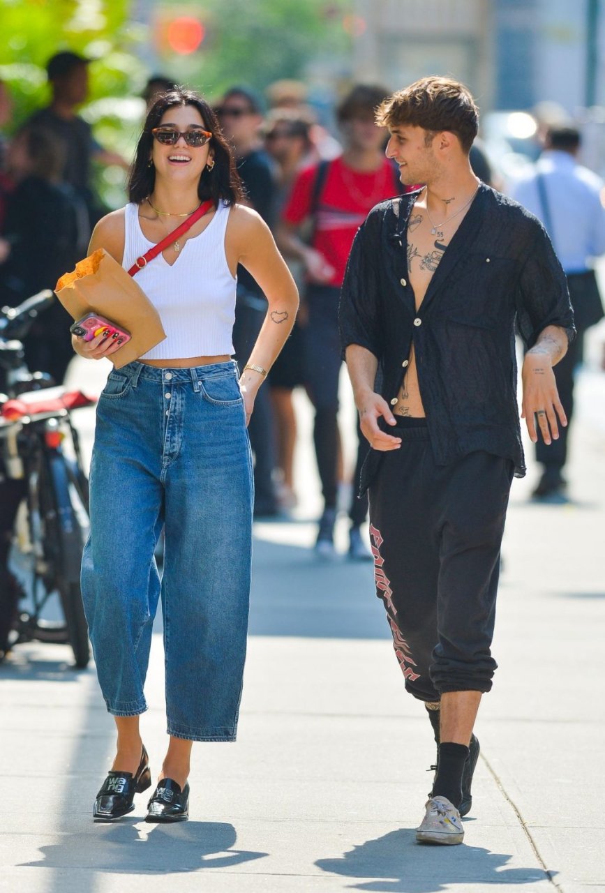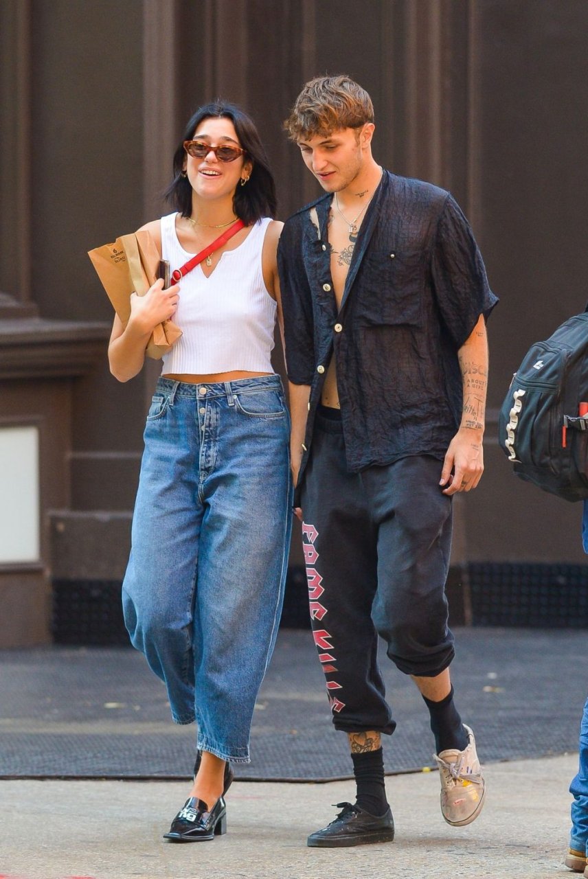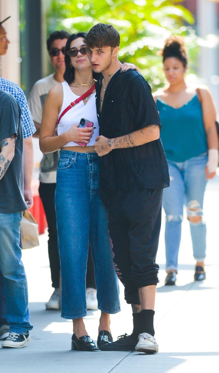 Dua Lipa и Анвар Хадид демонстрируют публичные проявления чувств в Нью-Йорке, 11.09.2019. 24-летняя певица была одета в белый укороченный топ с оголённым животом, в сочетании с джинсами с широкими штанинами и лоферами из лакированной кожи. 20-летняя модель носила расстёгнутую чёрную рубашку, чёрные спортивные штаны и две разные пары обуви.
