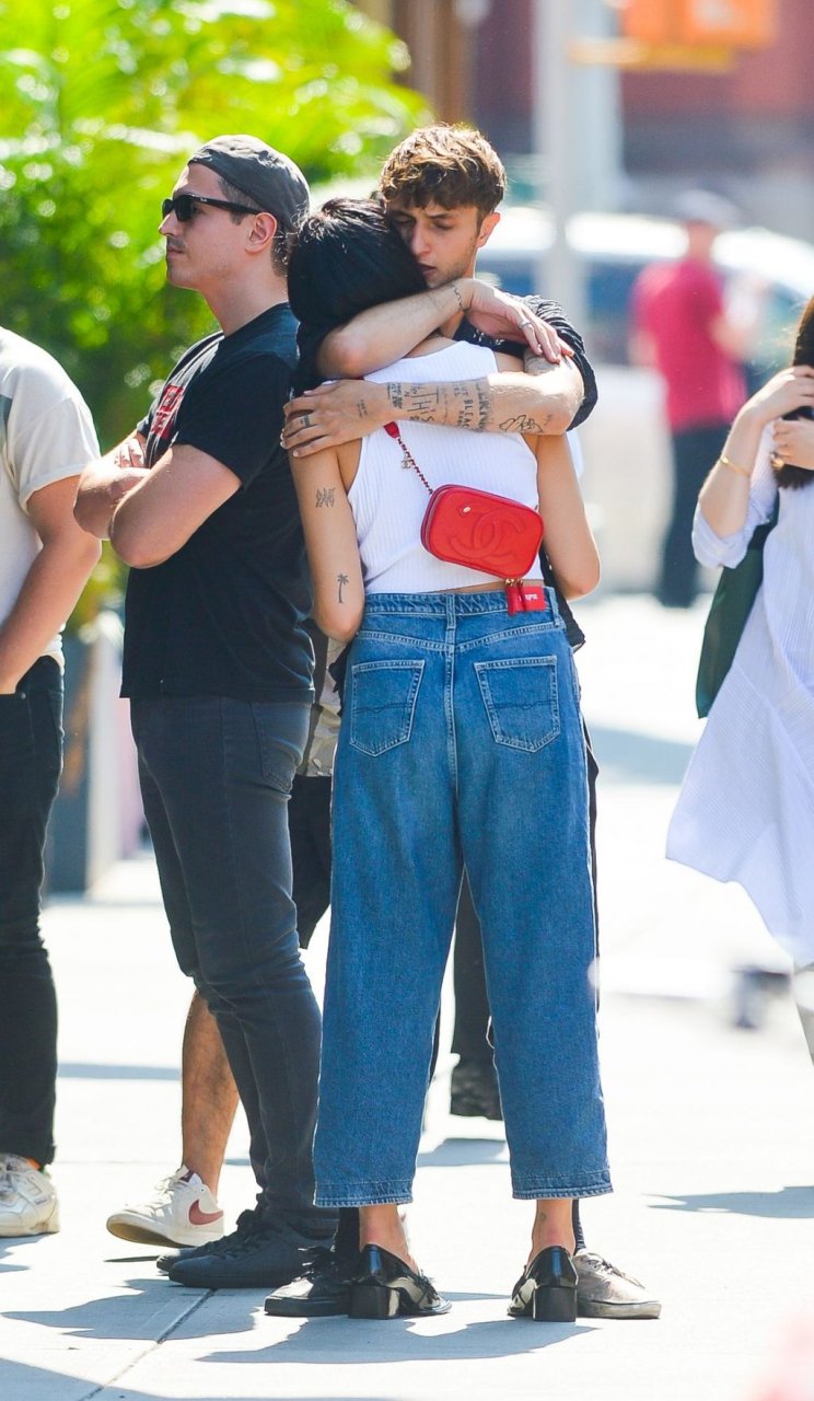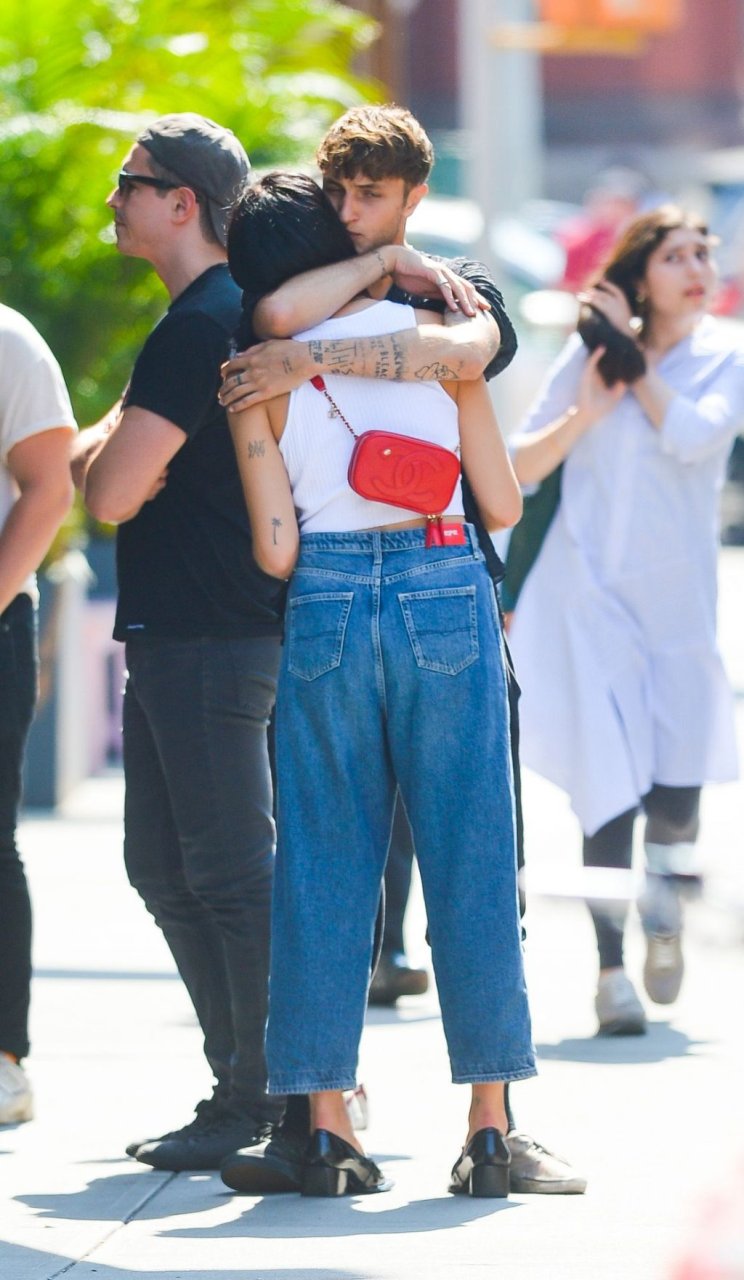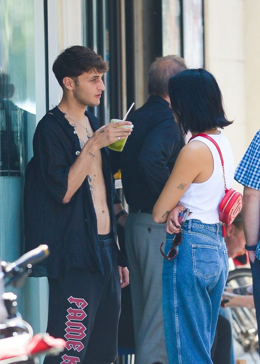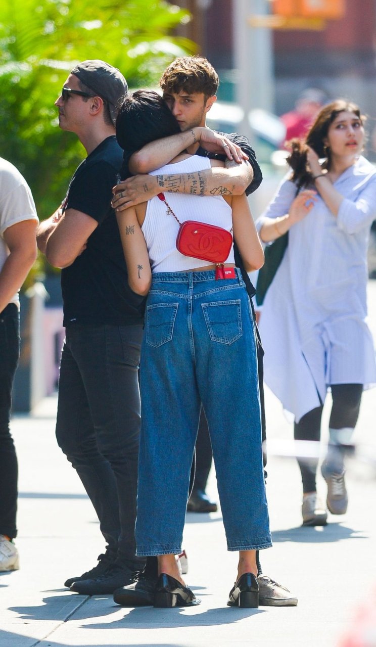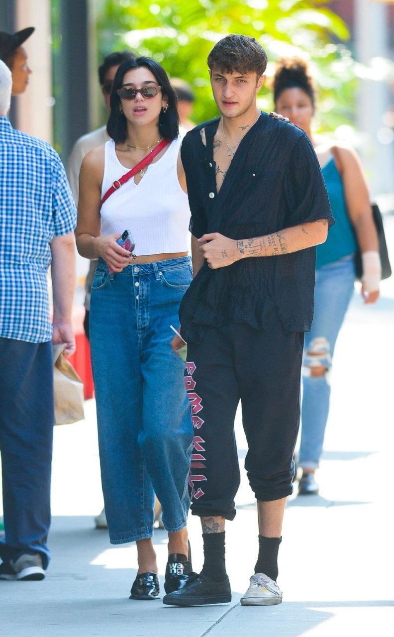 Dua Lipa и Анвар Хадид демонстрируют публичные проявления чувств в Нью-Йорке, 11.09.2019. 24-летняя певица была одета в белый укороченный топ с оголённым животом, в сочетании с джинсами с широкими штанинами и лоферами из лакированной кожи. 20-летняя модель носила расстёгнутую чёрную рубашку, чёрные спортивные штаны и две разные пары обуви.