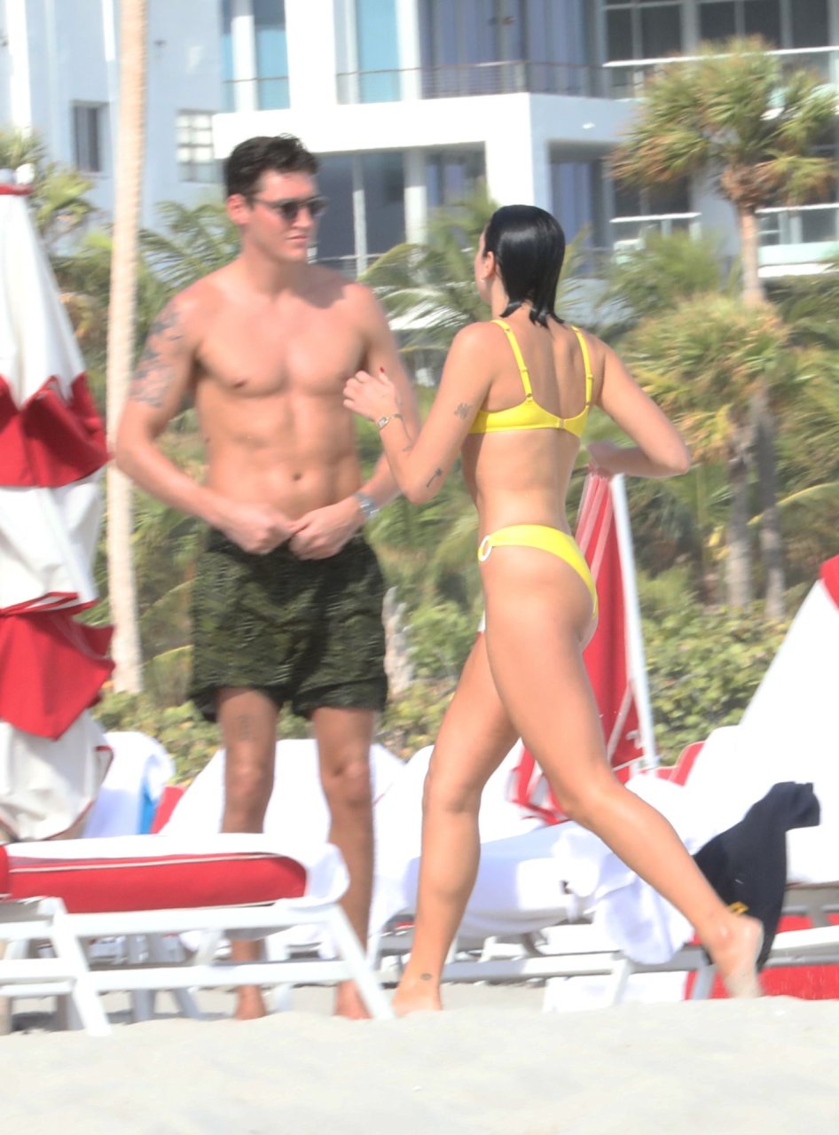 Певица Дуа Липа (23) в желтом бикини купается в океане вместе со своей сестрой Риной (17) в Майами, 31.12.2018. Затем она приветствует своего парня на песке,