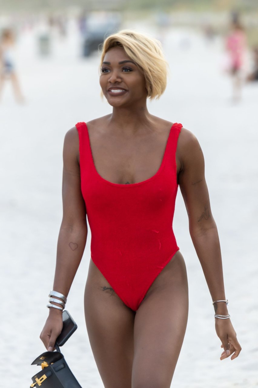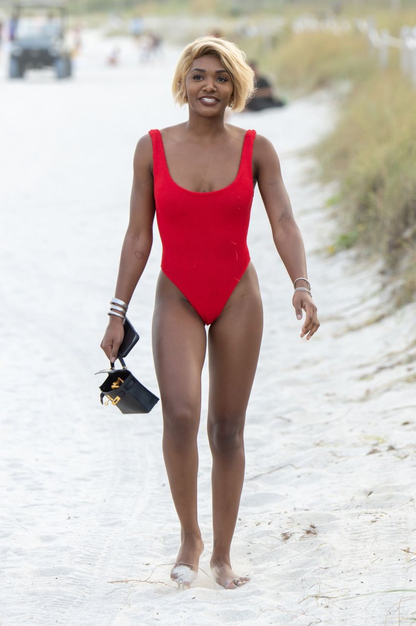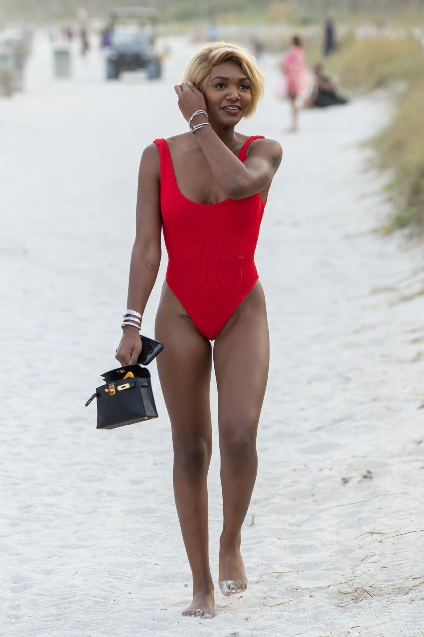Дочь Мэджика Джонсона Элиса (24) была замечена в ярко-красном купальнике на пляже Майами, 01.01.2019.