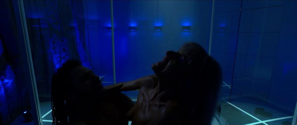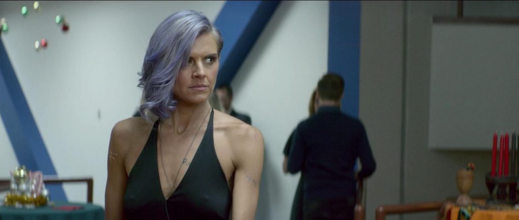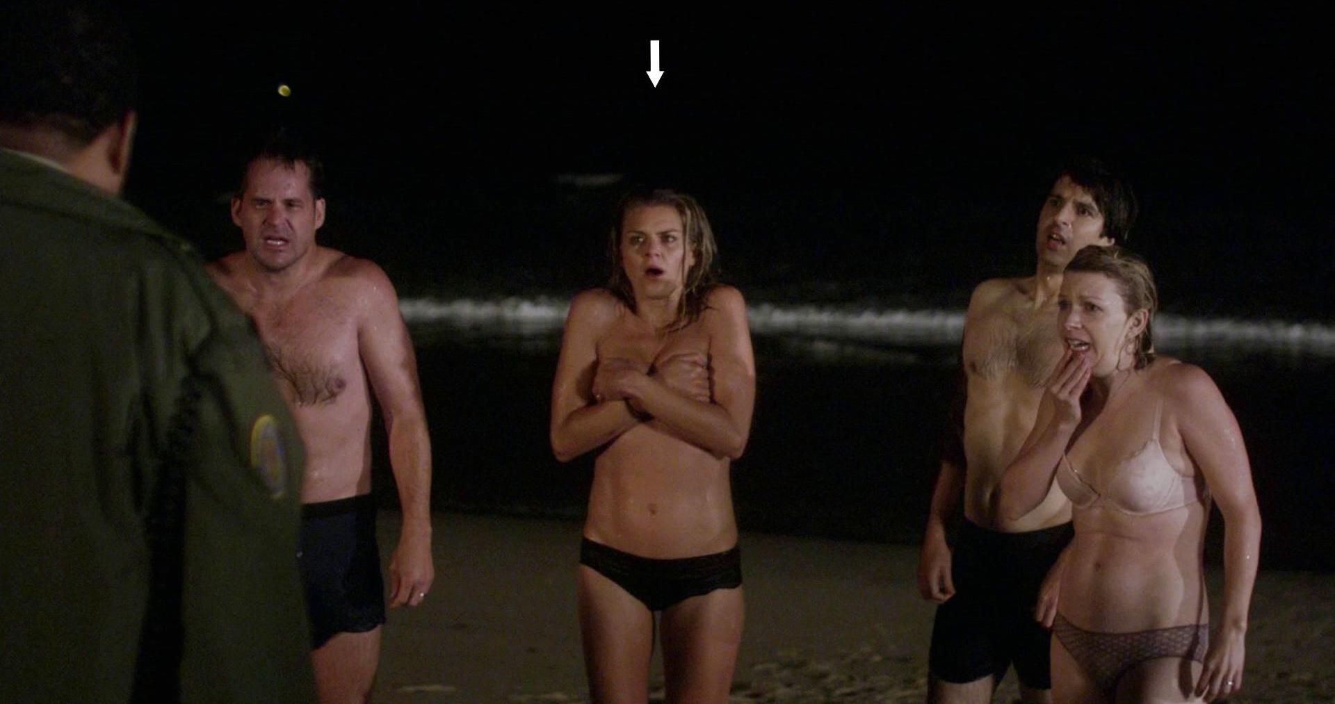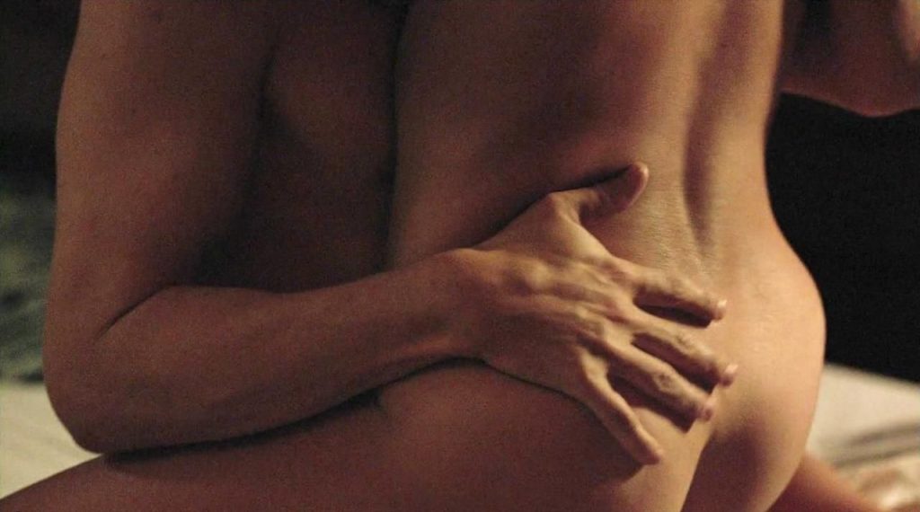 Eliza Coupe is having sex with a guy on the edge of a bed, naked in his lap as she rides him and we see her breasts and butt. She then dismounts and walks into another room naked to talk to a different guy. We see more of her breasts when she turns around and walks back to the bed, where she sits next to the first guy and wraps herself with the covers.