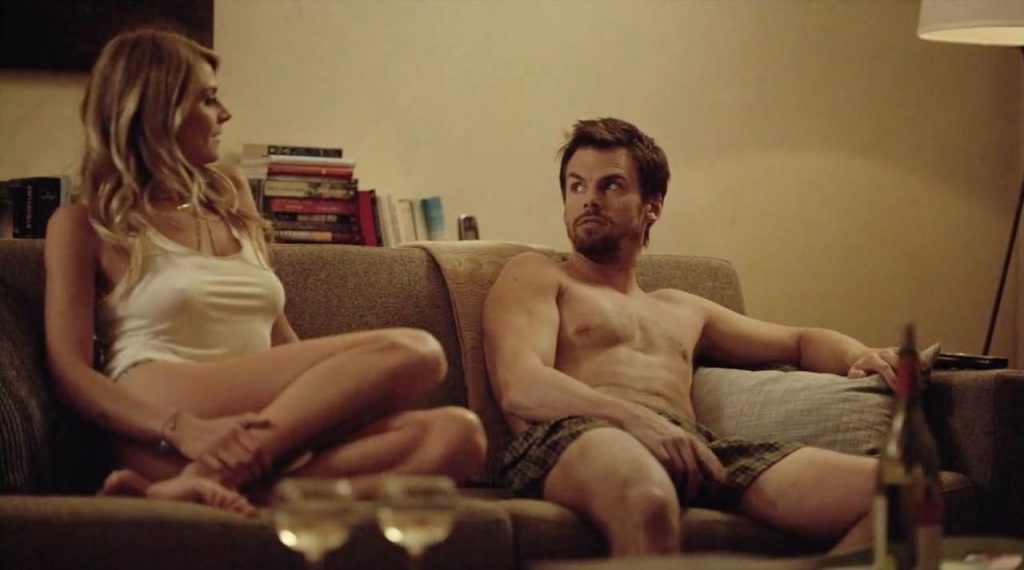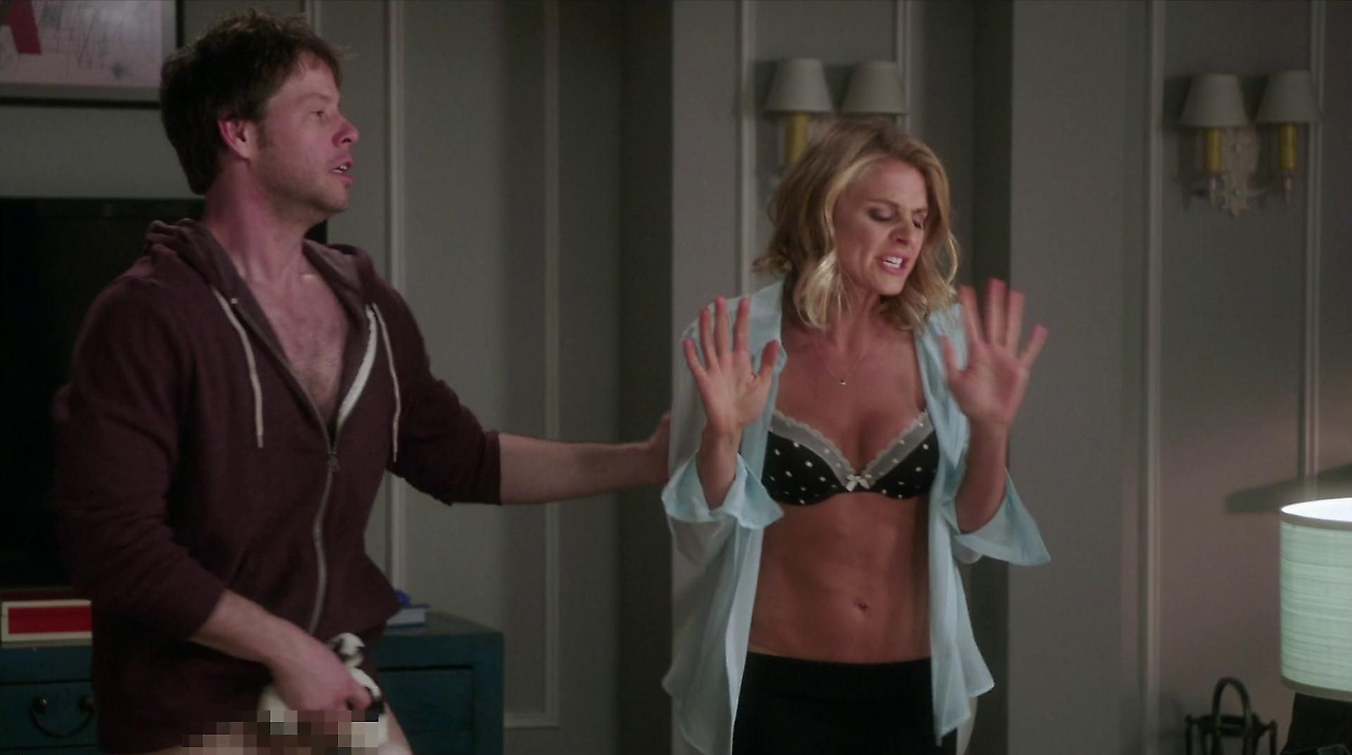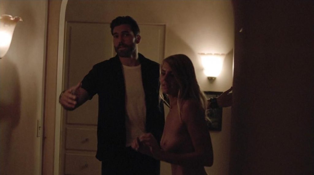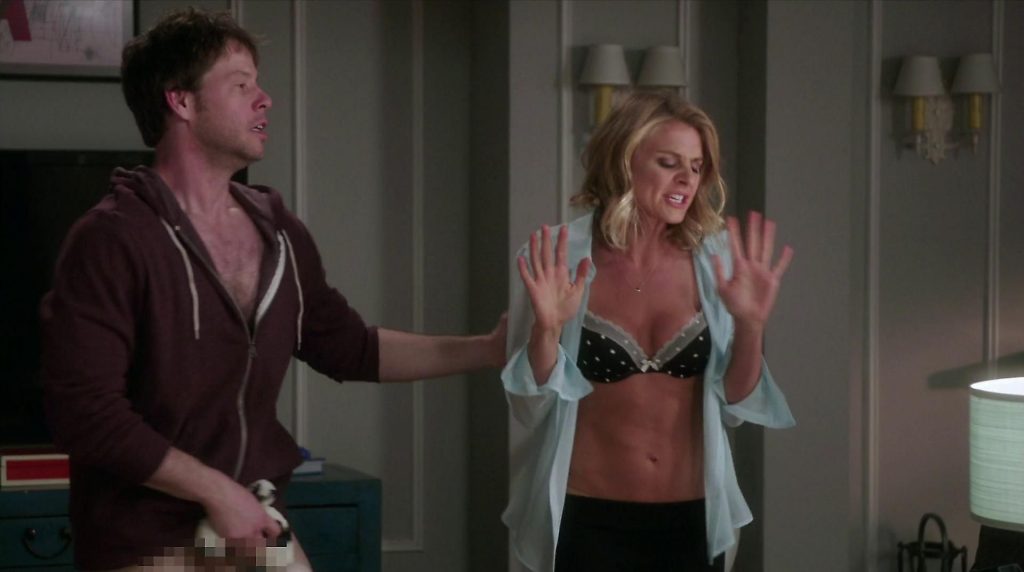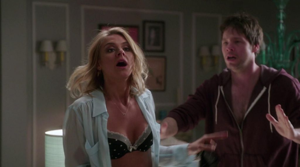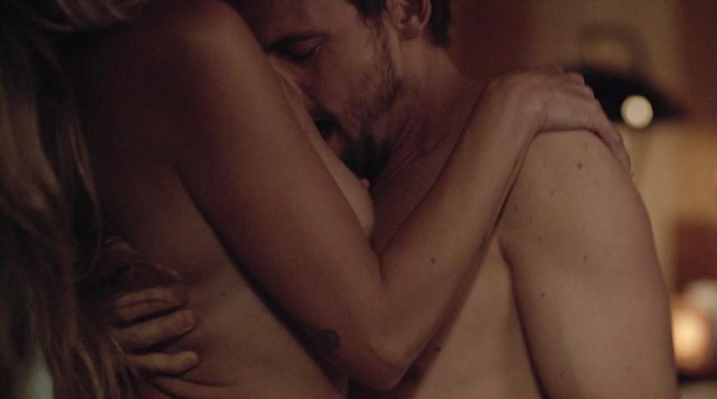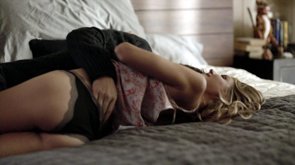 Eliza is seen having sex with a guy in a montage where we see her wearing a white tank top that lets her left nipple peek out into view when she is on her back. This alternates with footage of Eliza in the same tank top kissing the guy, this time with some pink panties on.