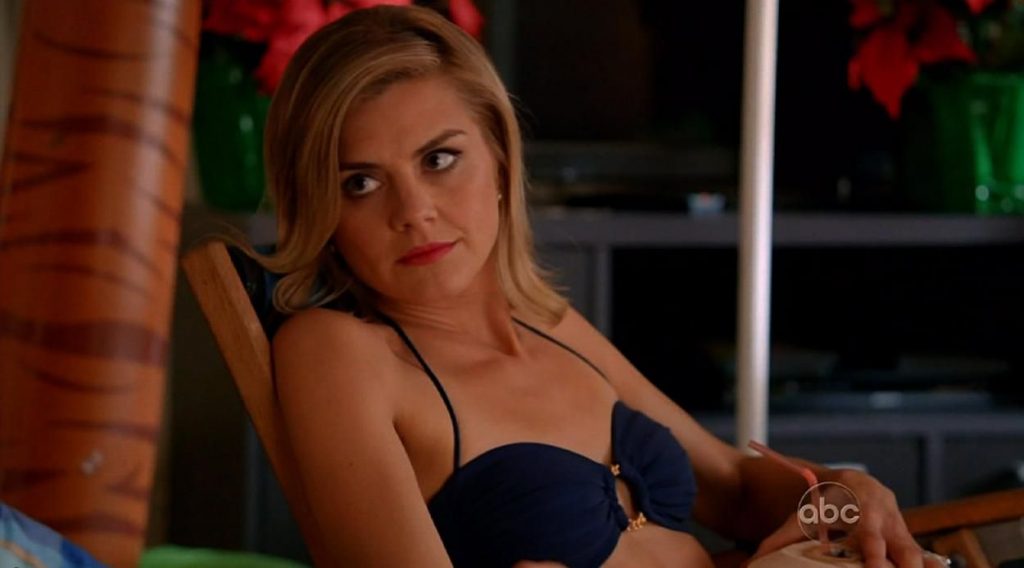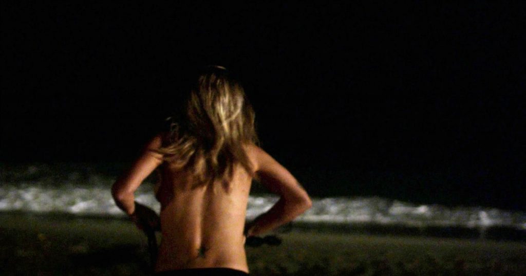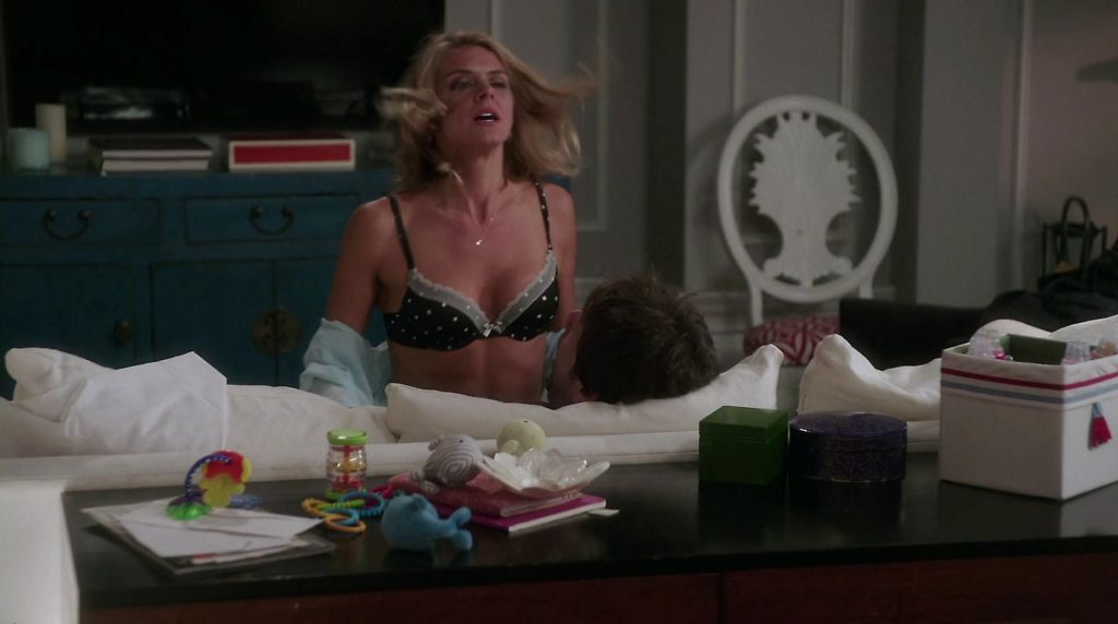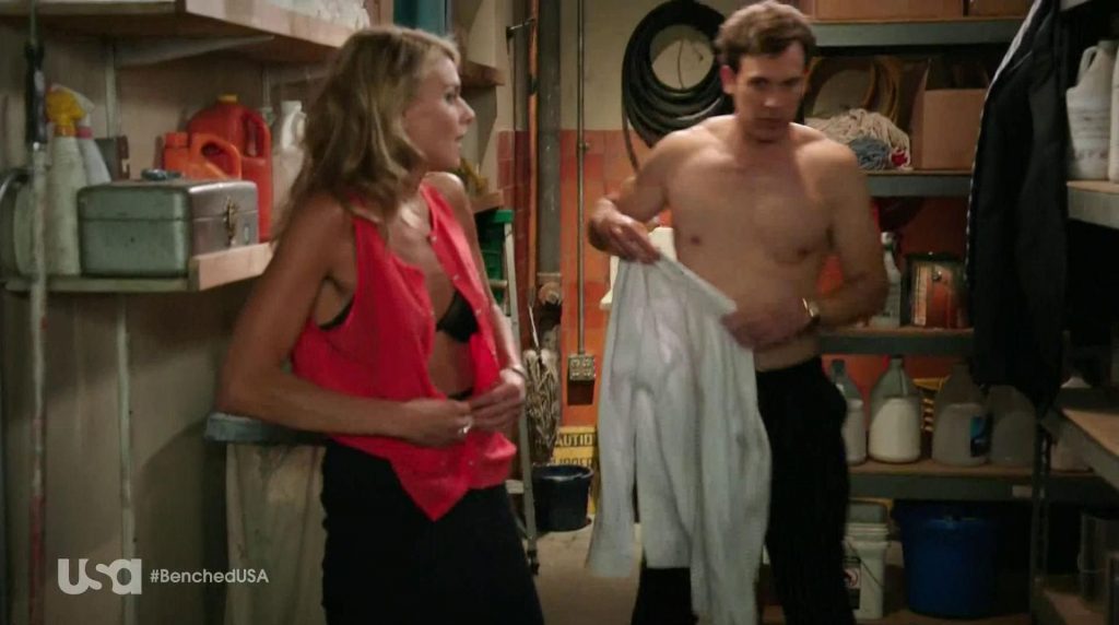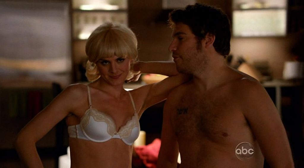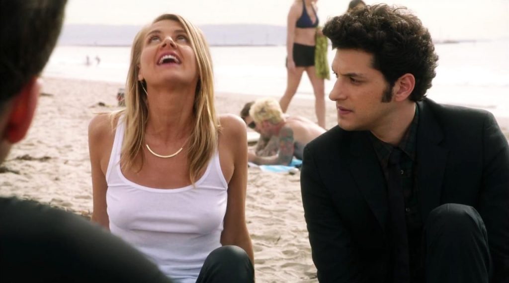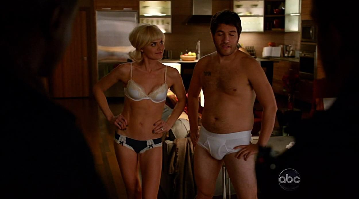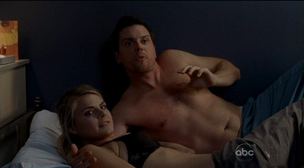 Eliza is seen having sex with a guy in a montage where we see her wearing a white tank top that lets her left nipple peek out into view when she is on her back. This alternates with footage of Eliza in the same tank top kissing the guy, this time with some pink panties on.
