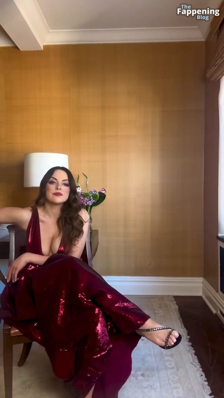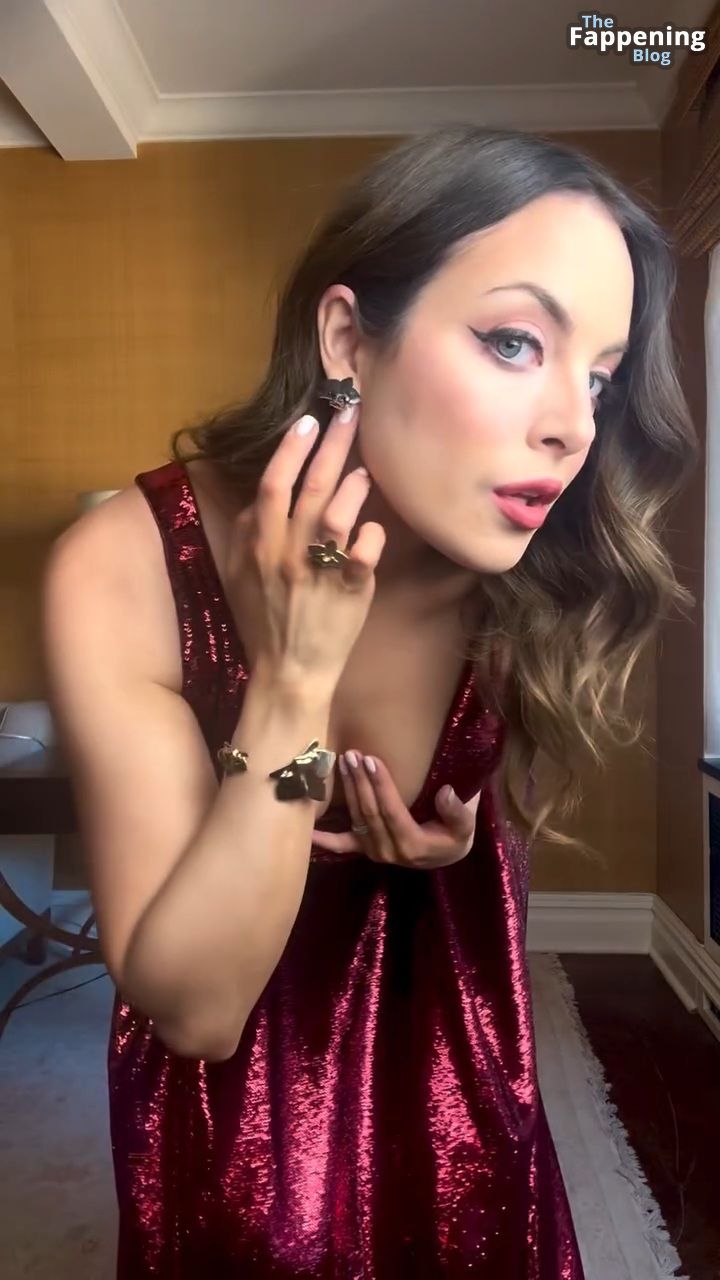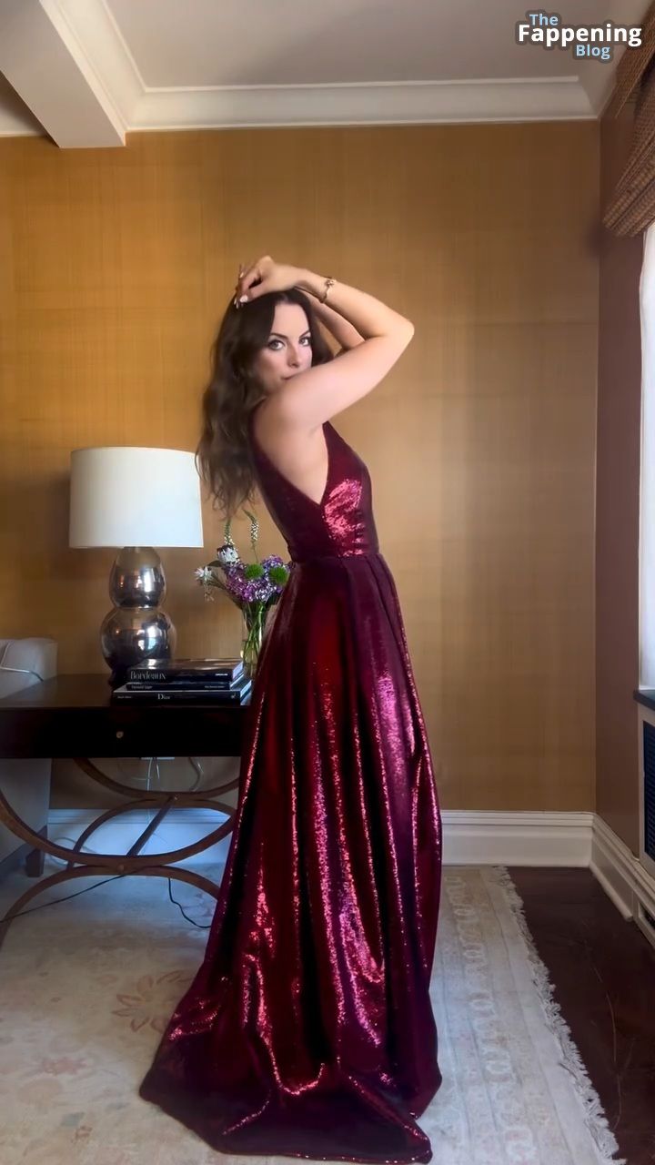 Элизабет Гиллис без бюстгальтера, демонстрирует глубокое декольте, наклоняется в своей комнате, рассматривает своё сексуальное платье.