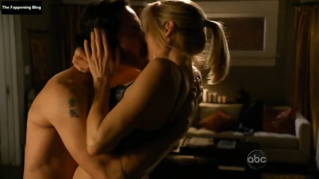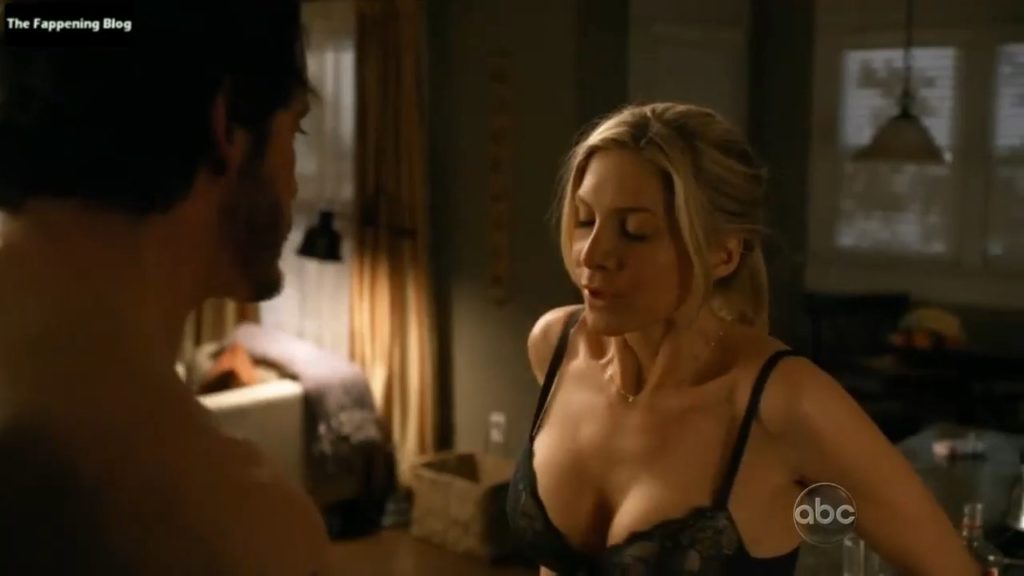 Элизабет Митчелл целуется с парнем и стягивает с него рубашку, прежде чем он делает то же с ней, открывая красивое декольте Элизабет в её бюстгальтере.