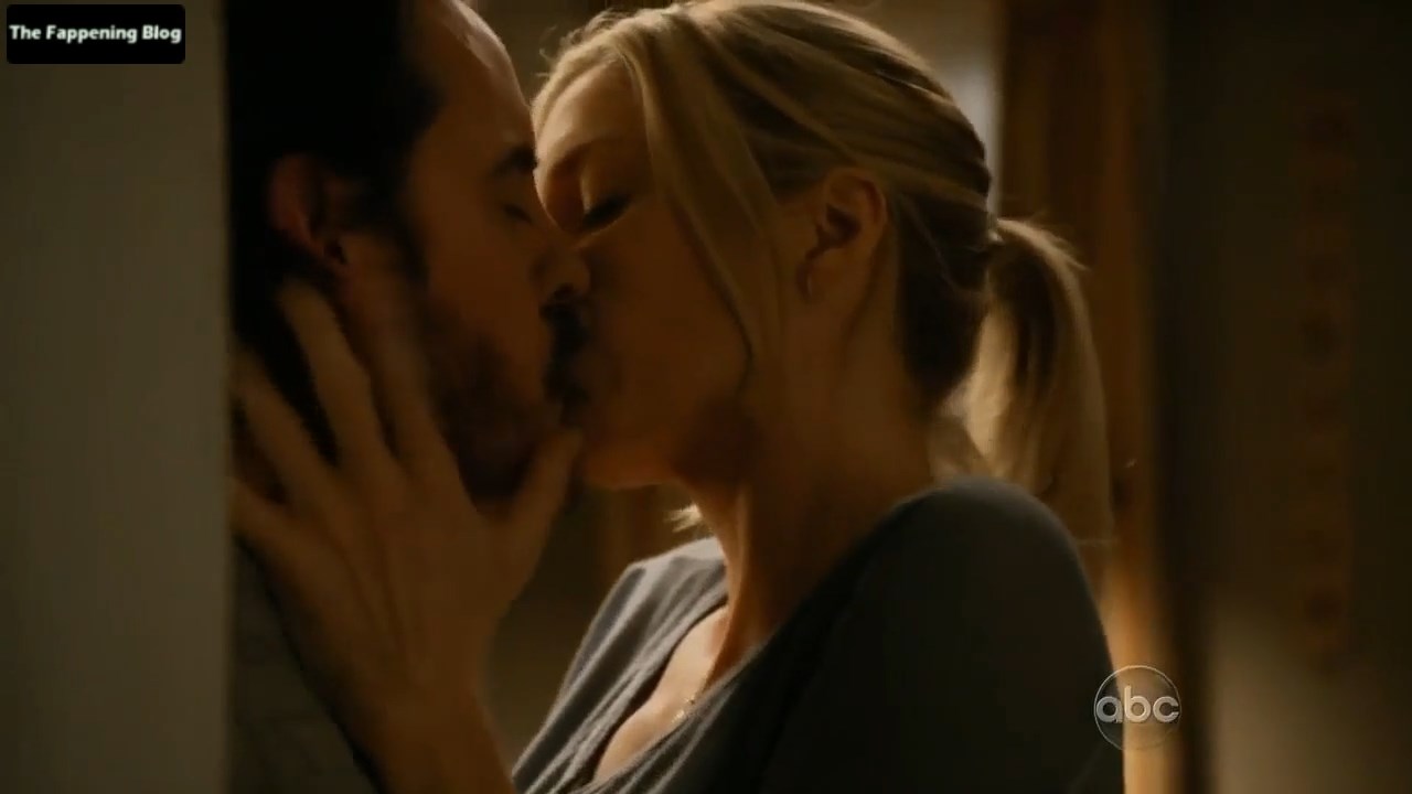 Элизабет Митчелл целуется с парнем и стягивает с него рубашку, прежде чем он делает то же с ней, открывая красивое декольте Элизабет в её бюстгальтере.