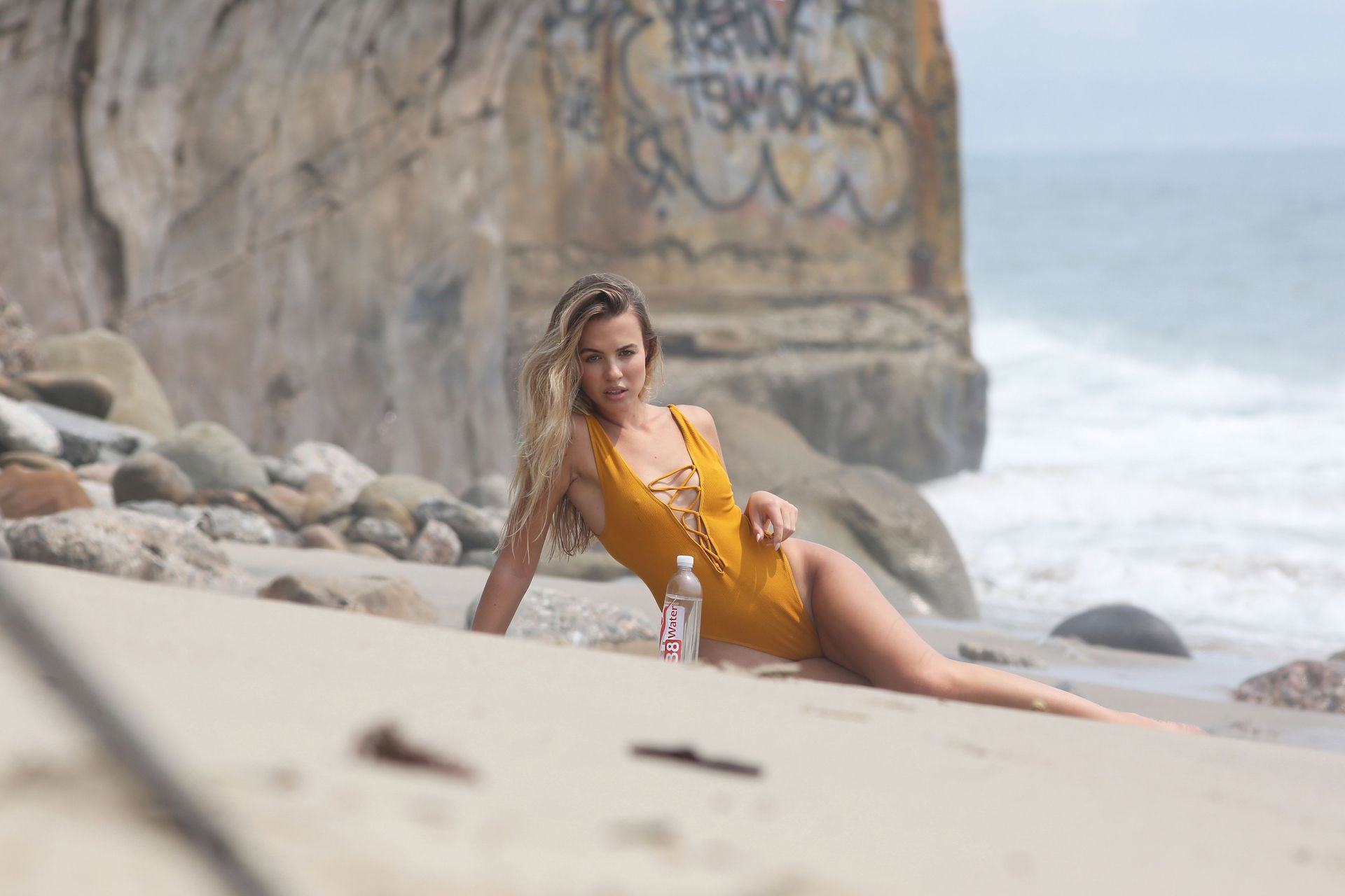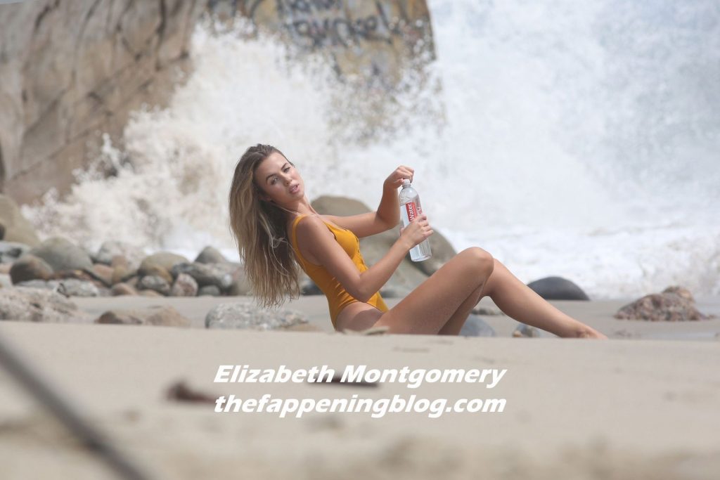 Модель Элизабет Монтгомери эффектно смотрится в кожаной куртке в сочетании с цельным купальником и федорой на съемочной площадке последней фотосессии 138 Water в Малибу, 26.08.2020.