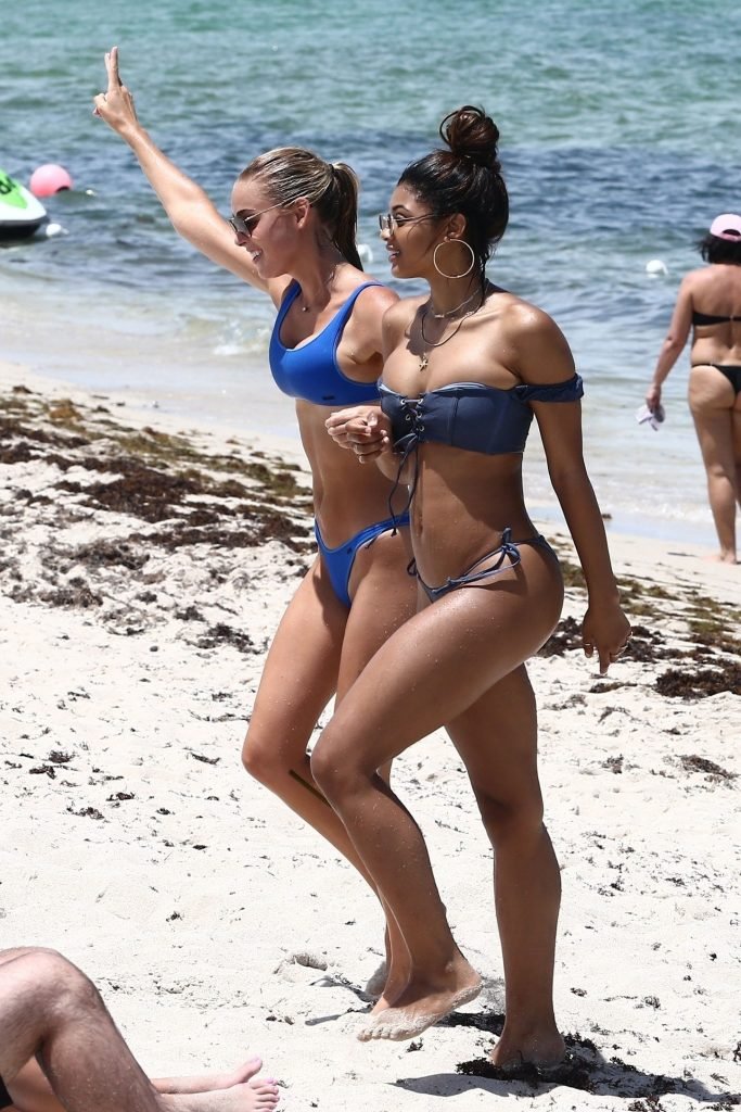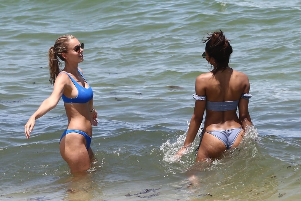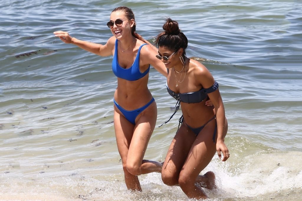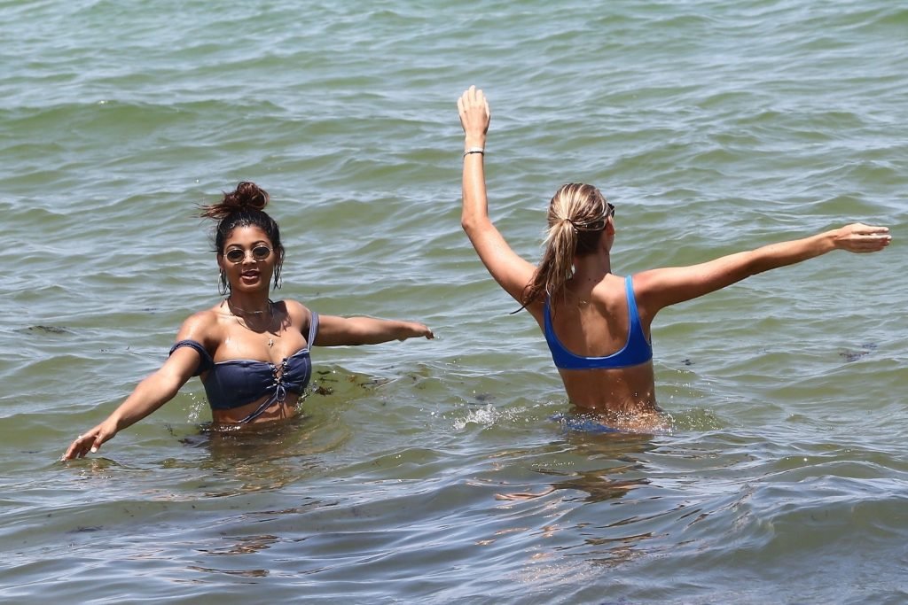 Модель Элизабет Тернер (25) наслаждается днем на пляже со своей подругой, 16.07.2018. Пара выглядит так, будто отлично проводит время, окунаясь в прохладные голубые воды Майами.