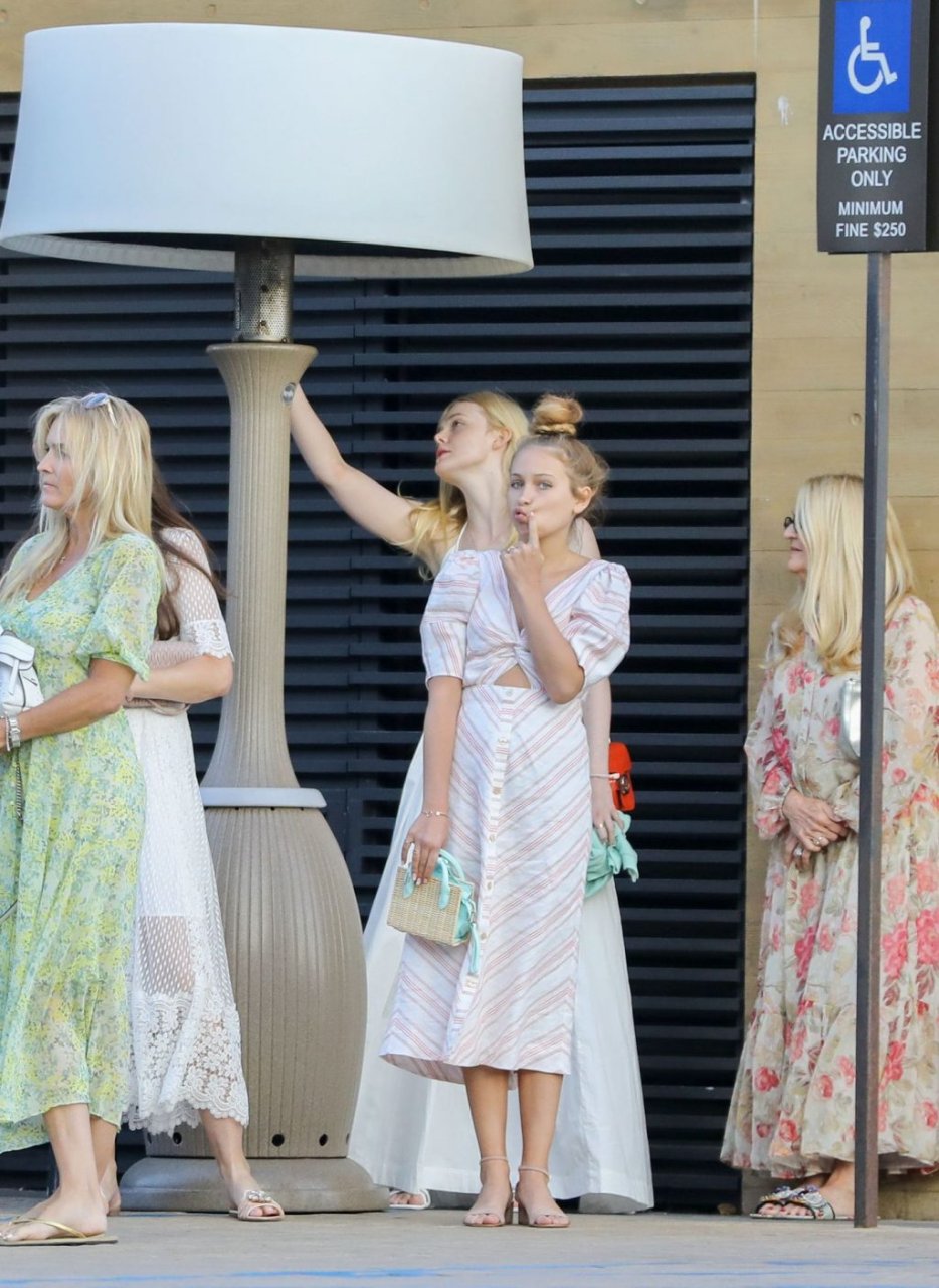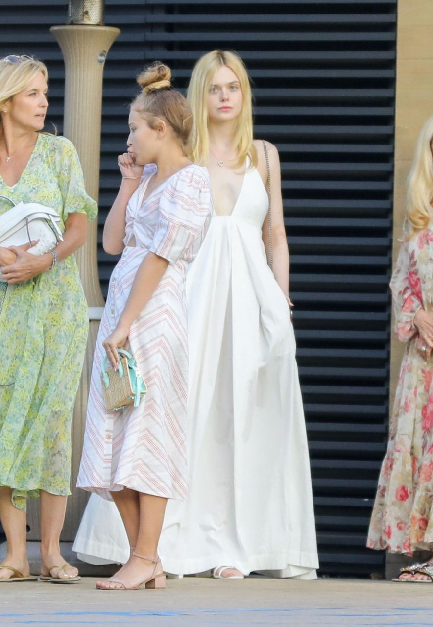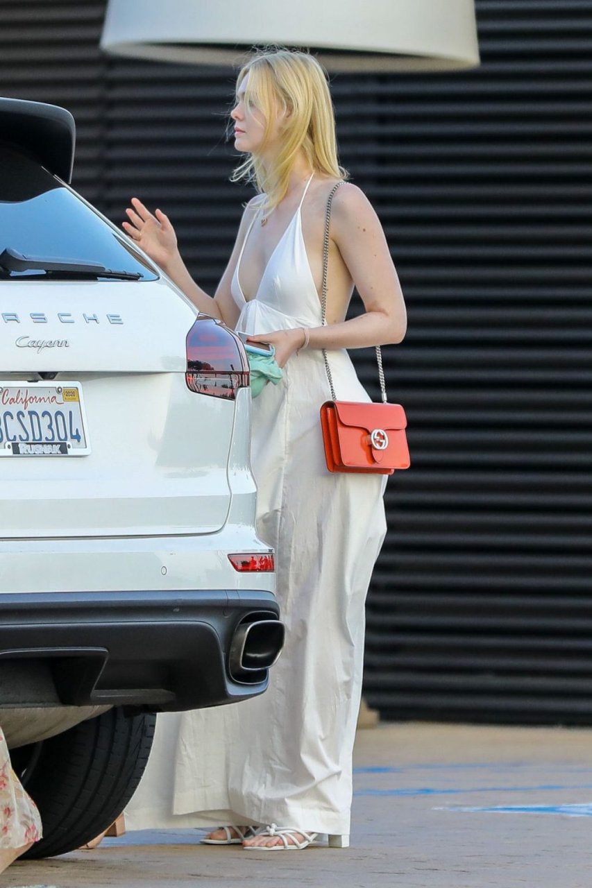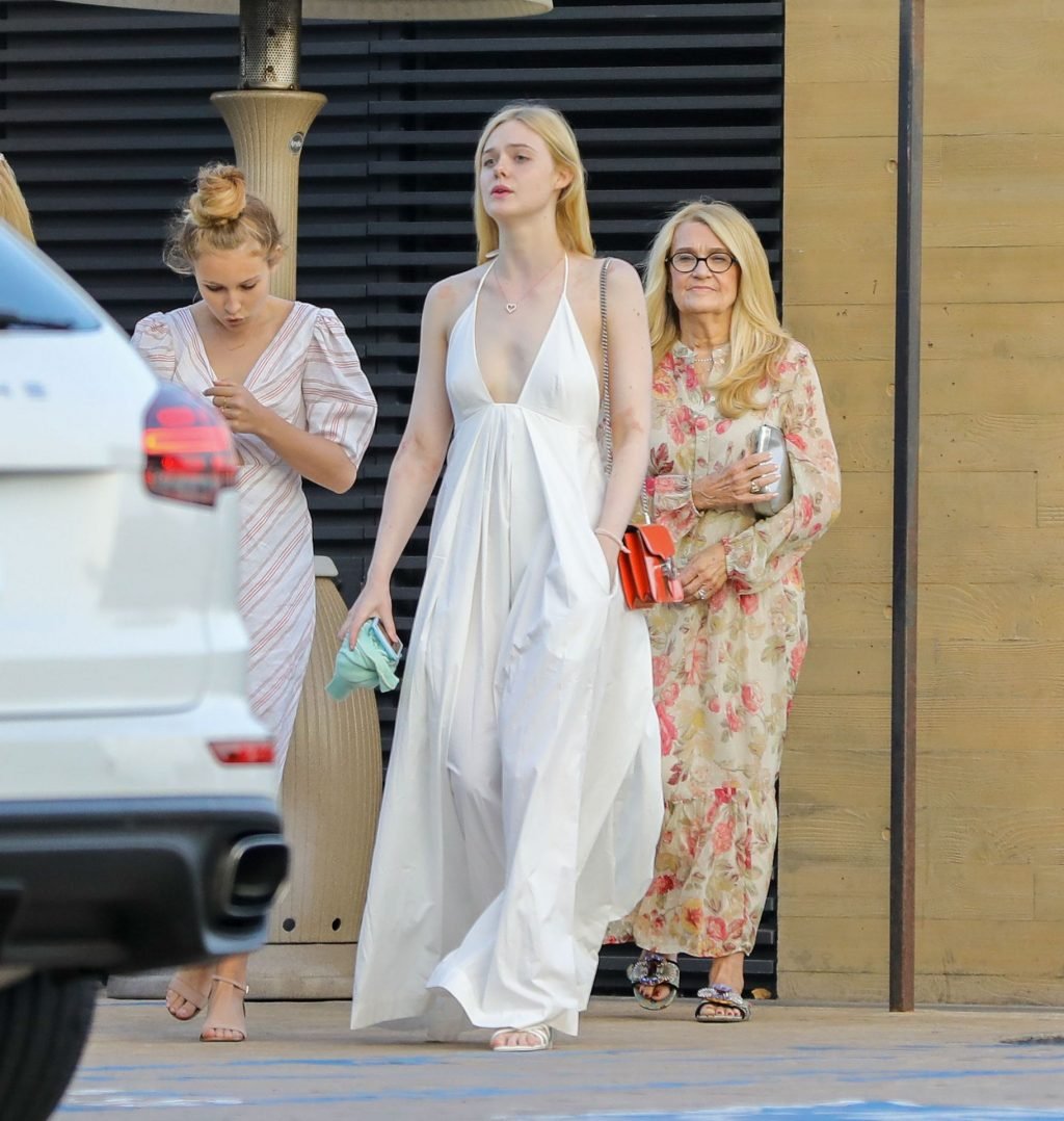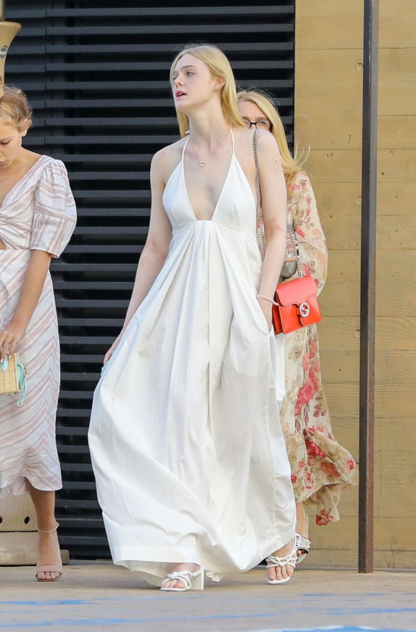 Элль Фэннинг без бюстгальтера в белом наряде привлекла внимание в Nobu, Малибу, 16.06.2019. Может показаться, что видны её соски, но нет. Её грудь слишком маленькая.