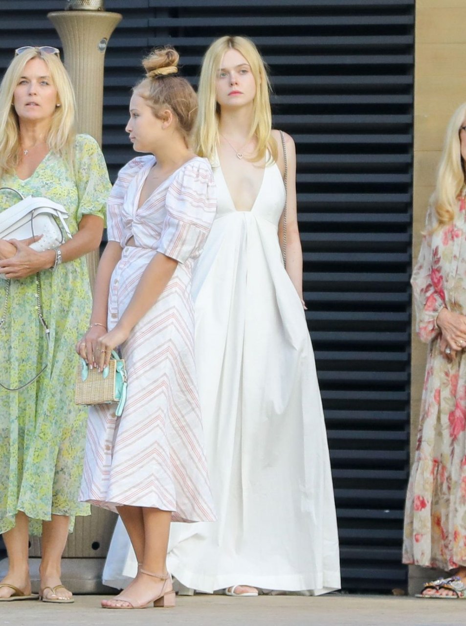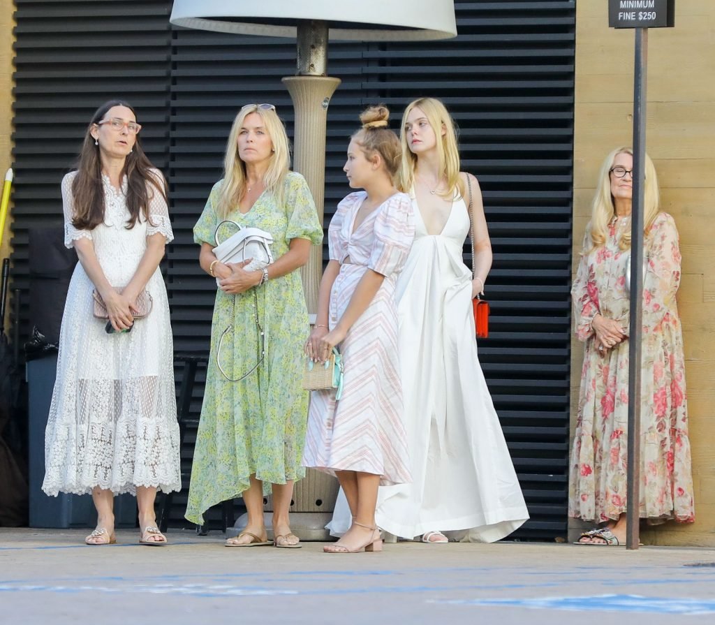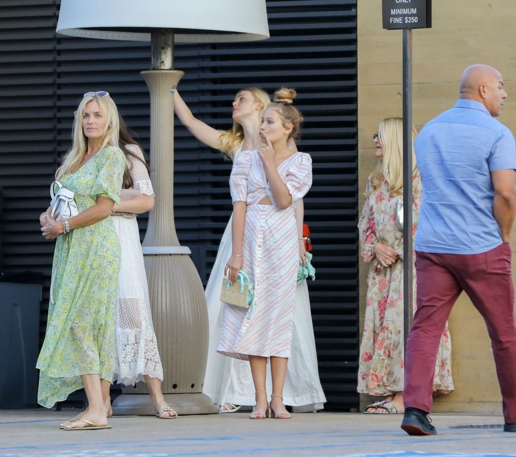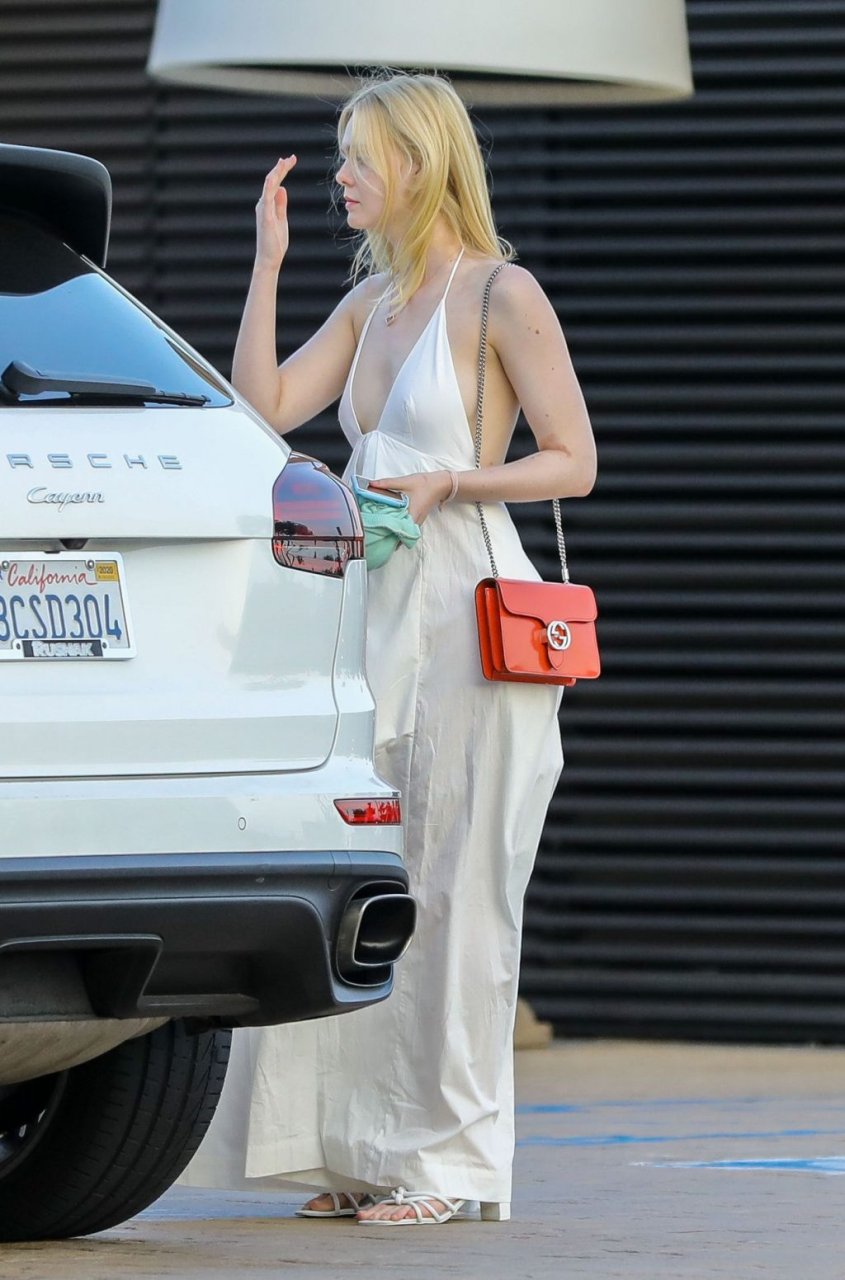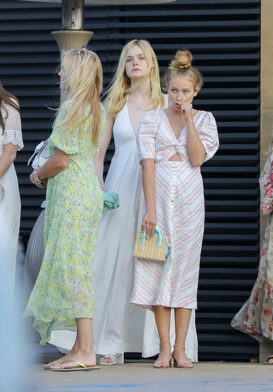 Элль Фэннинг без бюстгальтера в белом наряде привлекла внимание в Nobu, Малибу, 16.06.2019. Может показаться, что видны её соски, но нет. Её грудь слишком маленькая.