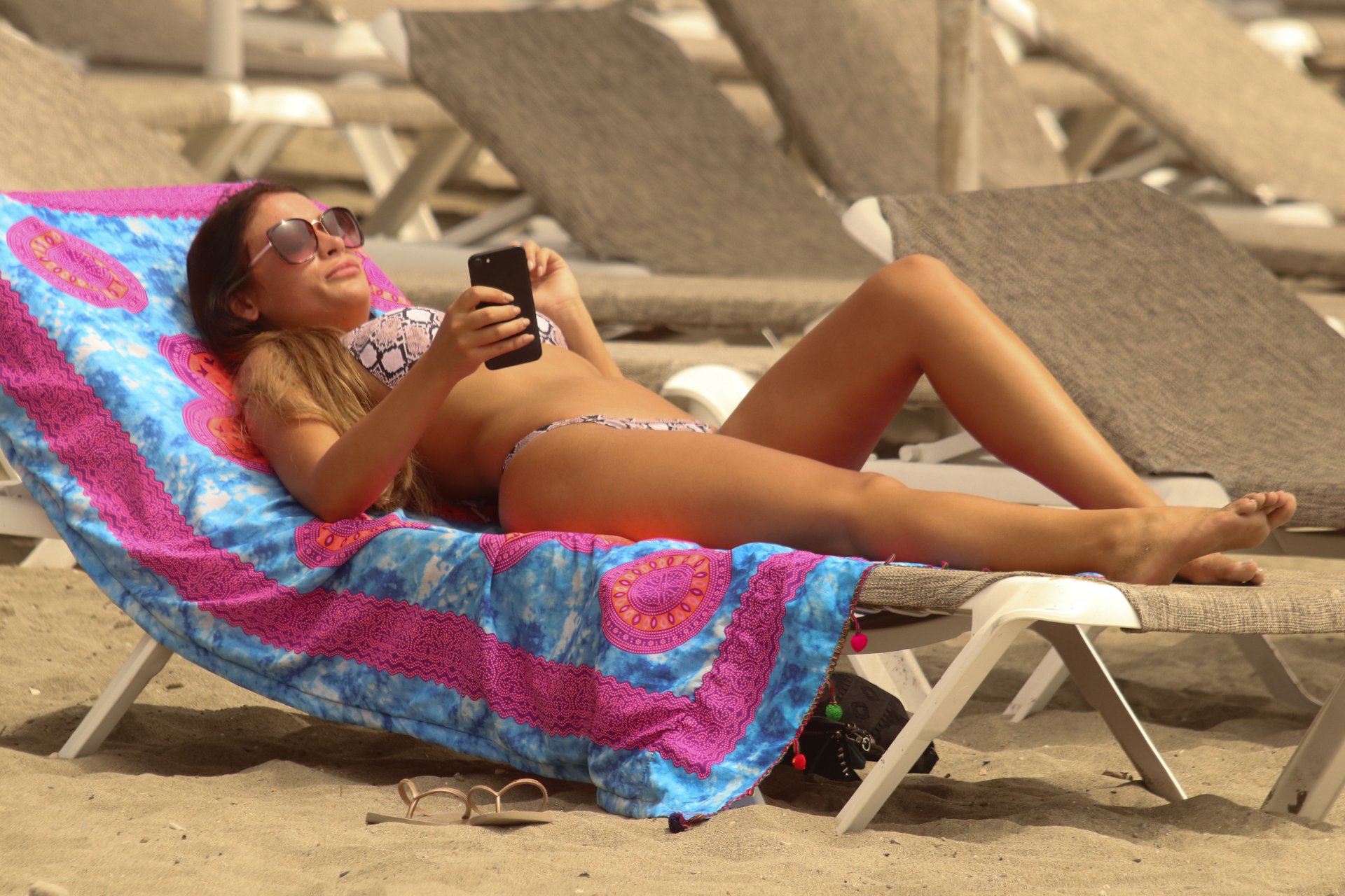 “Участница шоу “Love Island” Элли Джонс была замечена загоравшей в Марбелье, 08/04/2018. Потрясающая красотка продемонстрировала свои сексуальные груди и ягодицы, надев крошечное бикини.