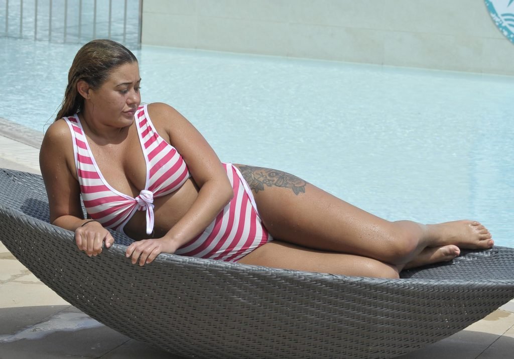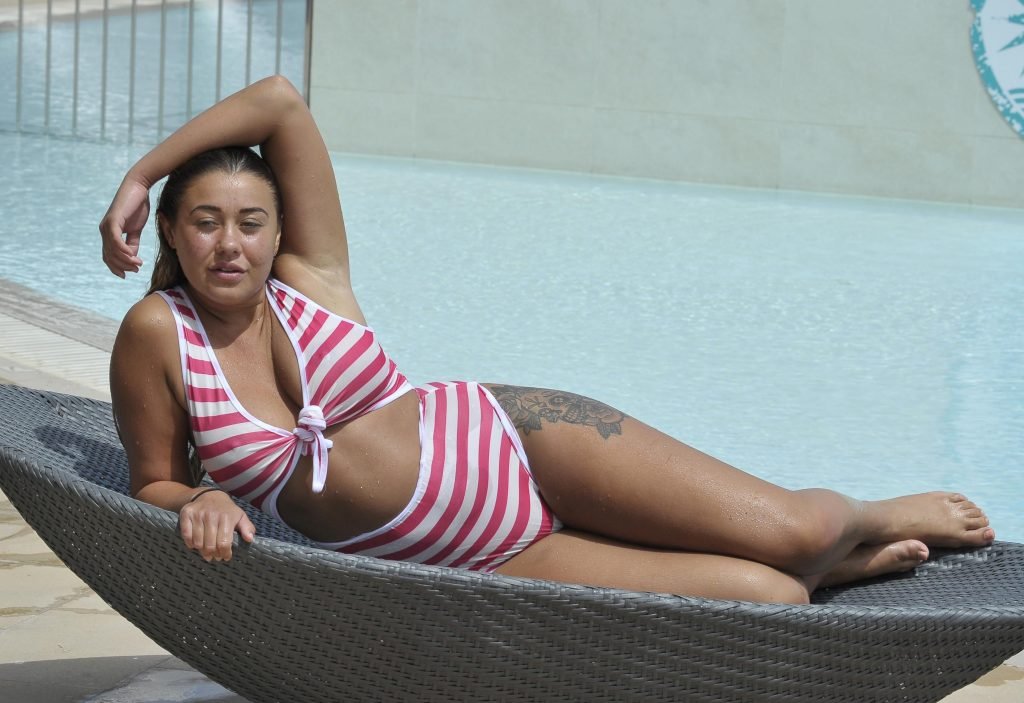 Big Brother’s Элли Янг была замечена в красно-белом бикини, демонстрируя пышные формы у бассейна, наслаждаясь солнцем в Пальме, Испания, 08/04/2018.
