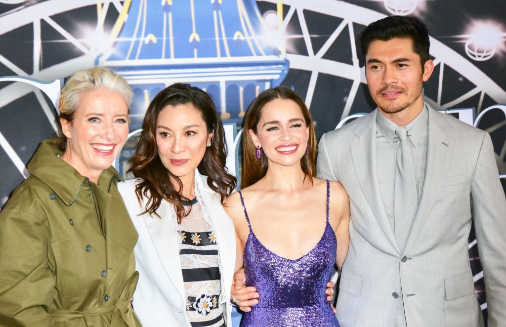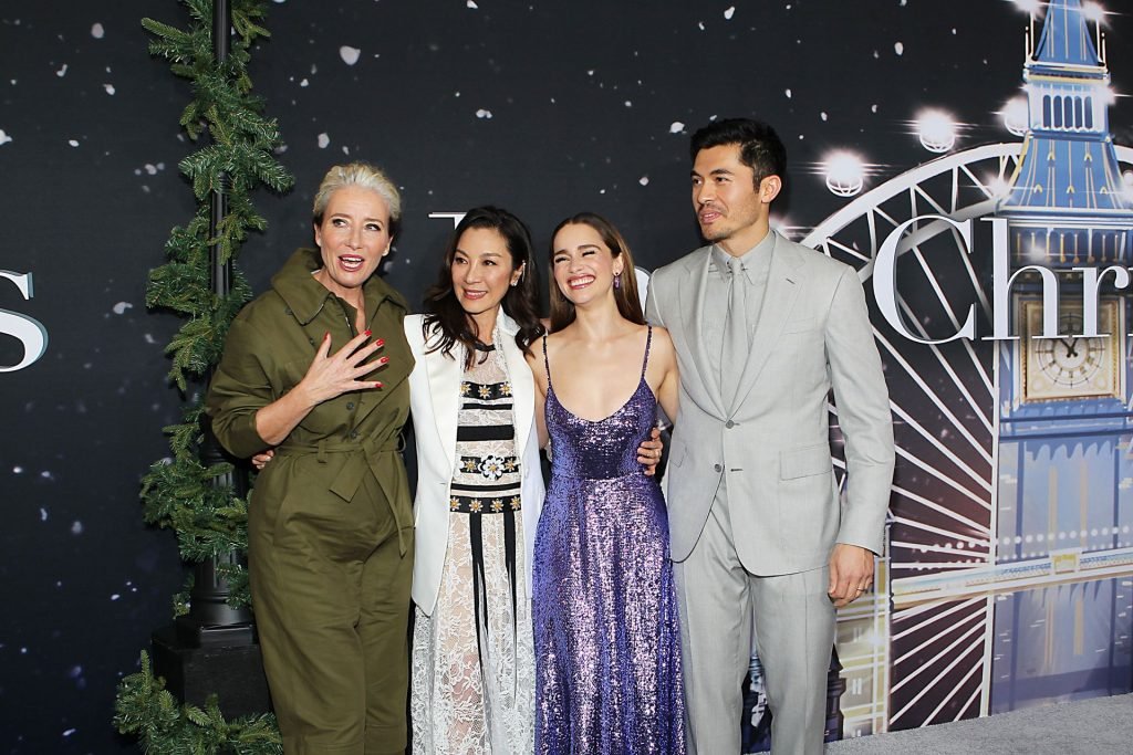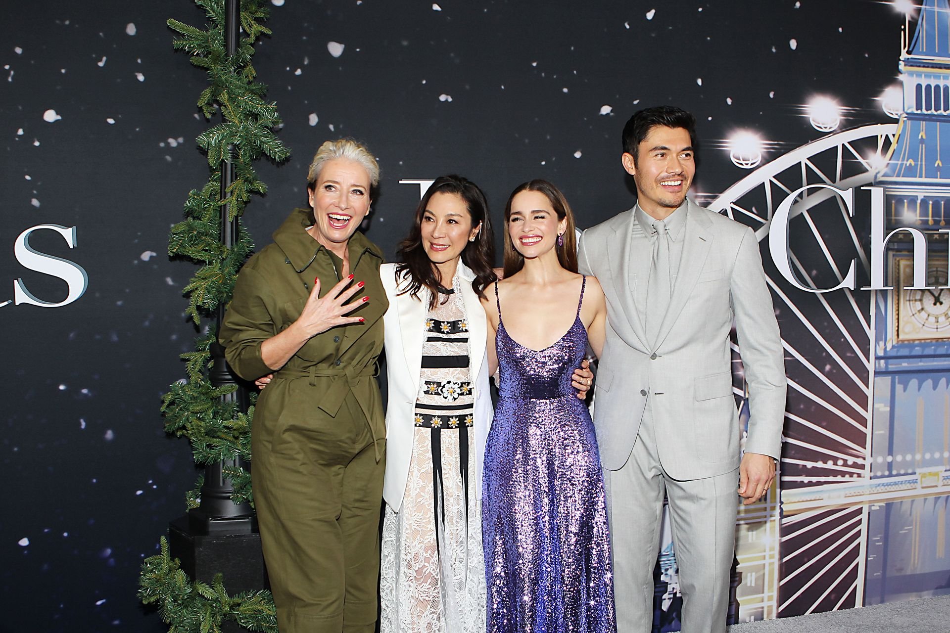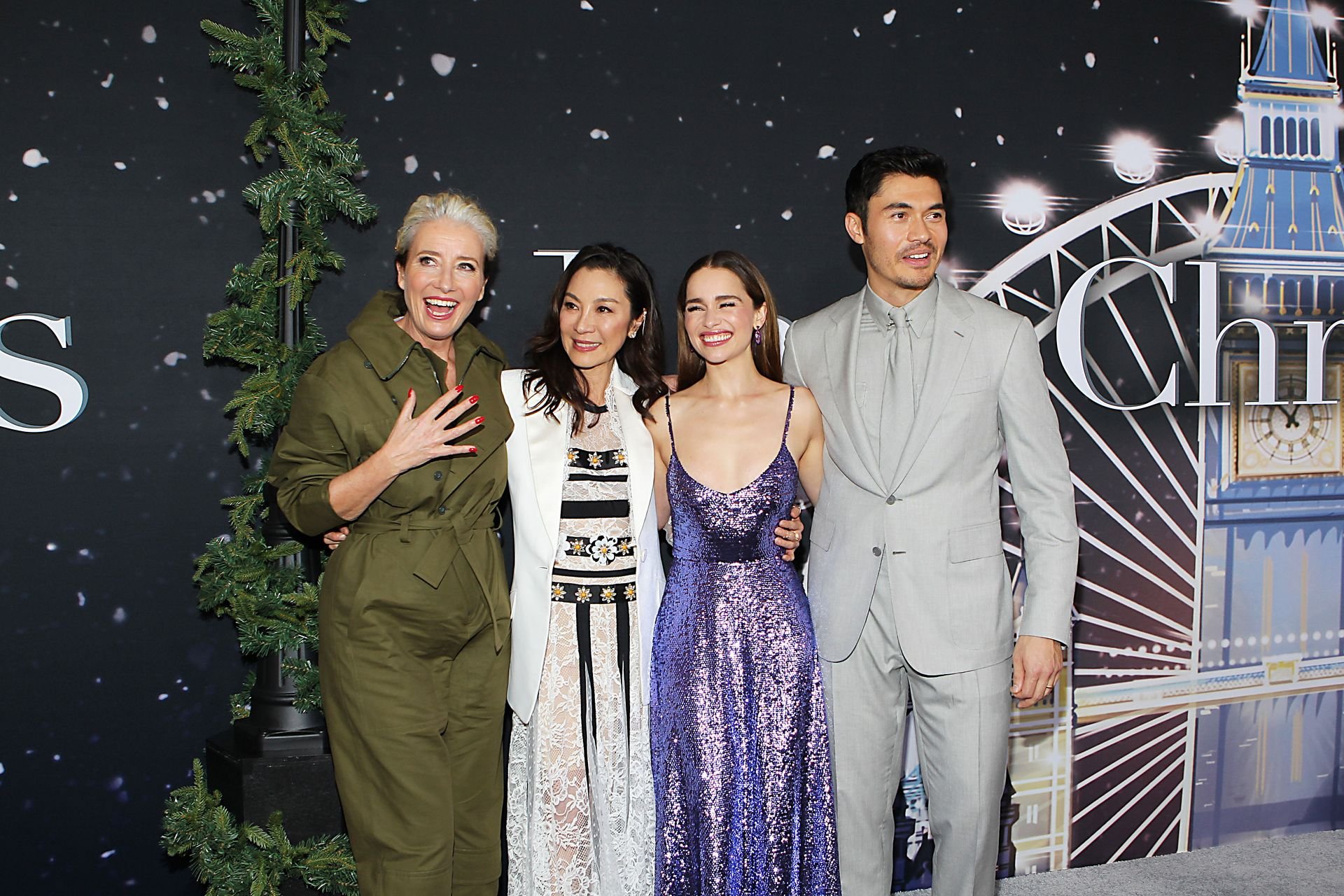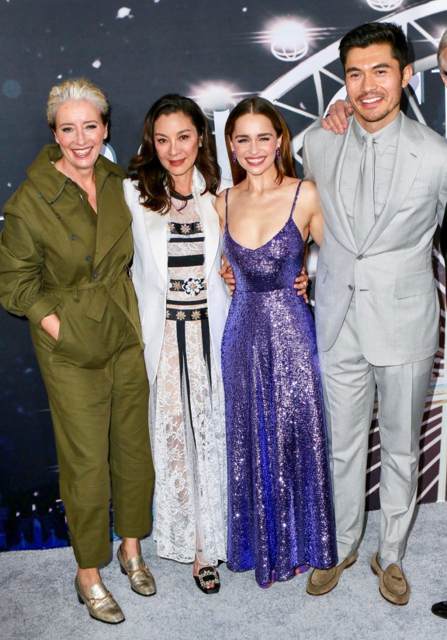 Участники съемок “Last Christmas” Эмилия Кларк, Генри Голдинг, Мишель Йео и Эмма Томпсон позируют вместе на красной дорожке премьеры фильма Last Christmas в Нью-Йорке, 30.10.2019. Мишель Йео и Генри Голдинг весело воссоздали сцену мать/сын из их последнего совместного фильма “Безумно богатые азиаты”.