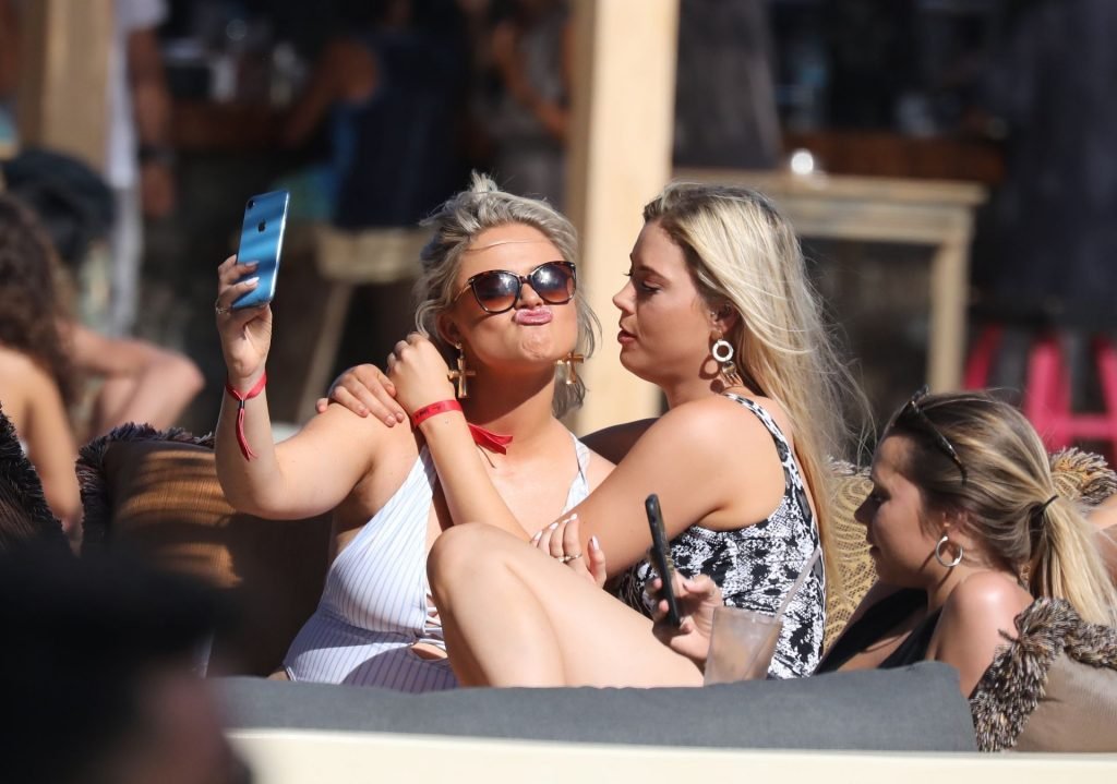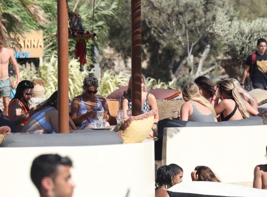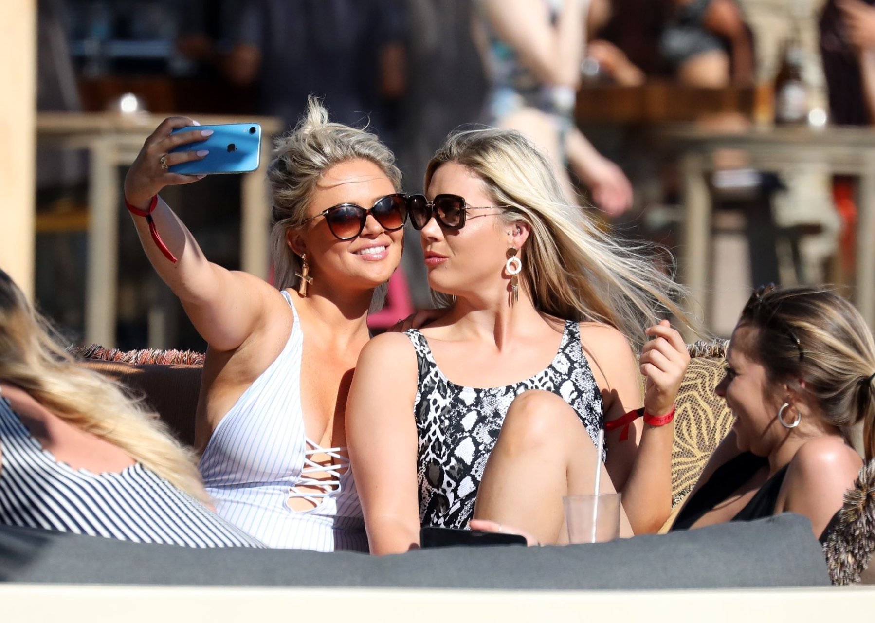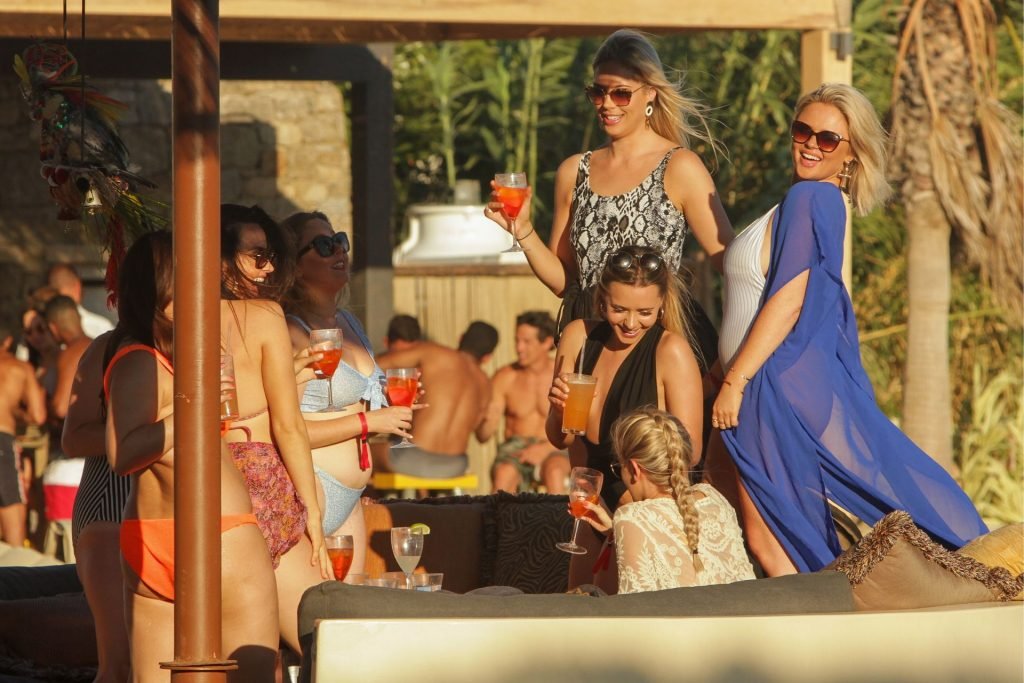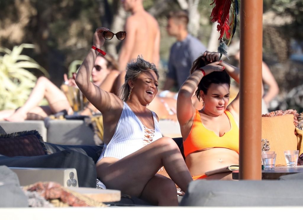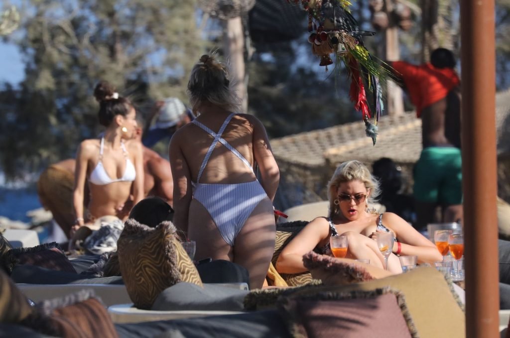 Английская актриса и звезда The Fappening Эмили Этак весело проводит время на солнце со своими подругами в баре Santana на острове Миконос, 08/09/2019.
