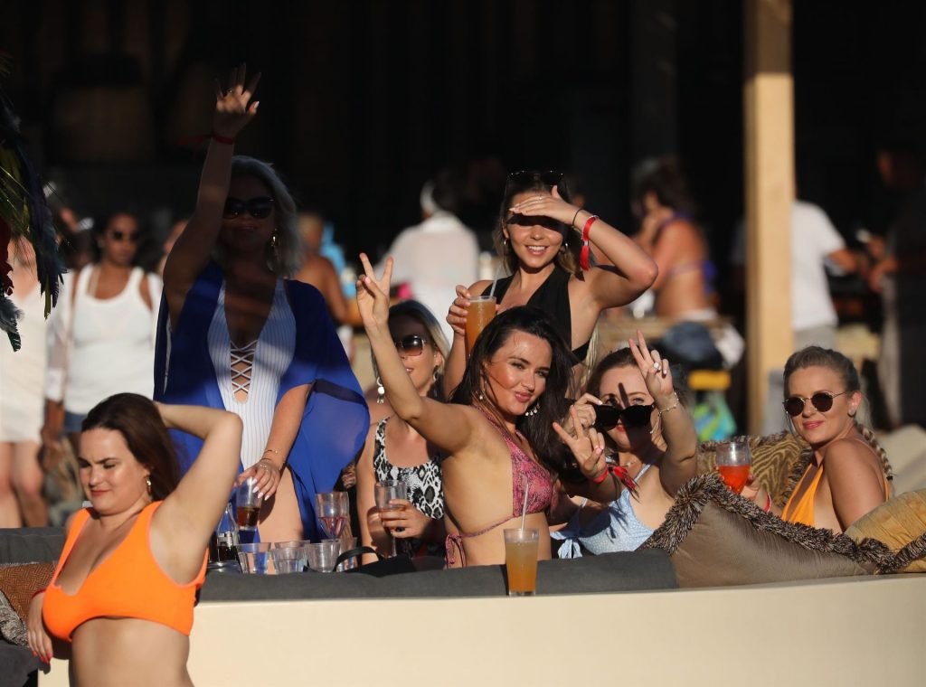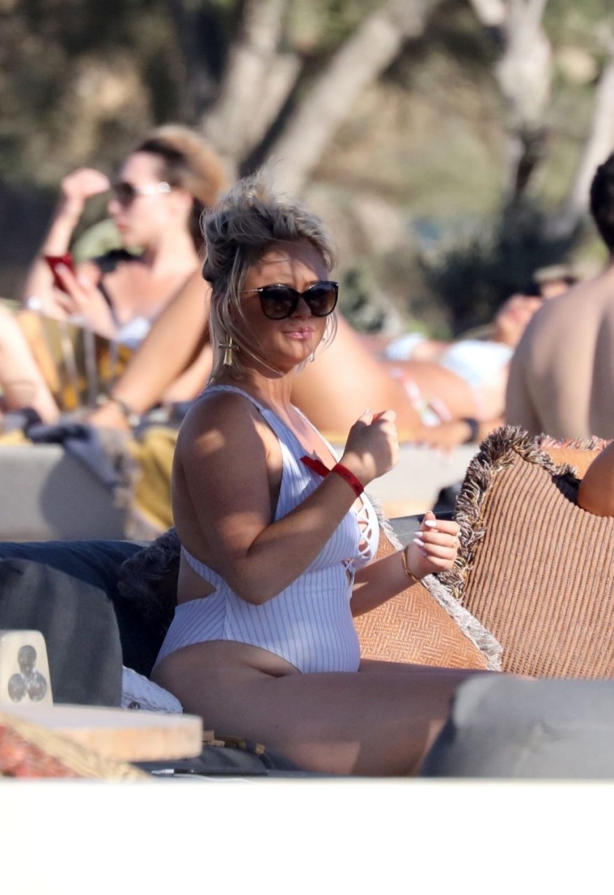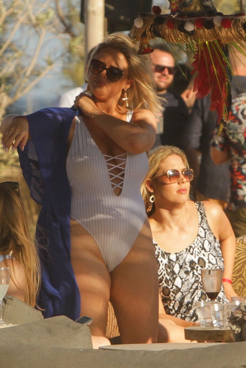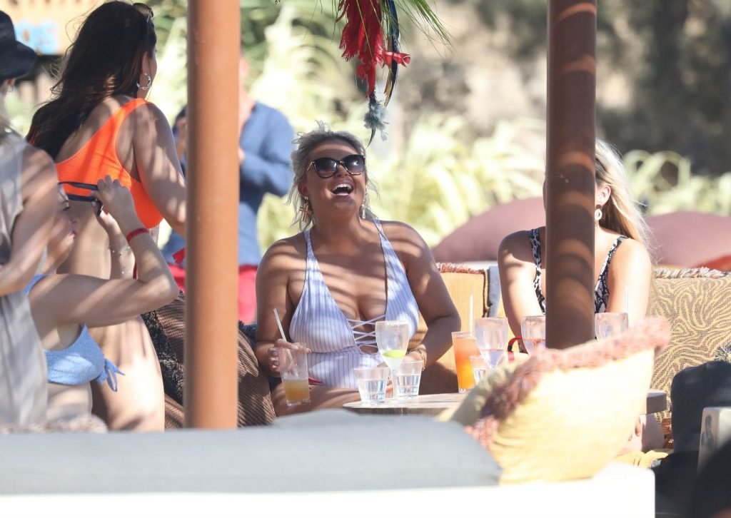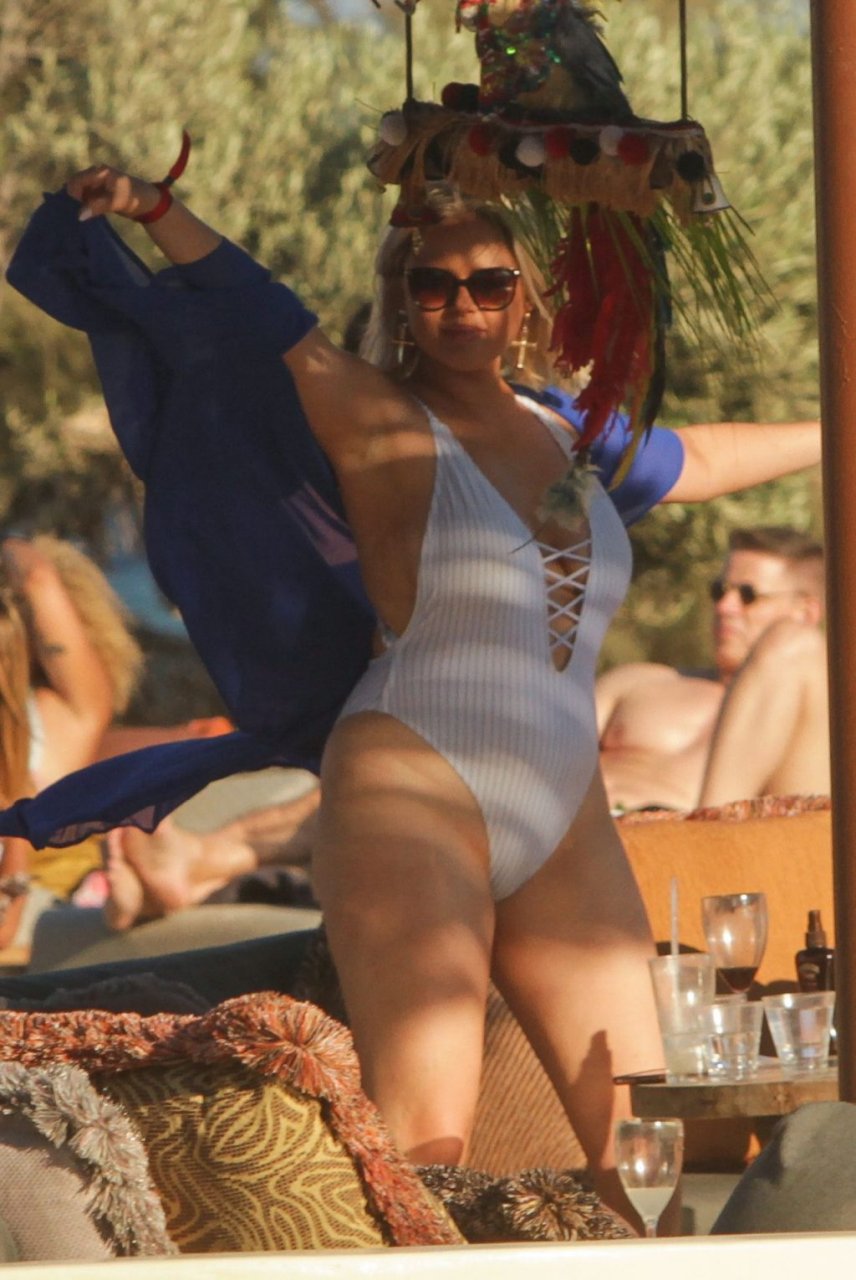 Английская актриса и звезда The Fappening Эмили Этак весело проводит время на солнце со своими подругами в баре Santana на острове Миконос, 08/09/2019.