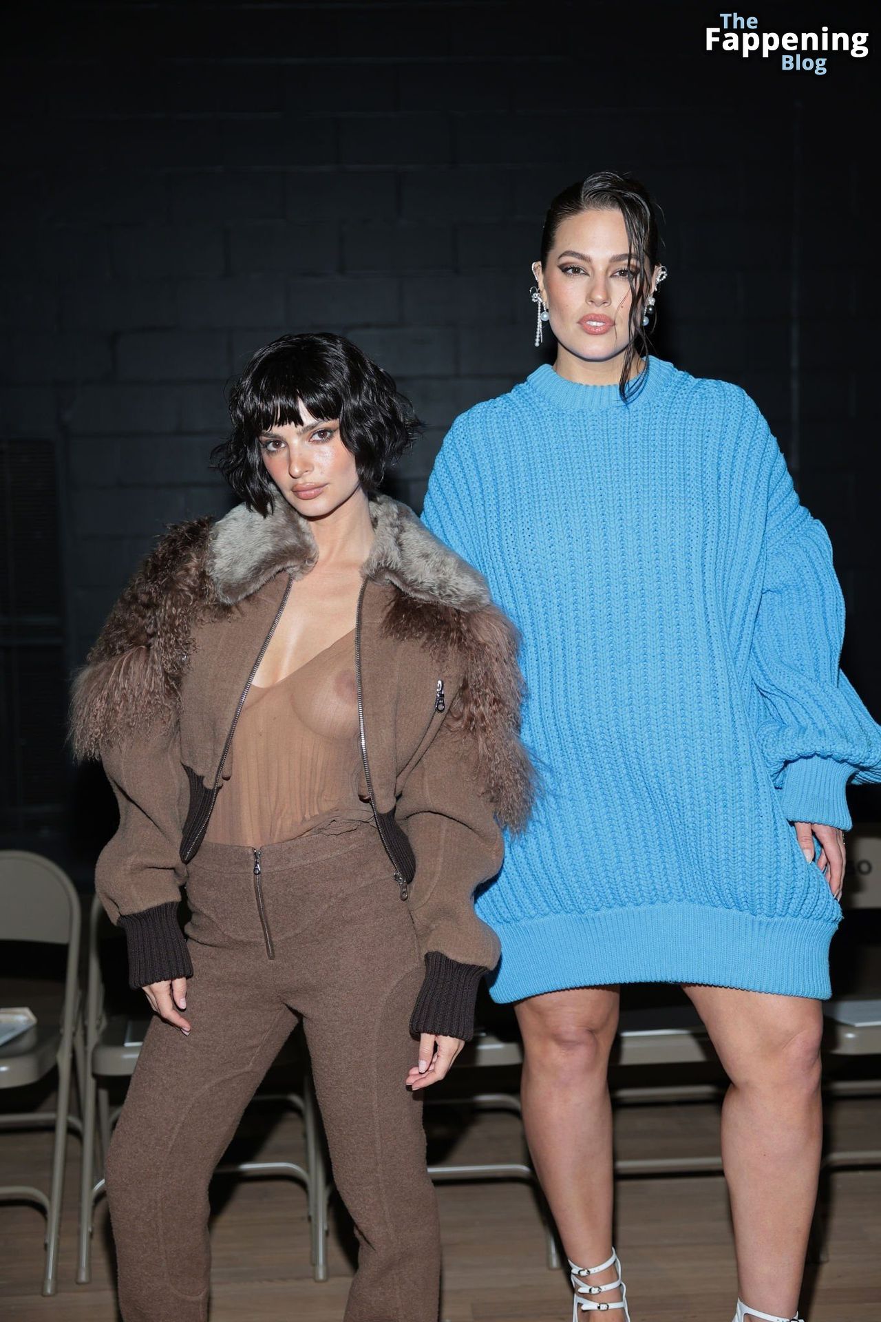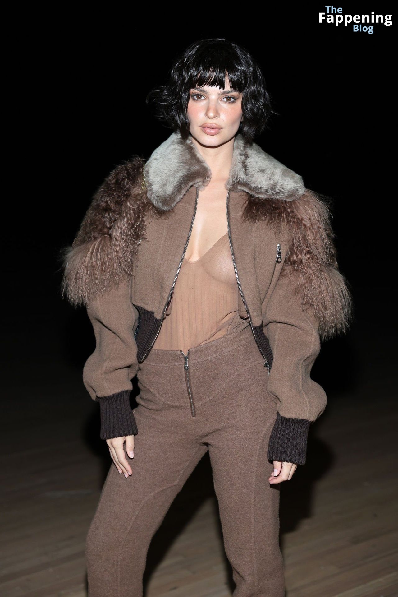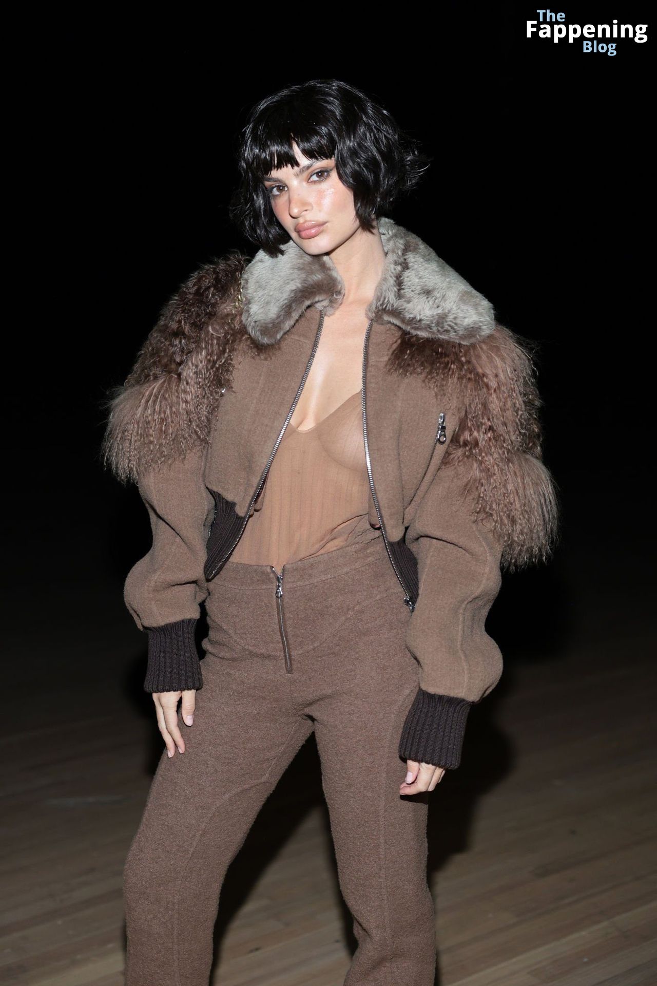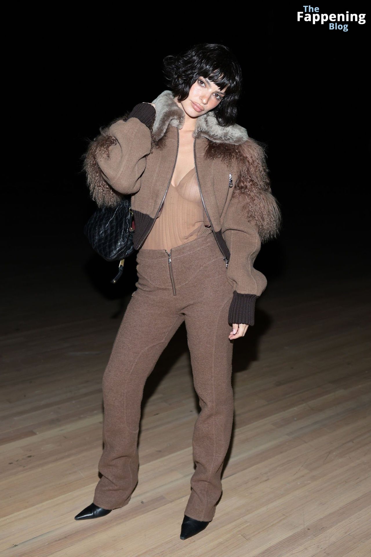 Эмили Ратаковски показывает свои сексуальные груди без бюстгальтера и соски в прозрачном топе, посещая показ Marc Jacobs в Нью-Йорке