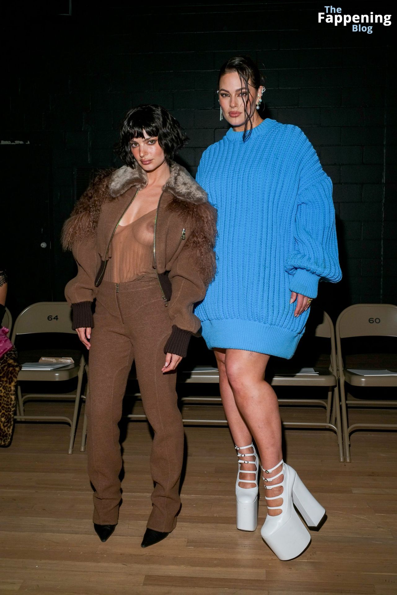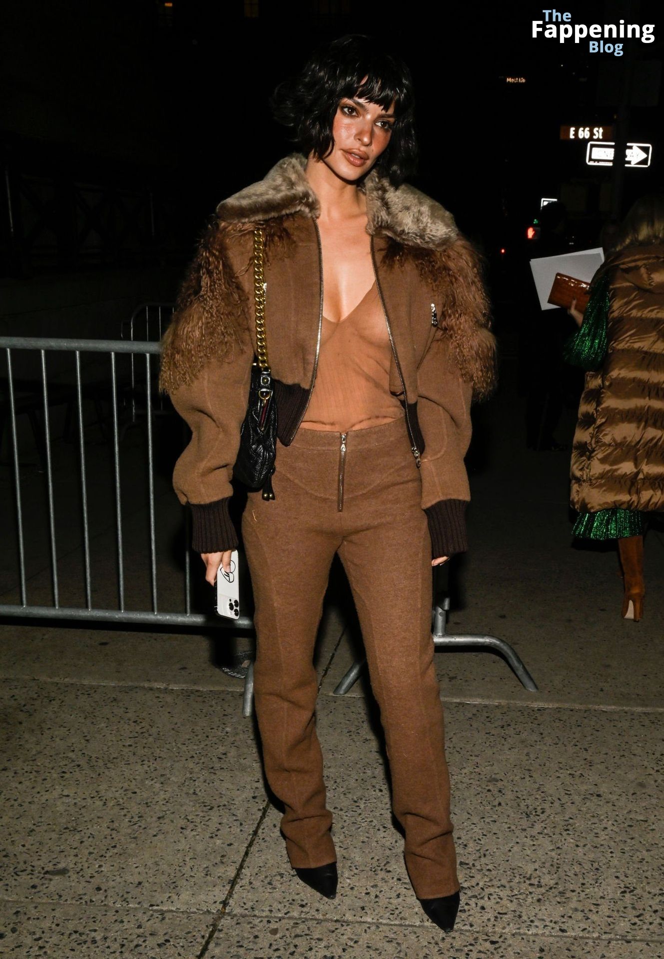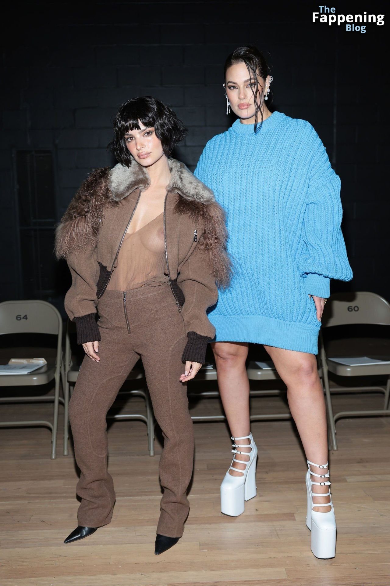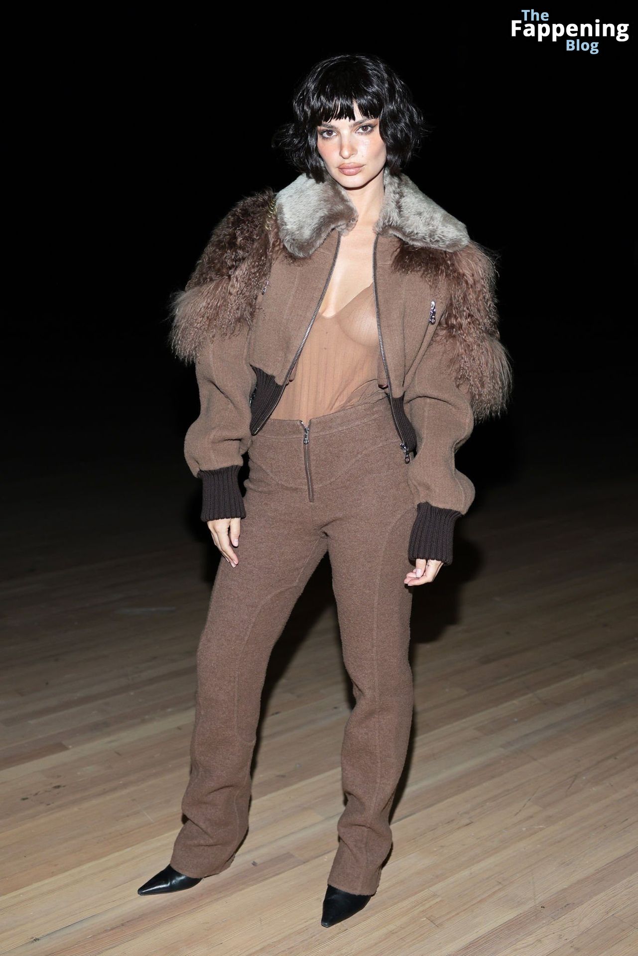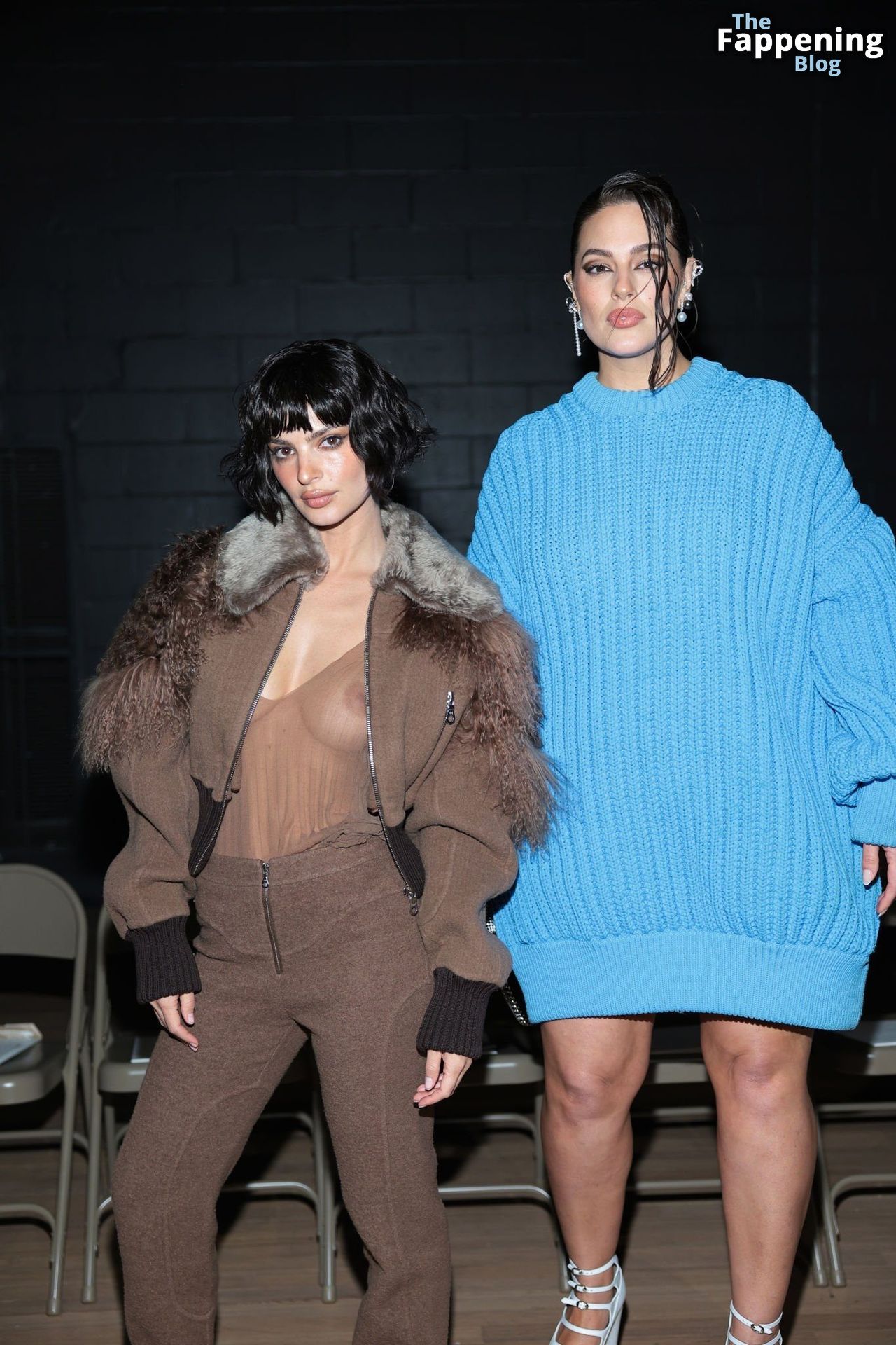 Эмили Ратаковски показывает свои сексуальные груди без бюстгальтера и соски в прозрачном топе, посещая показ Marc Jacobs в Нью-Йорке