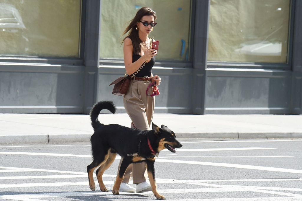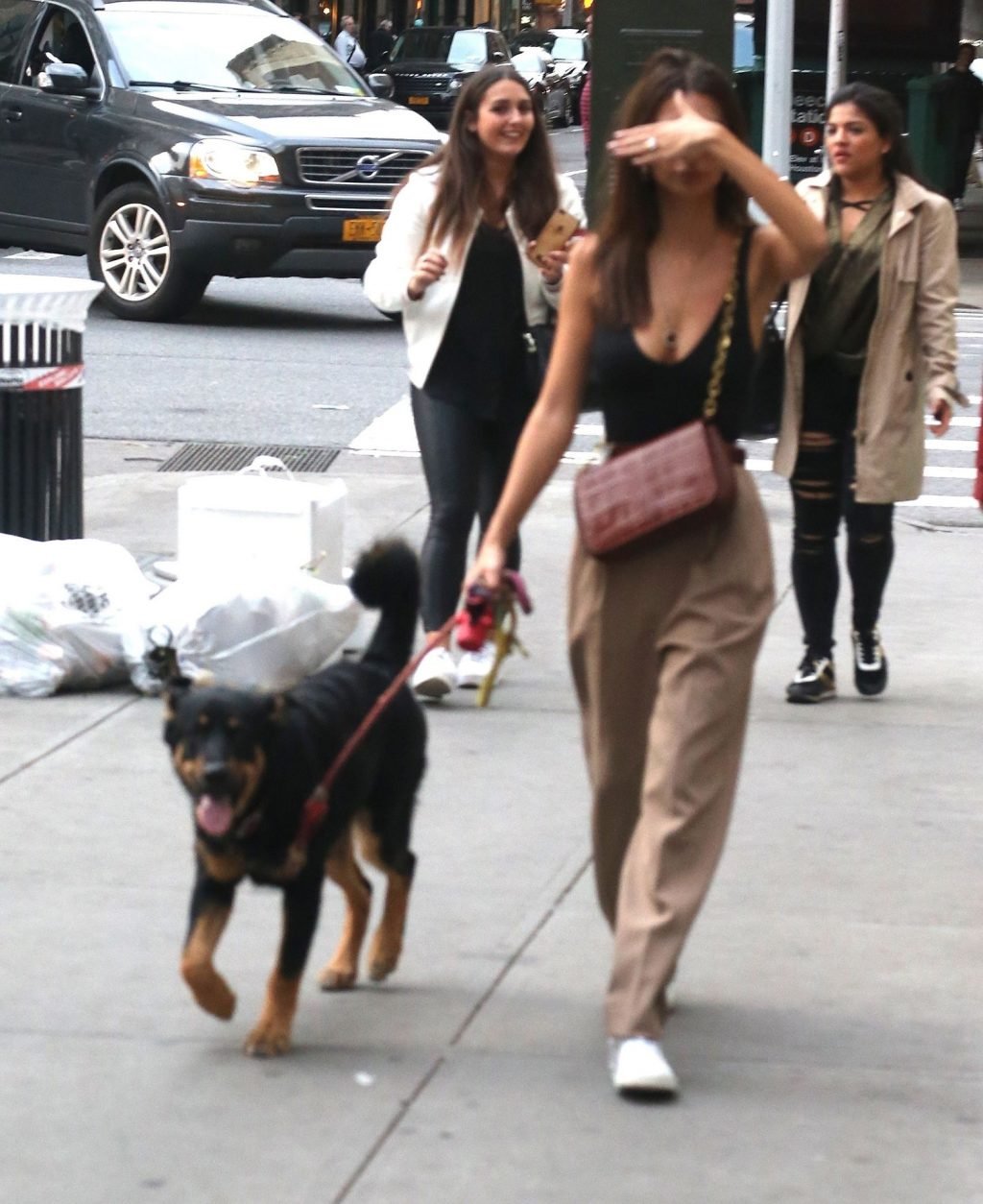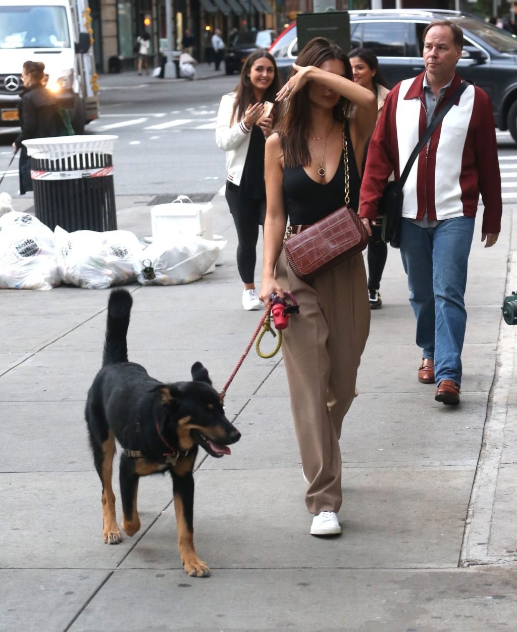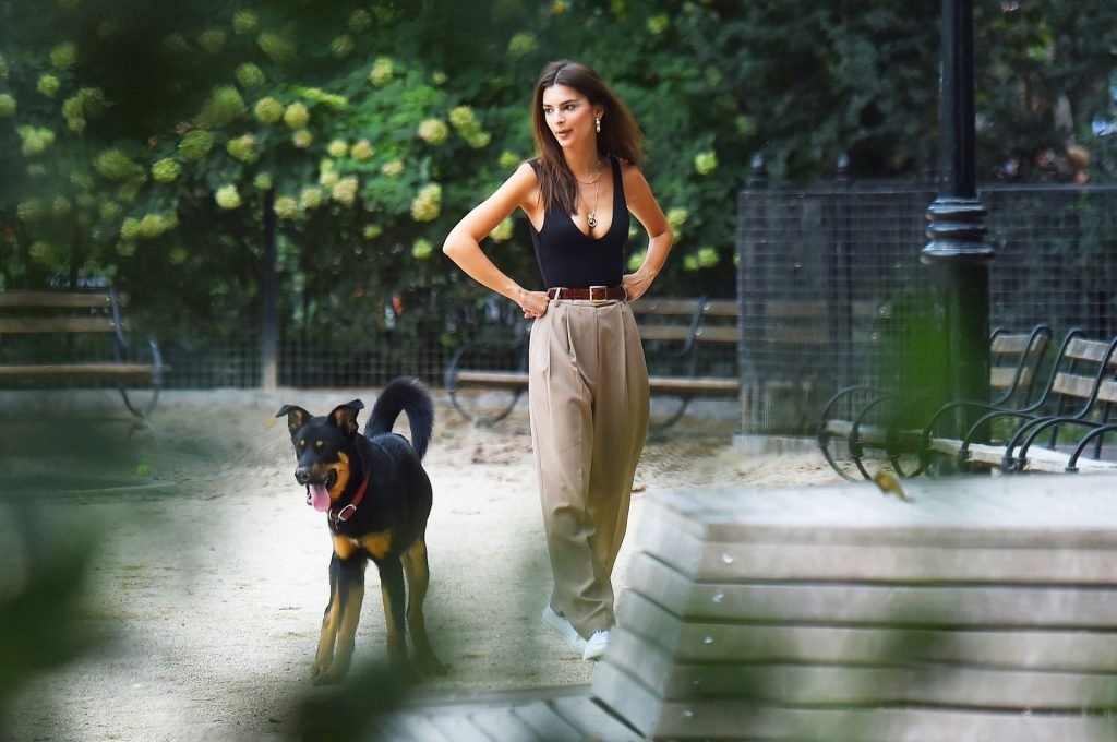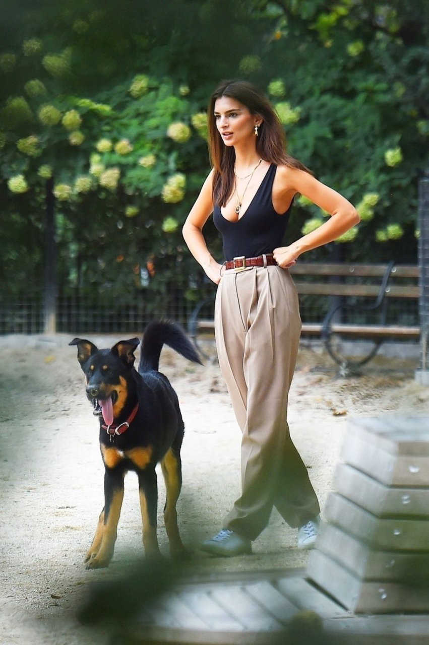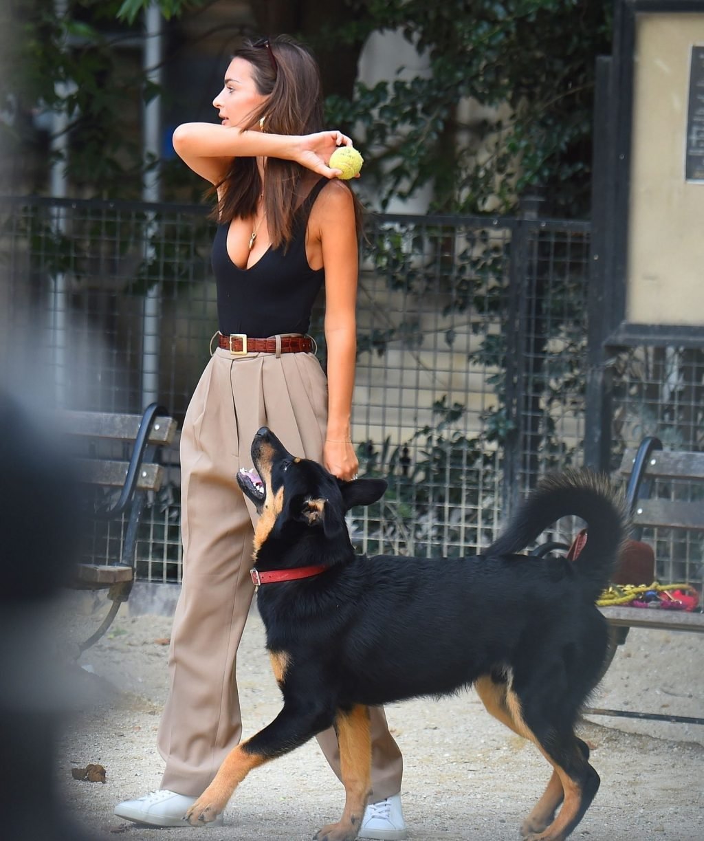 Эмили Ратаковски, выходящая в топе с глубоким вырезом и плиссированных хаки, выгуливает своего щенка Коломбо в парке Нью-Йорка, 07.10.2019! Растущий щенок играет с Эмили в ловлю, и Коломбо доказывает, что он хорошо обучен, ловя теннисный мяч и возвращая его Эмили.