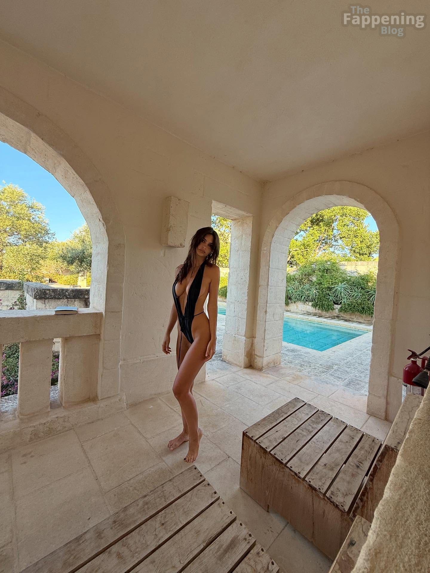Звезда Фаппенинга Эмили Ратаковски запечатлена в дымящемся черном монокини, демонстрируя свои сексуальные груди и ягодицы.