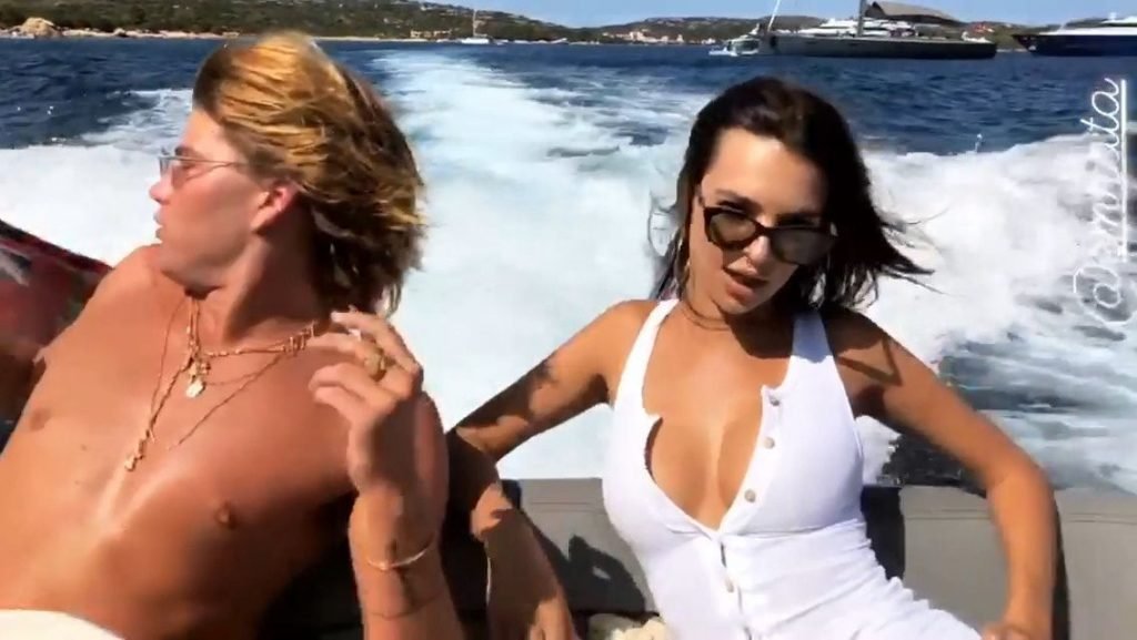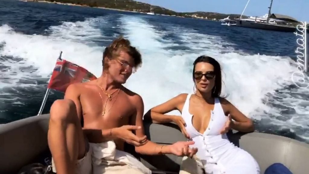 Модель и актриса Эмили Ратаковски наслаждается днем с Джорданом Барреттом и другими друзьями в Порто Черво, Италия, 10.08.2018. Худощавая пьяная красавица продемонстрировала свои идеальные груди и ягодицы.