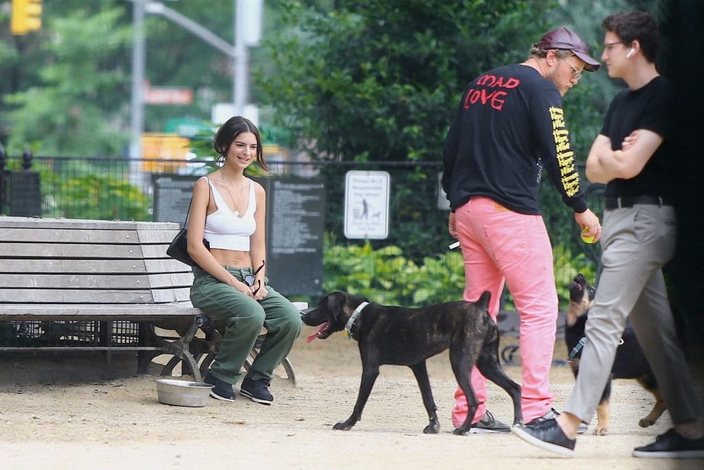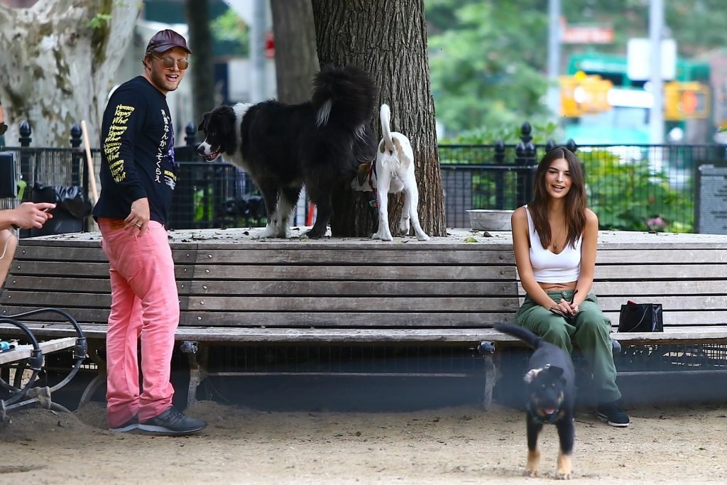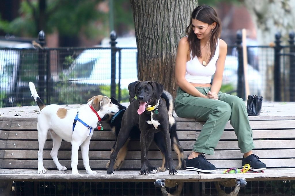 Сексуальная модель/актриса Эмили Ратаковски с мужем Себастьяном Бир-МакКлардом и их собакой Коломбо, запечатленные во время веселья в парке для собак Вашингтон-сквер в Нью-Йорке, 20.06.2019.
