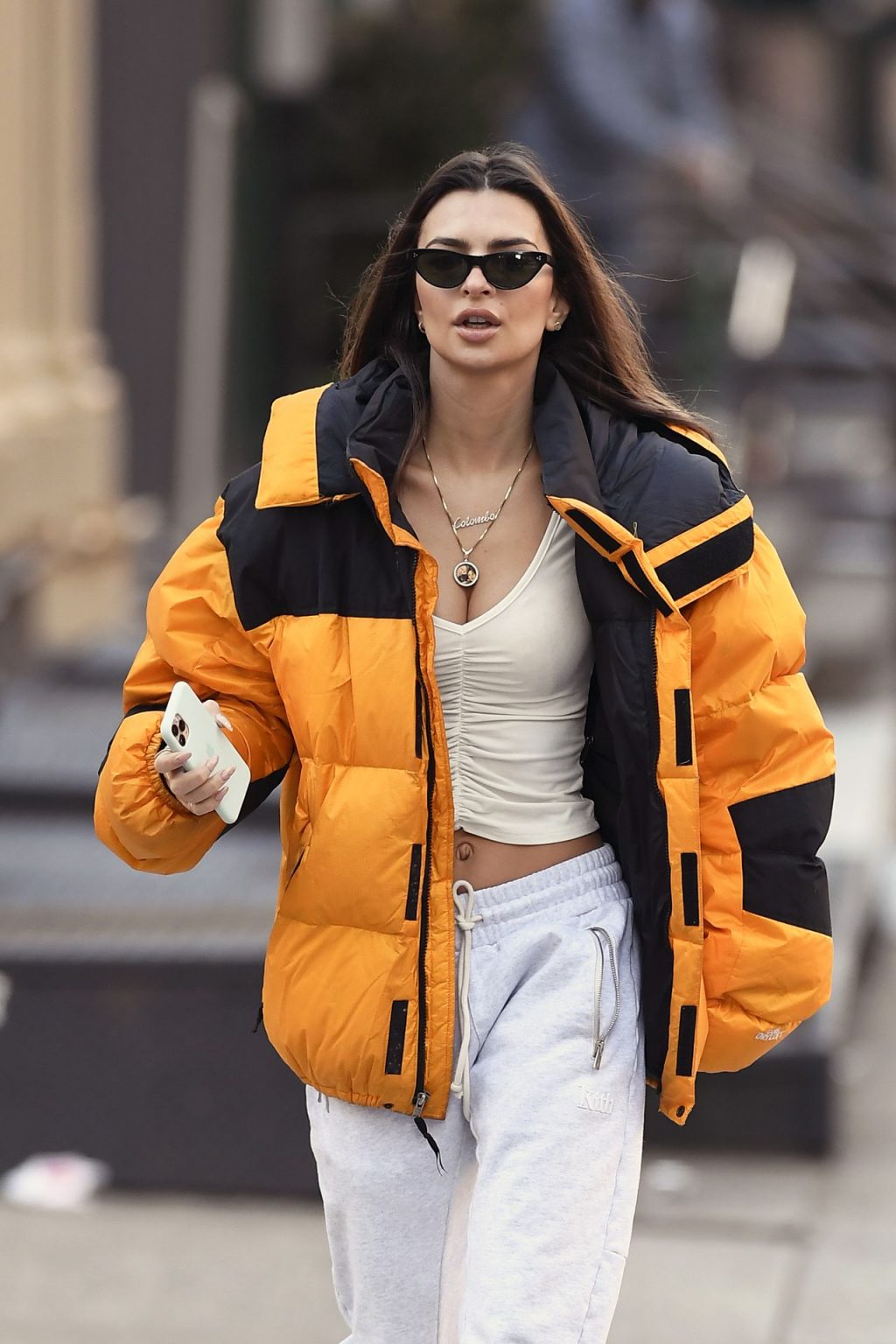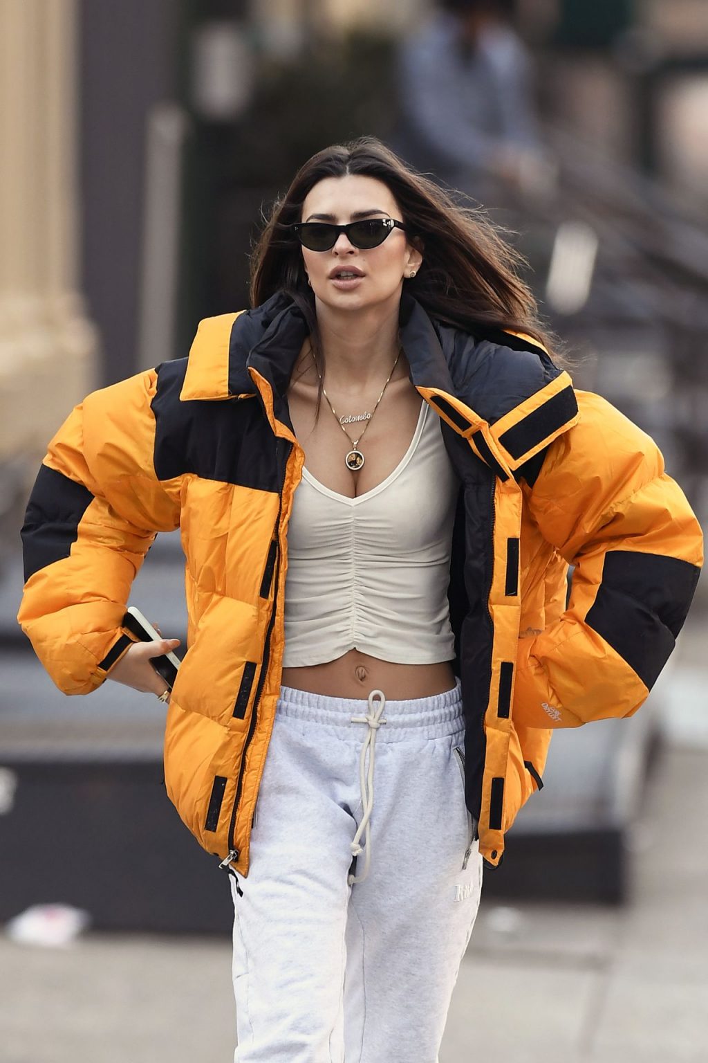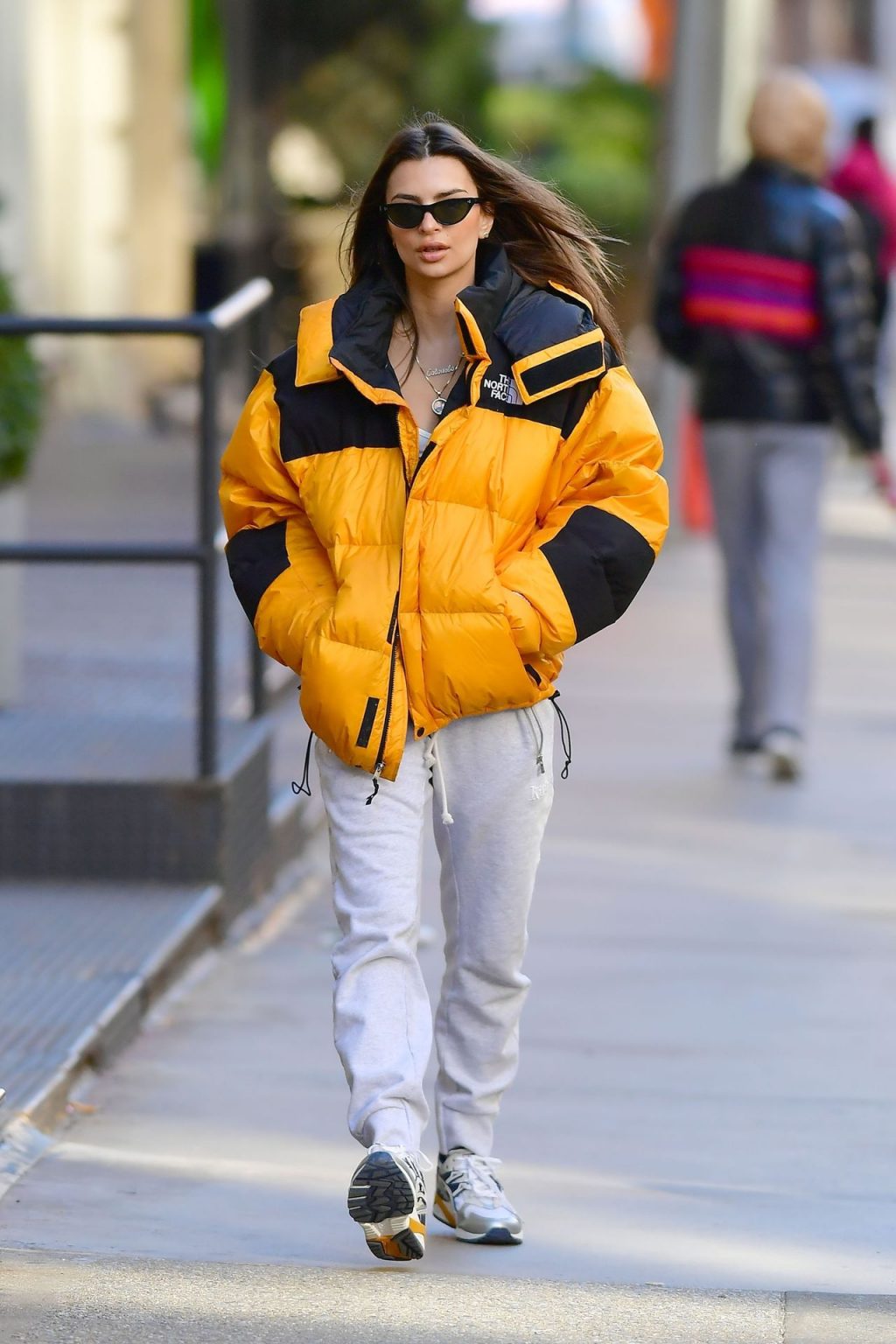 Emily Ratajkowski была замечена в ожерелье с гравировкой Colombo и желтой куртке North Face в холодный зимний день в Нью-Йорке, 01/02/2020.