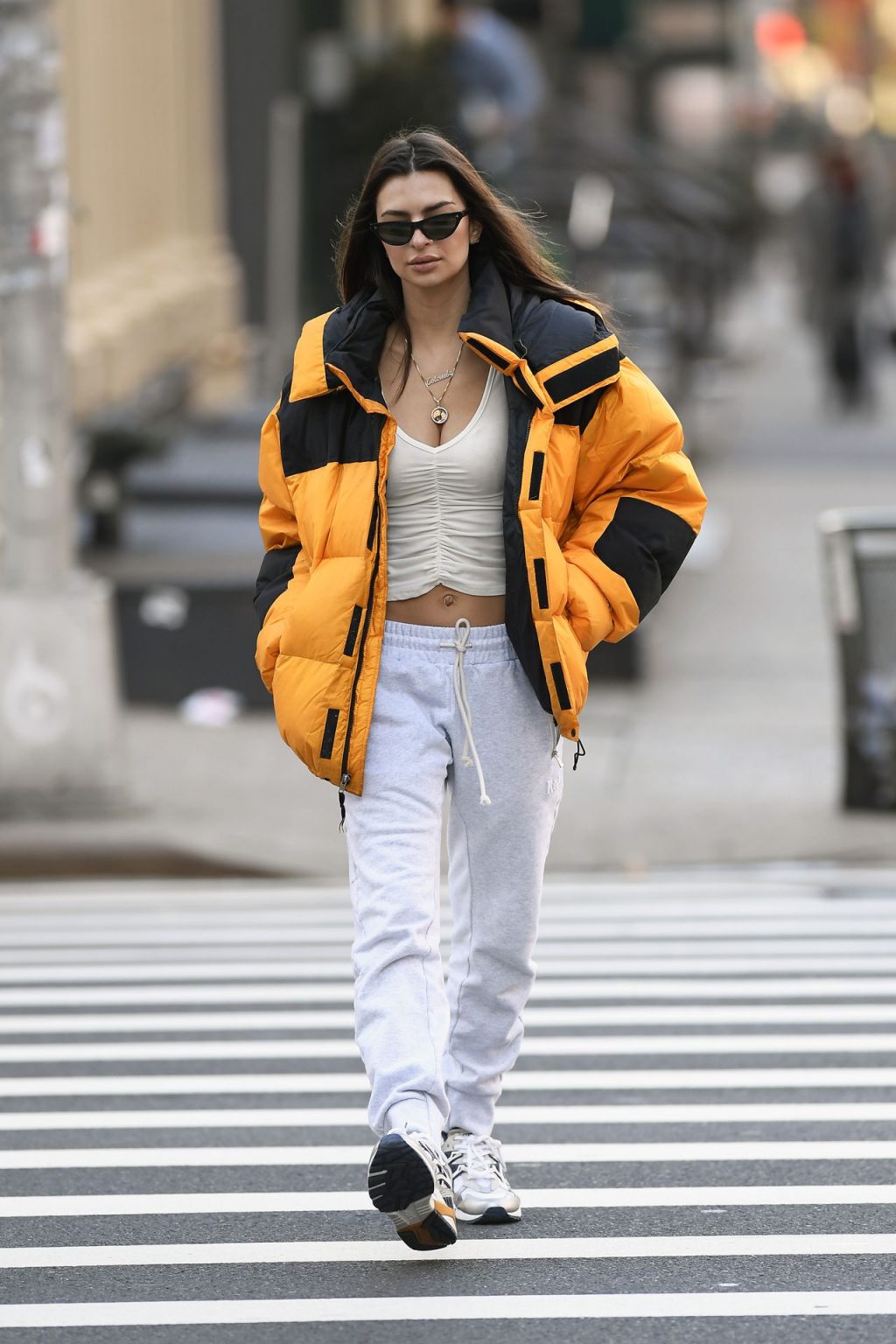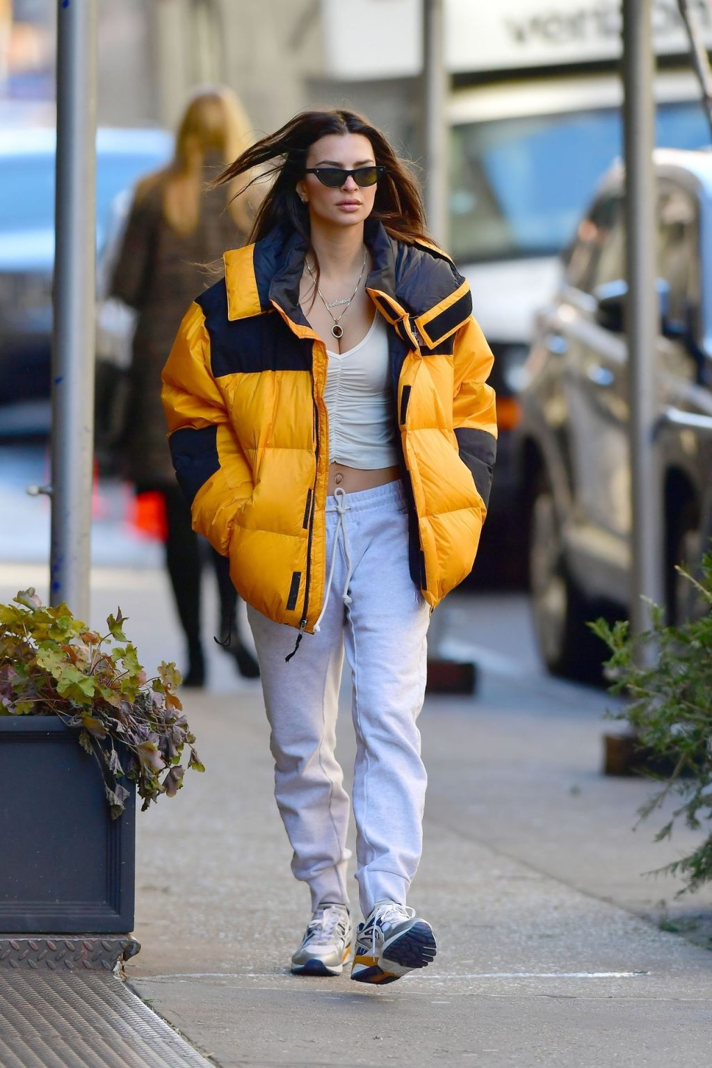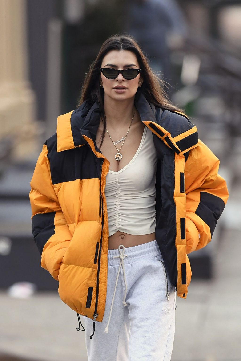 Emily Ratajkowski была замечена в ожерелье с гравировкой Colombo и желтой куртке North Face в холодный зимний день в Нью-Йорке, 01/02/2020.