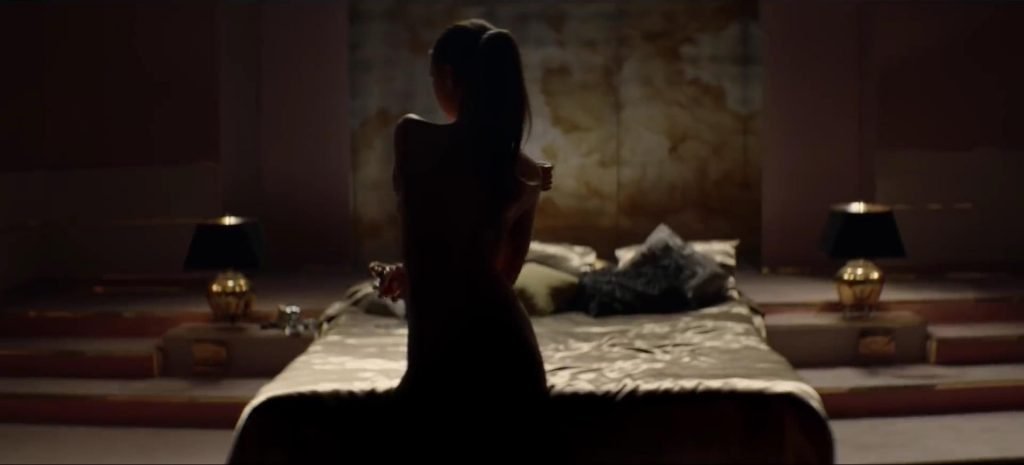 Модель Эмили Ратаковски позирует топлесс (прикрытая), надев стринги и больше ничего для новой рекламной кампании парфюма Paco Rabanne, “Pure XS for Her” (2018).