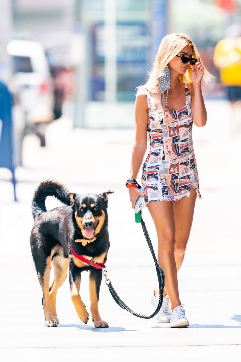 Emily Ratajkowski вышла на прогулку с собакой в Нью-Йорке, 28.06.2020. 29-летняя американская модель, актриса и звезда The Fappening наслаждается прекрасной погодой в городе, демонстрируя свои недавно окрашенные в блонд волосы и короткое летнее платье с узором в сочетании с белыми кроссовками.