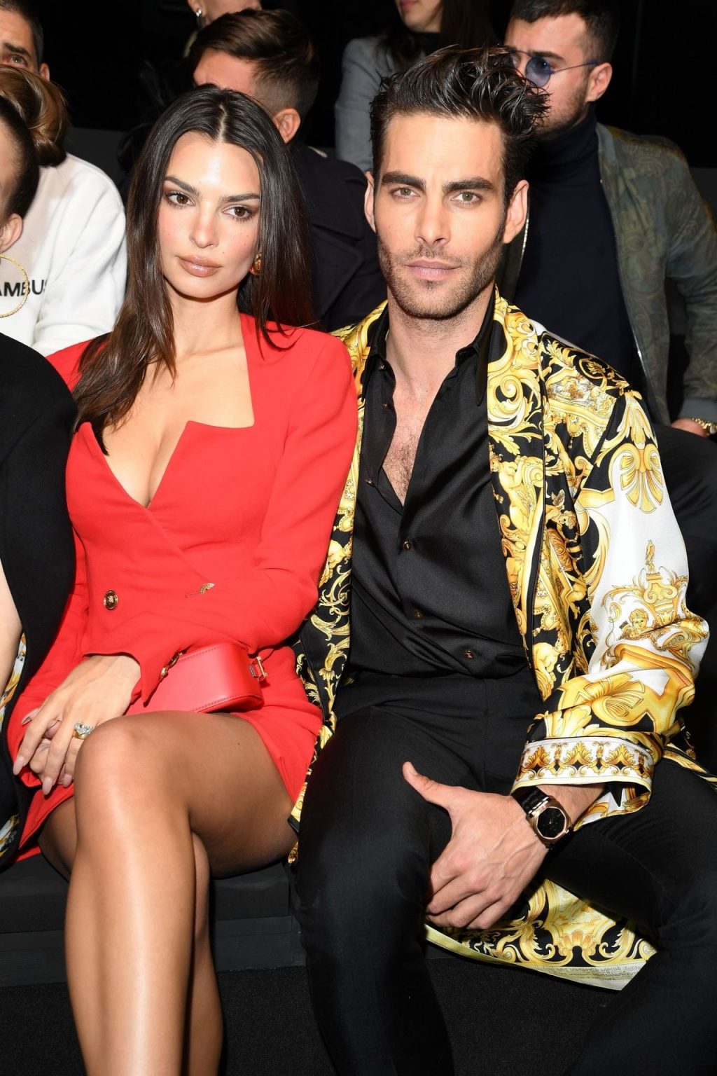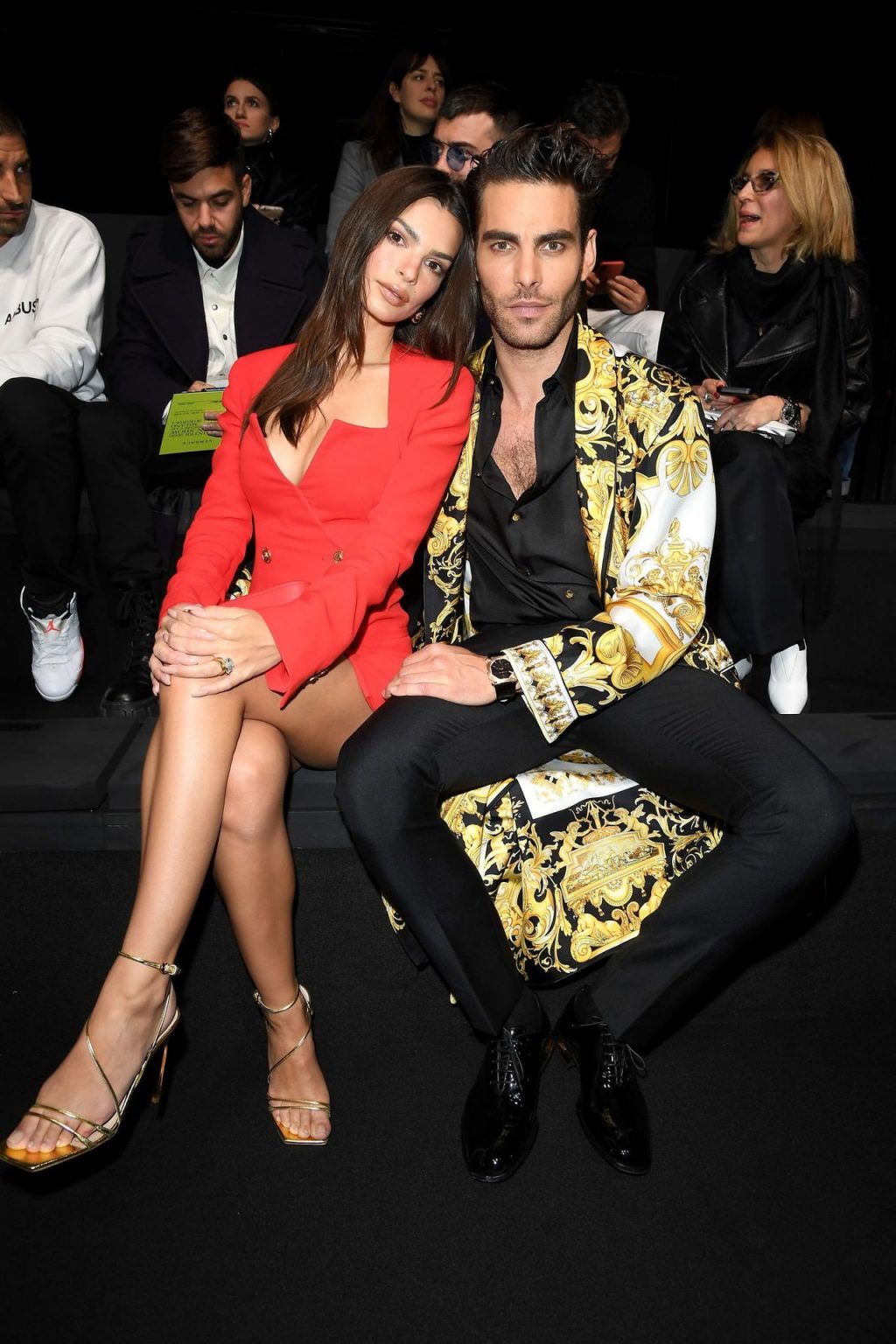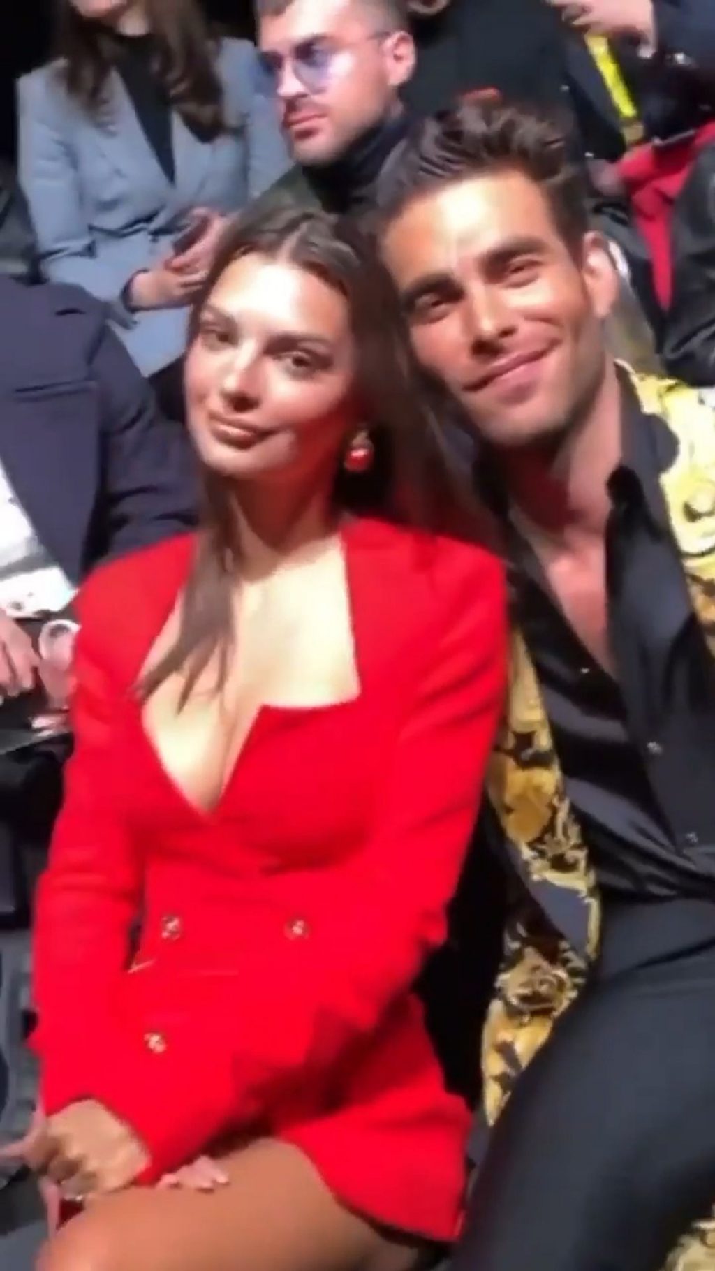 Звезда The Fappening Эмили Ратаковски была сфотографирована в красном платье, демонстрируя декольте на показе Versace осень/зима 2020/2021 во время Миланской недели моды, 21.02.2020.