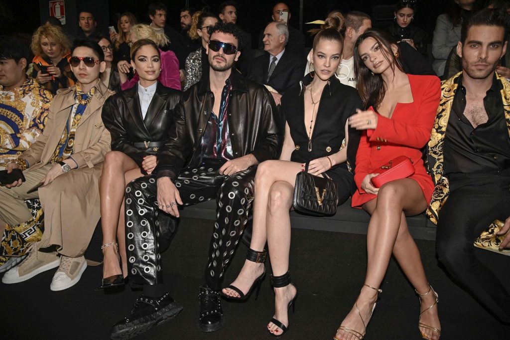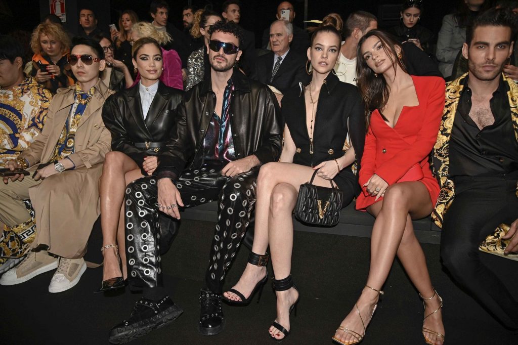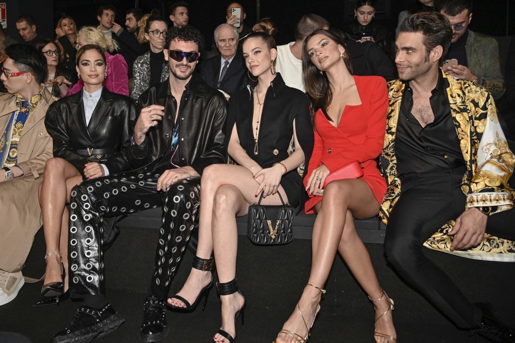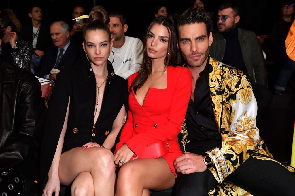 Звезда The Fappening Эмили Ратаковски была сфотографирована в красном платье, демонстрируя декольте на показе Versace осень/зима 2020/2021 во время Миланской недели моды, 21.02.2020.