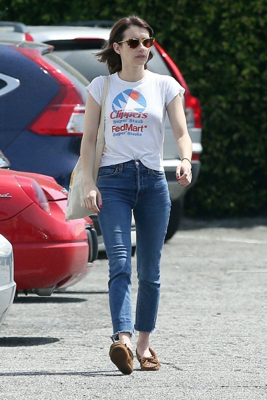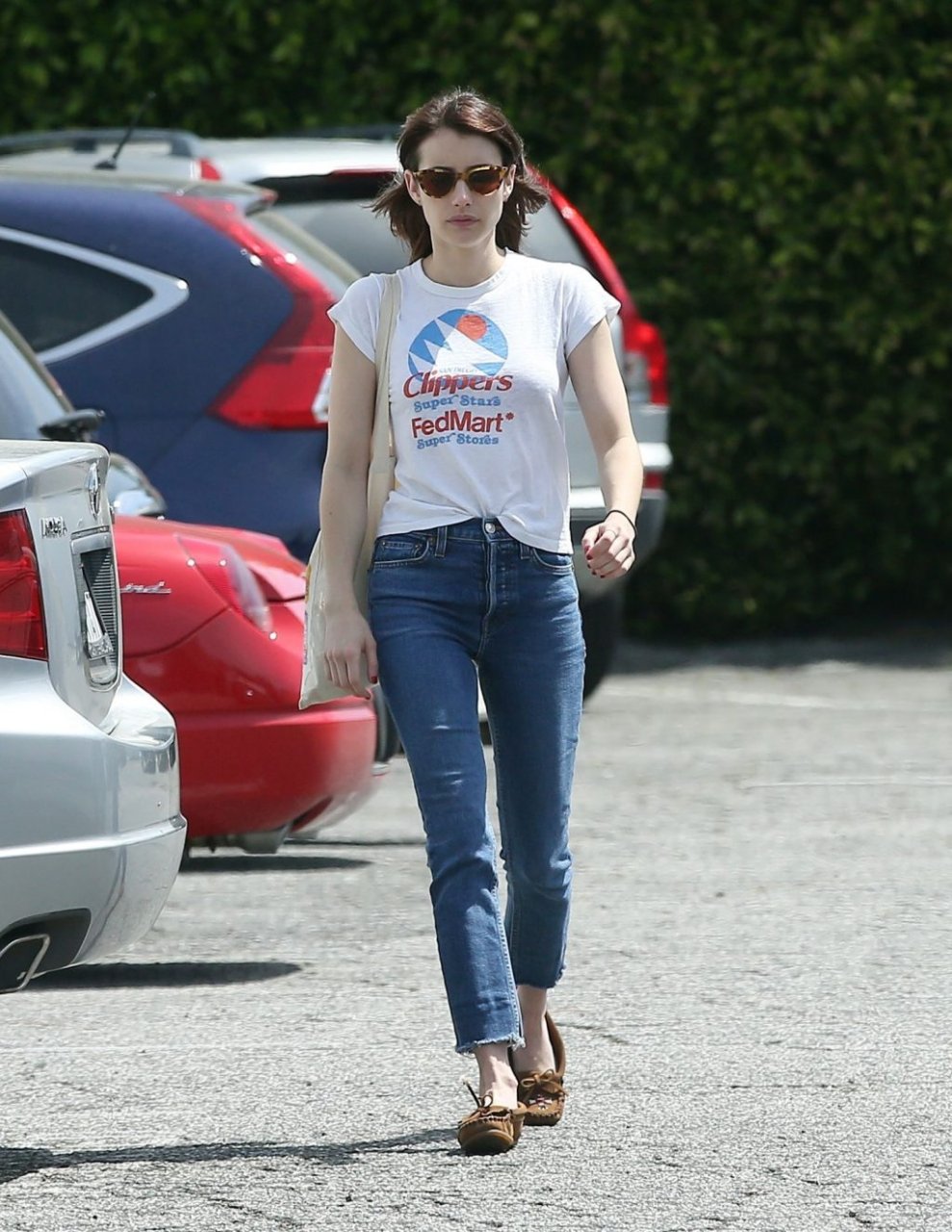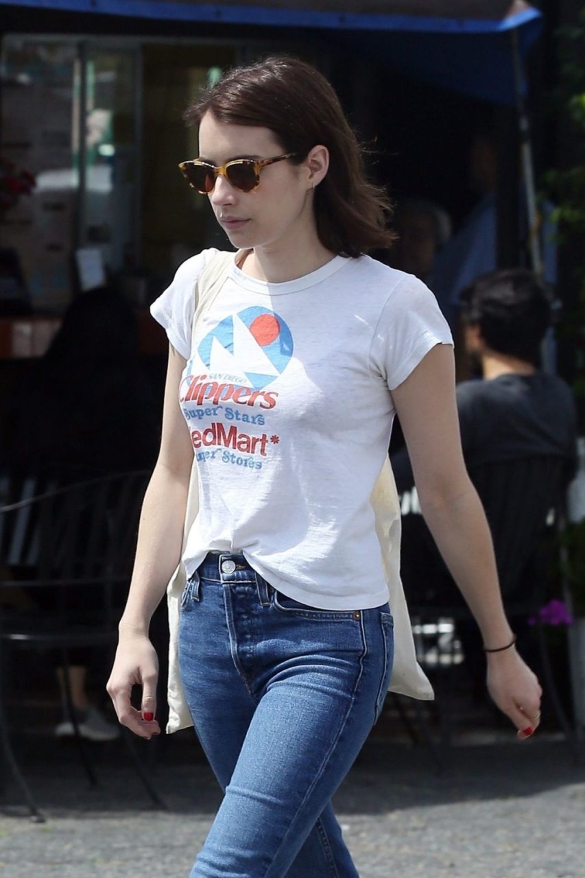Актриса Эмма Робертс занимается делами, прогуливаясь по району Лос-Фелис в Лос-Анджелесе в белой футболке без бюстгальтера и синих джинсах, 09.04.2019.