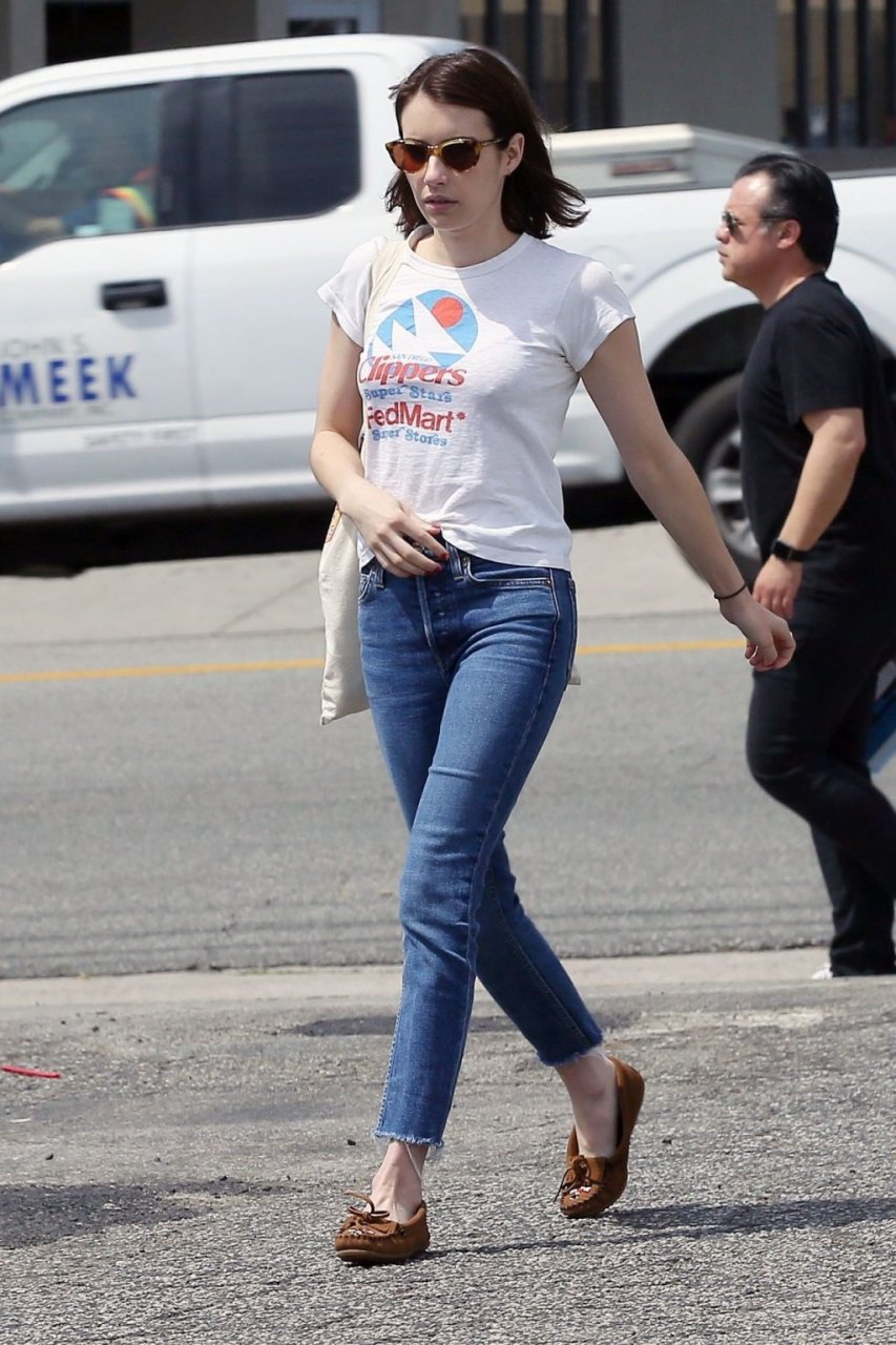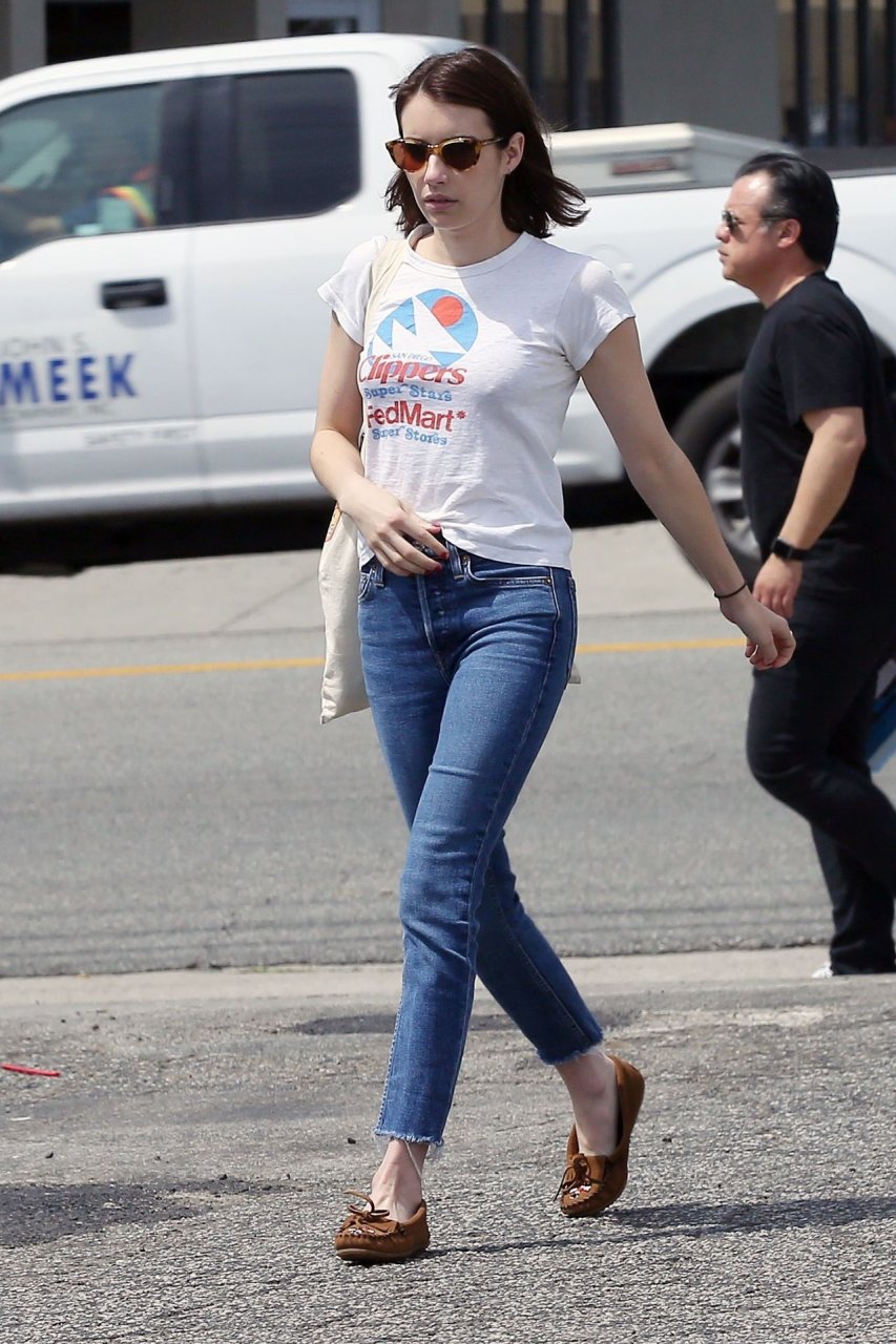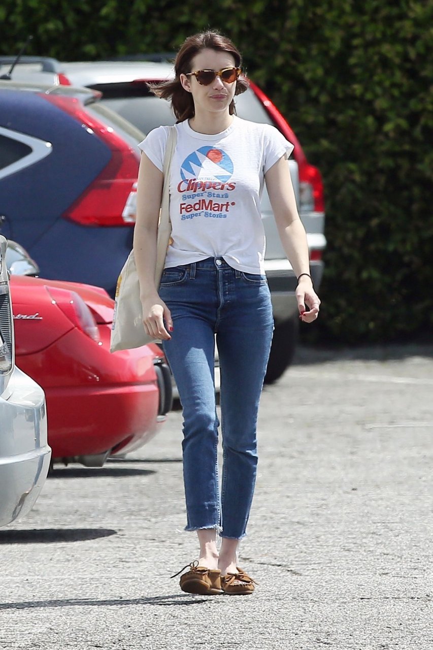 Актриса Эмма Робертс занимается делами, прогуливаясь по району Лос-Фелис в Лос-Анджелесе в белой футболке без бюстгальтера и синих джинсах, 09.04.2019.