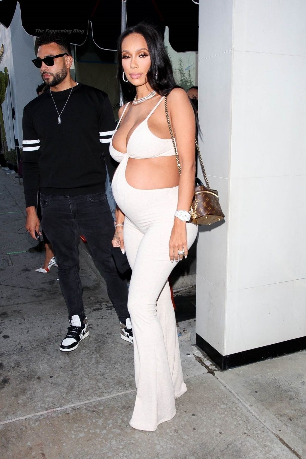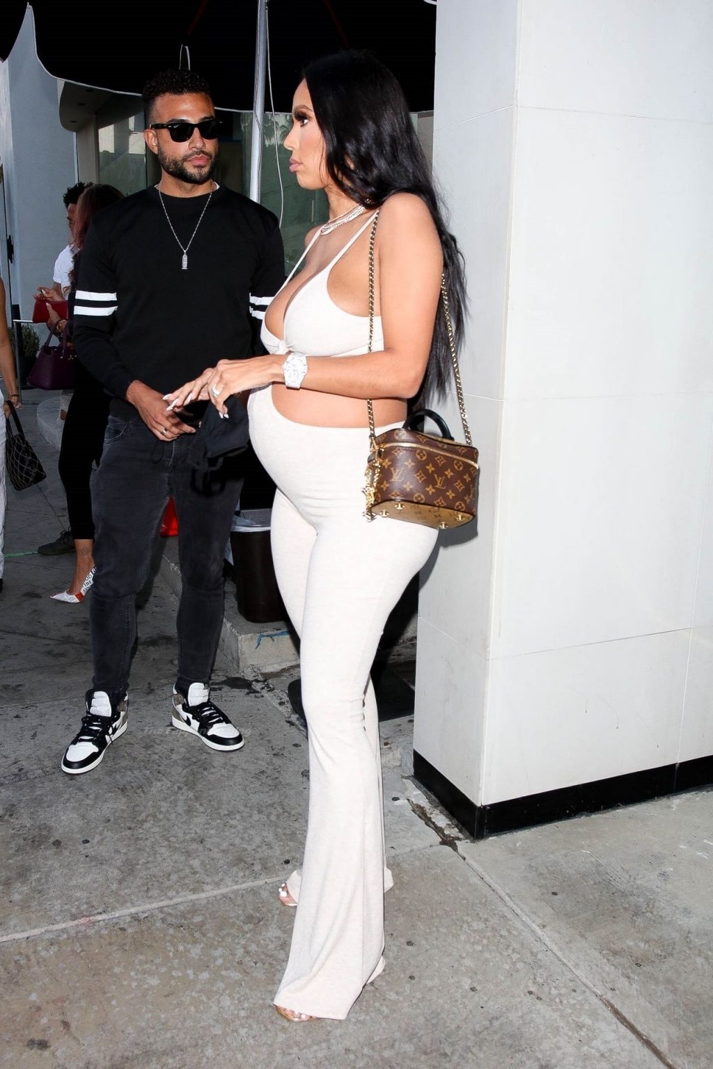 Очень беременная Эрика Мена демонстрирует растущий живот в откровенном белом комбинезоне, прибывая в Catch LA в Вест-Голливуде, 09.05.2021.