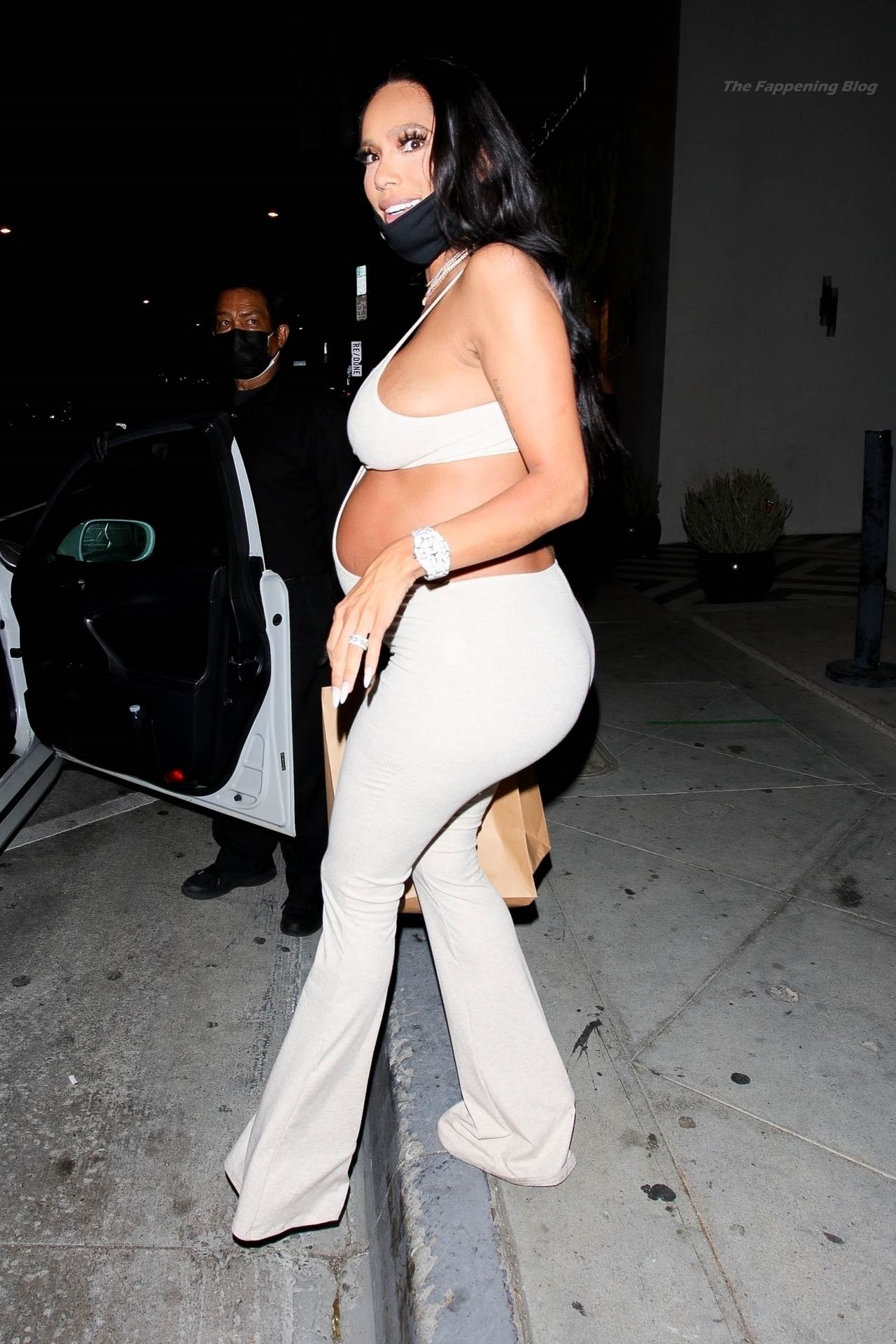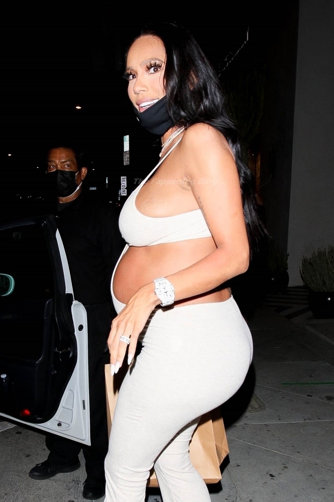 Очень беременная Эрика Мена демонстрирует растущий живот в откровенном белом комбинезоне, прибывая в Catch LA в Вест-Голливуде, 09.05.2021.