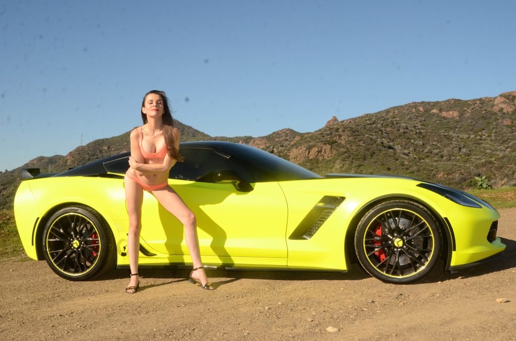 Erika Jordan и Alicia Arden позируют в фотосессии с суперкаром Corvette C7 Z06 стоимостью 150 000 долларов в Малибу, 13.03.2017.