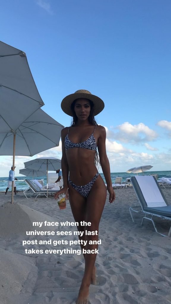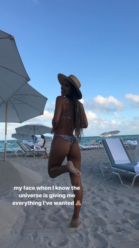 Модель Instagram Эрика Уитон (20) берет освежающий фруктовый напиток после того, как позагорала на песке на пляже 1 Hotel Beach в Майами-Бич, 12/05/2017.