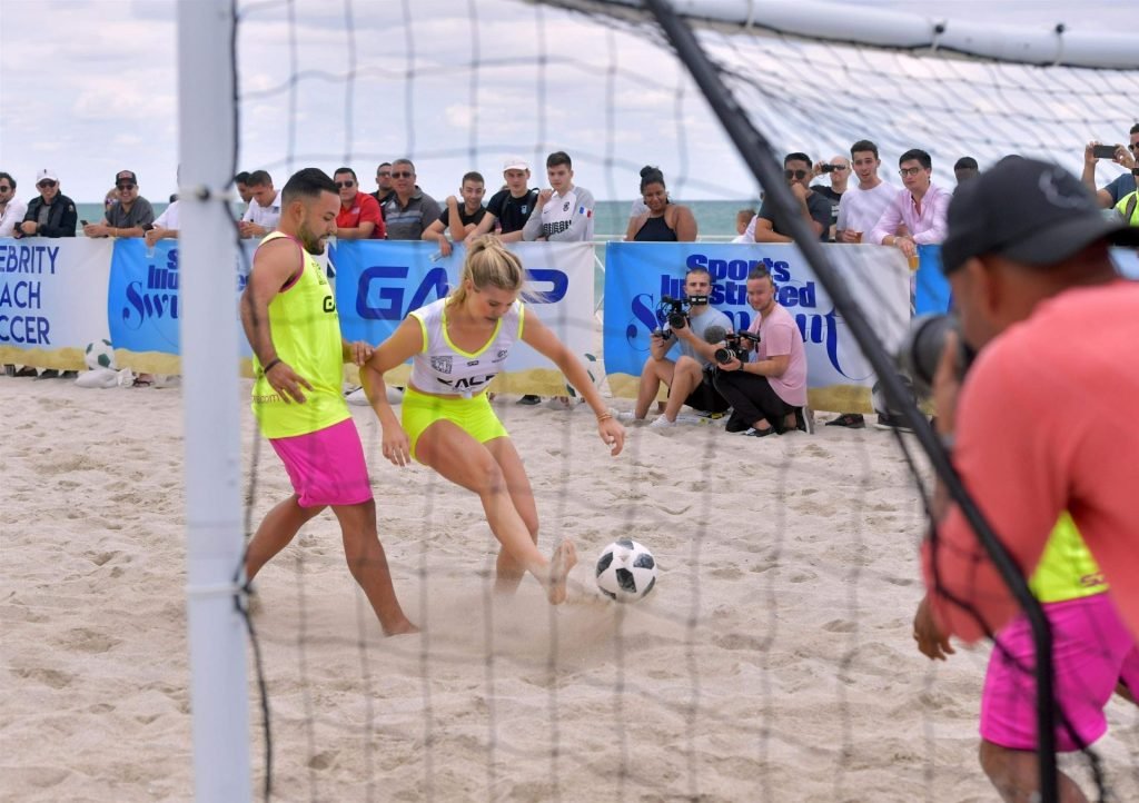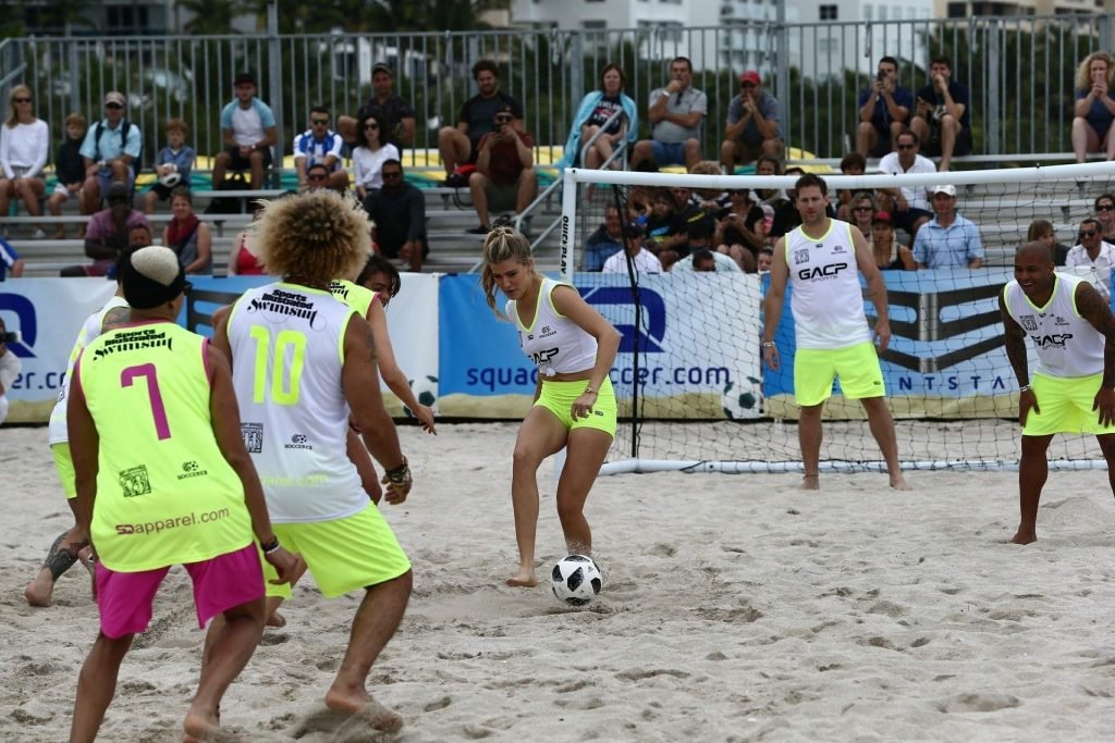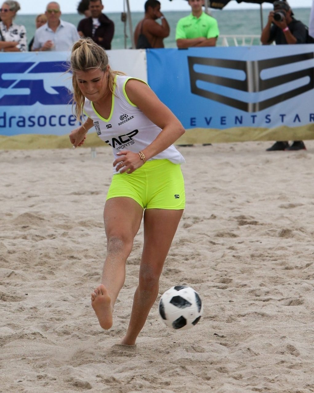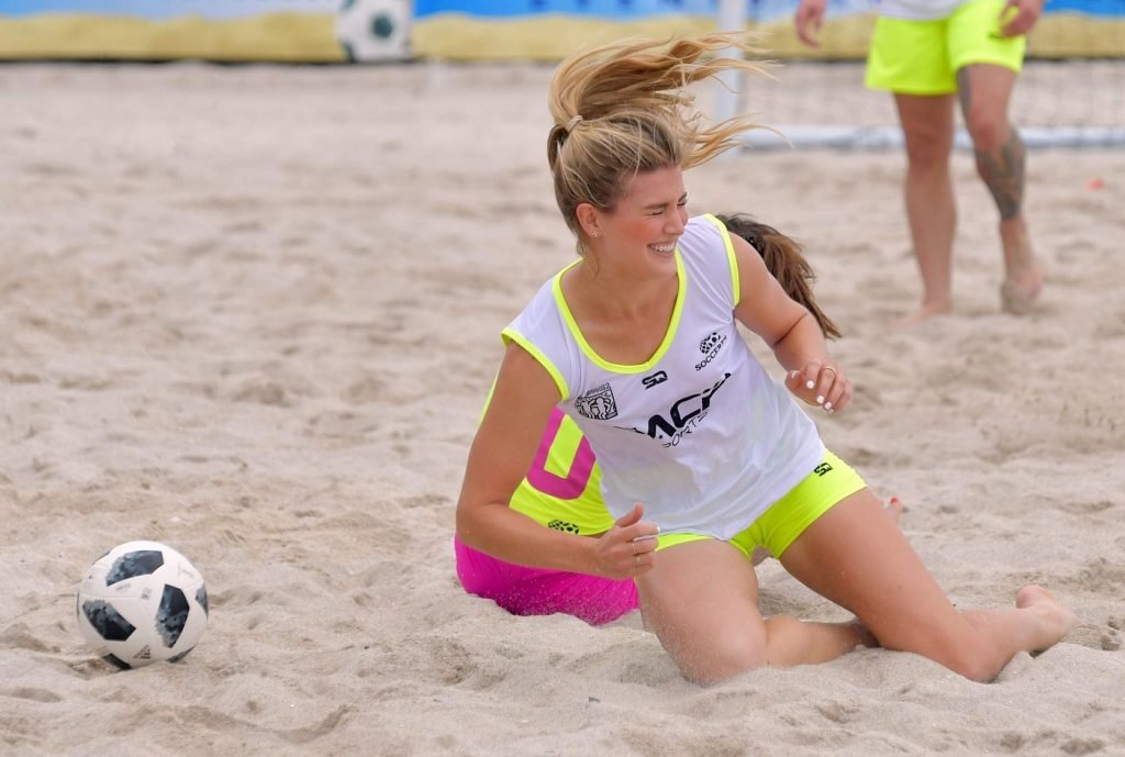 Теннисистка Юджини “Джинни” Бушар (24) удивила всех во время матча по пляжному футболу среди знаменитостей Sports Illustrated в Майами, 17.11.2018. Она была в белой майке и неоновых шортах, которые подчеркивали её соски и контур промежности.