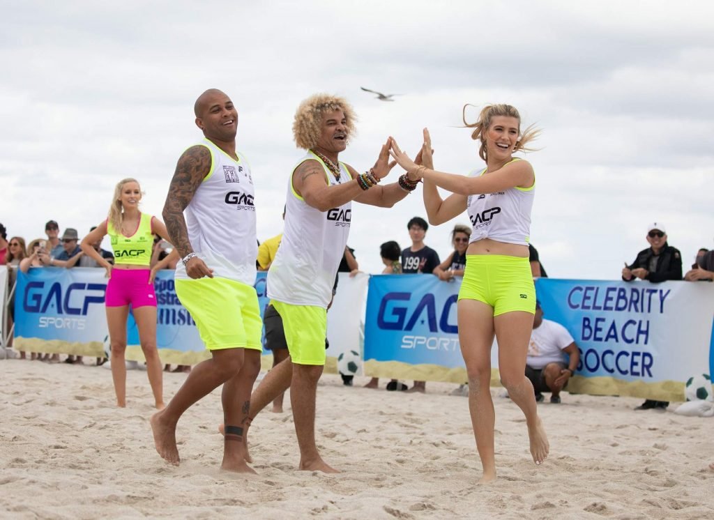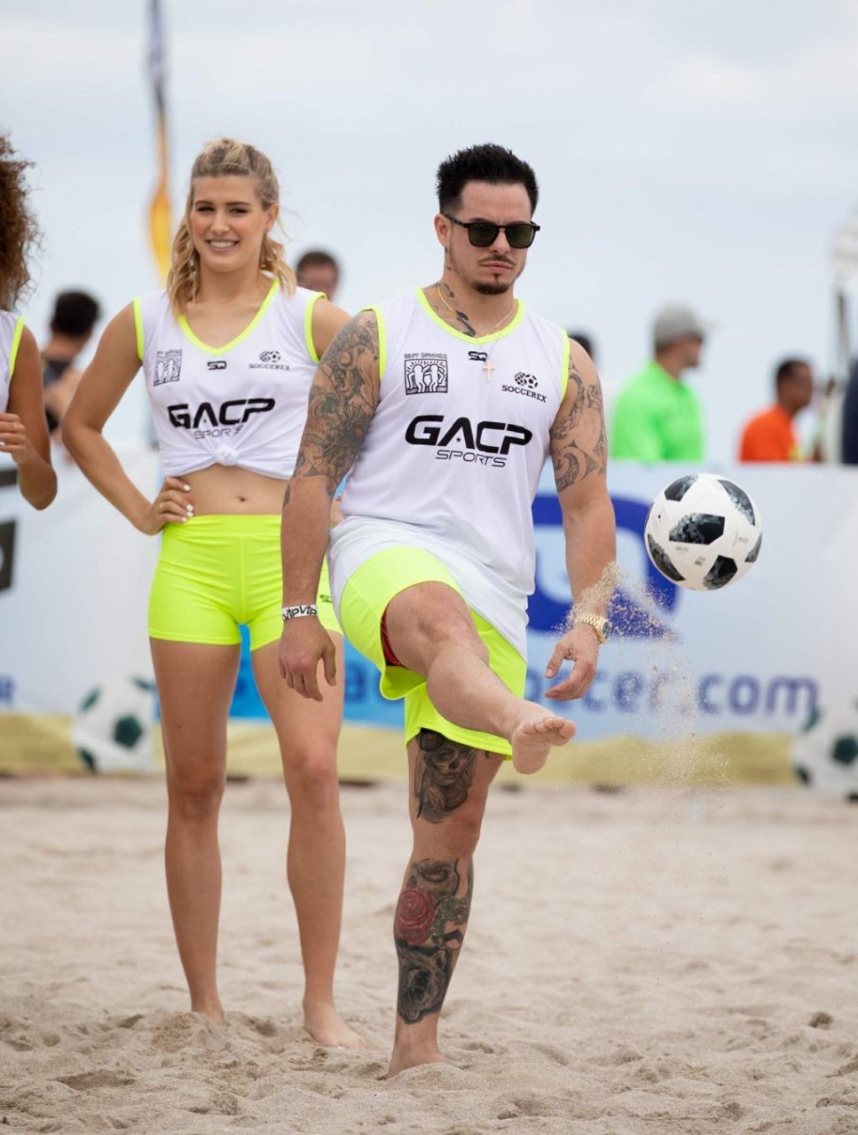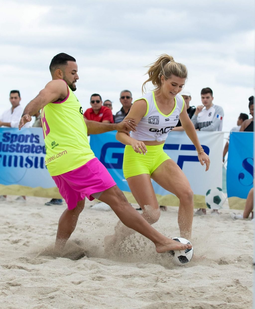 Теннисистка Юджини “Джинни” Бушар (24) удивила всех во время матча по пляжному футболу среди знаменитостей Sports Illustrated в Майами, 17.11.2018. Она была в белой майке и неоновых шортах, которые подчеркивали её соски и контур промежности.