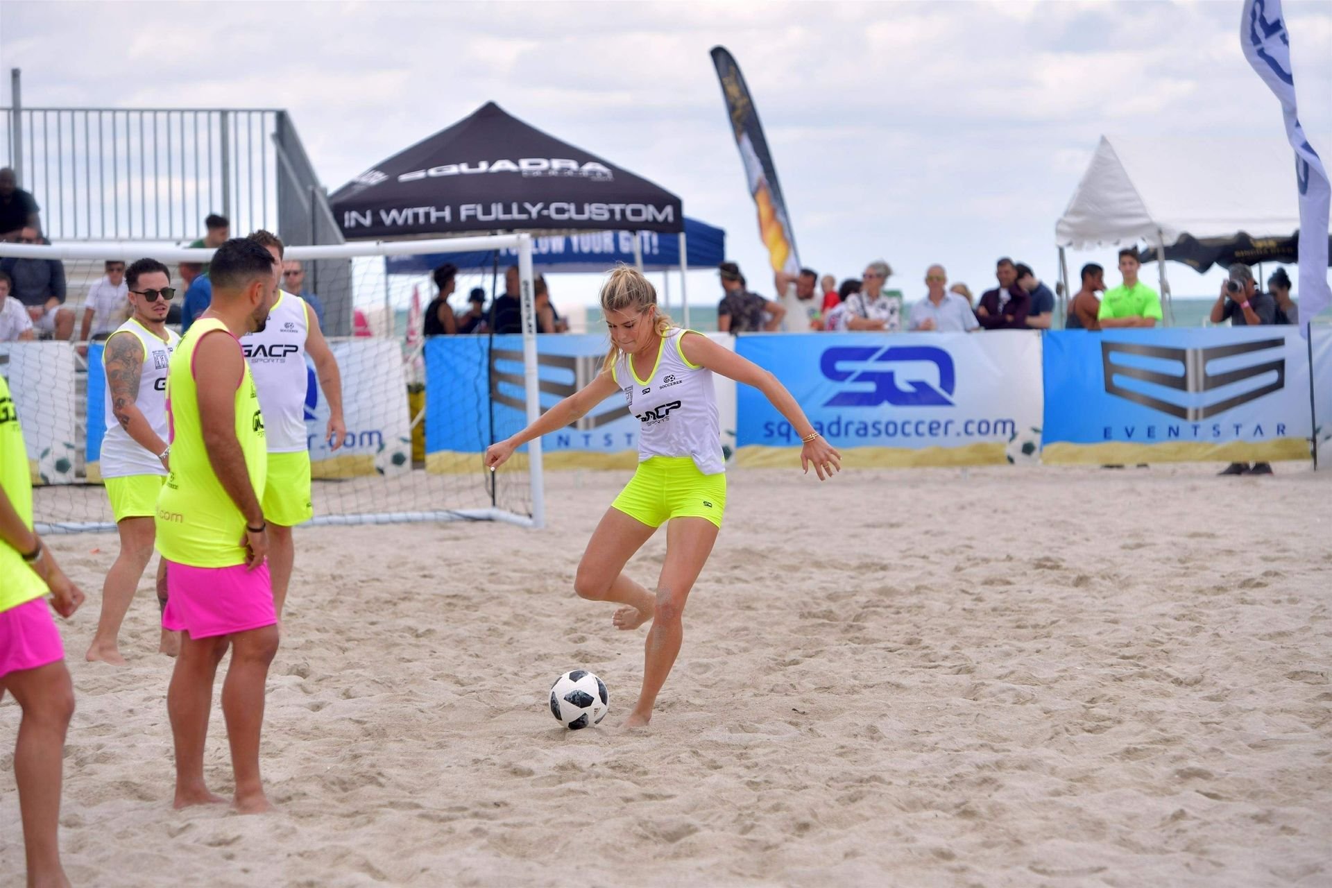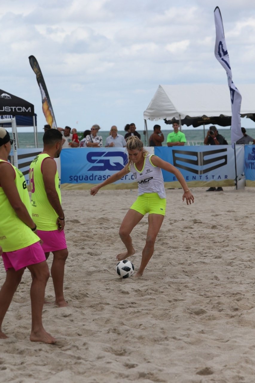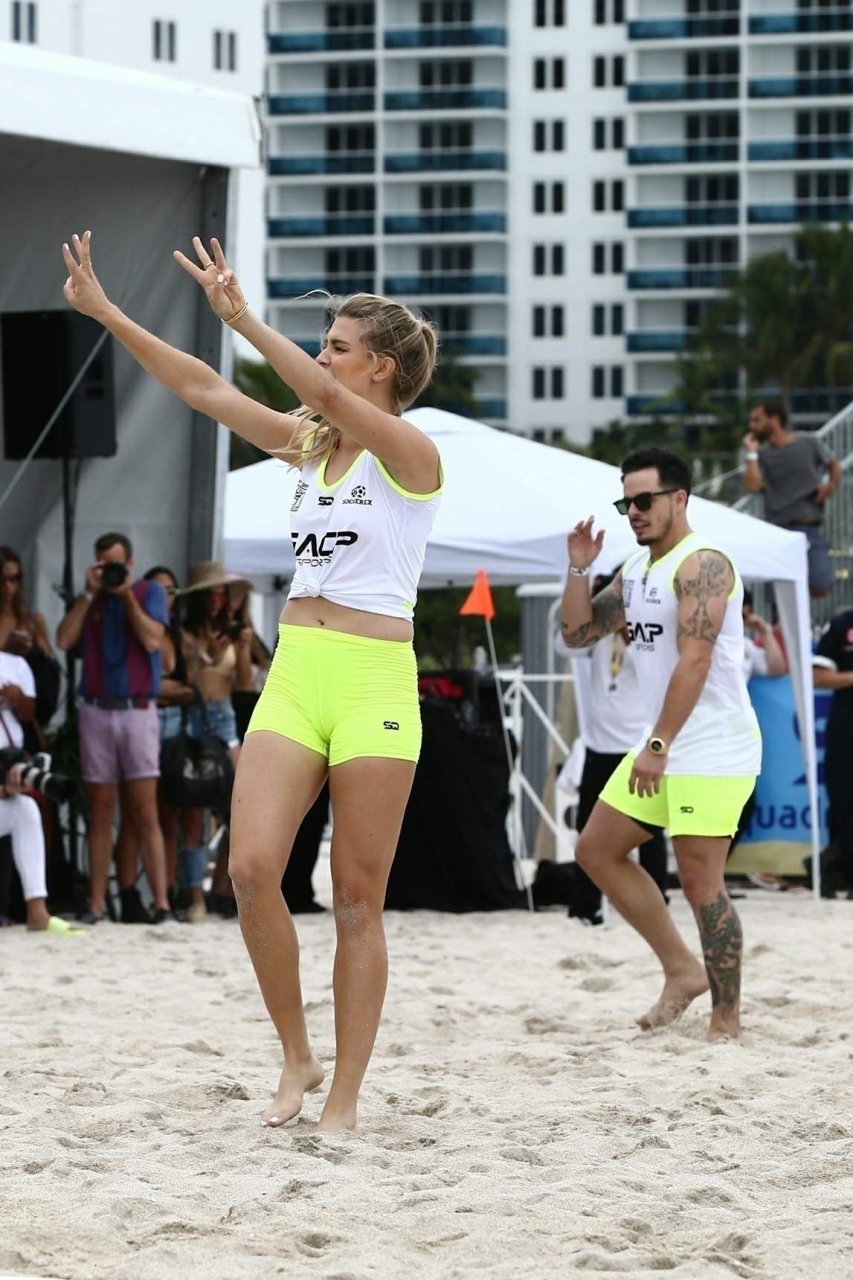 Теннисистка Юджини “Джинни” Бушар (24) удивила всех во время матча по пляжному футболу среди знаменитостей Sports Illustrated в Майами, 17.11.2018. Она была в белой майке и неоновых шортах, которые подчеркивали её соски и контур промежности.