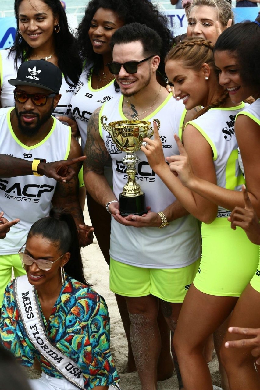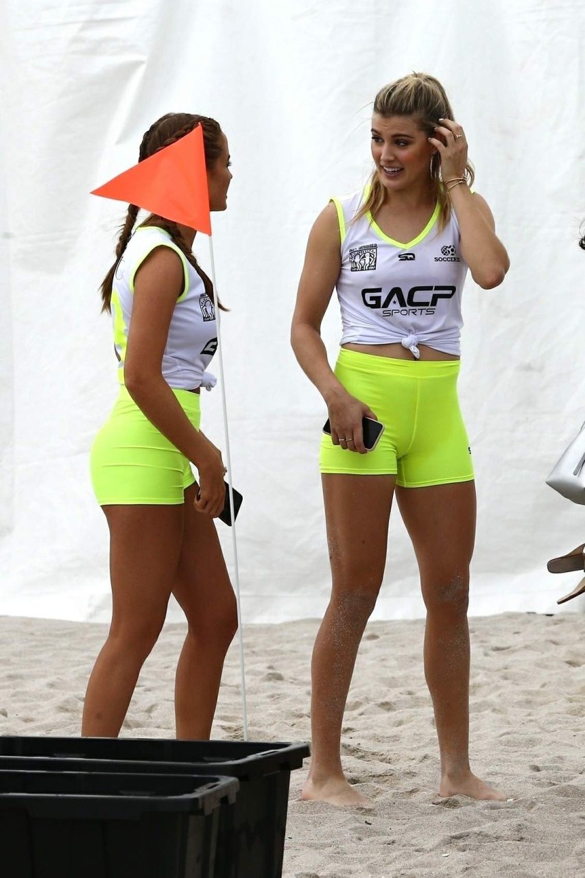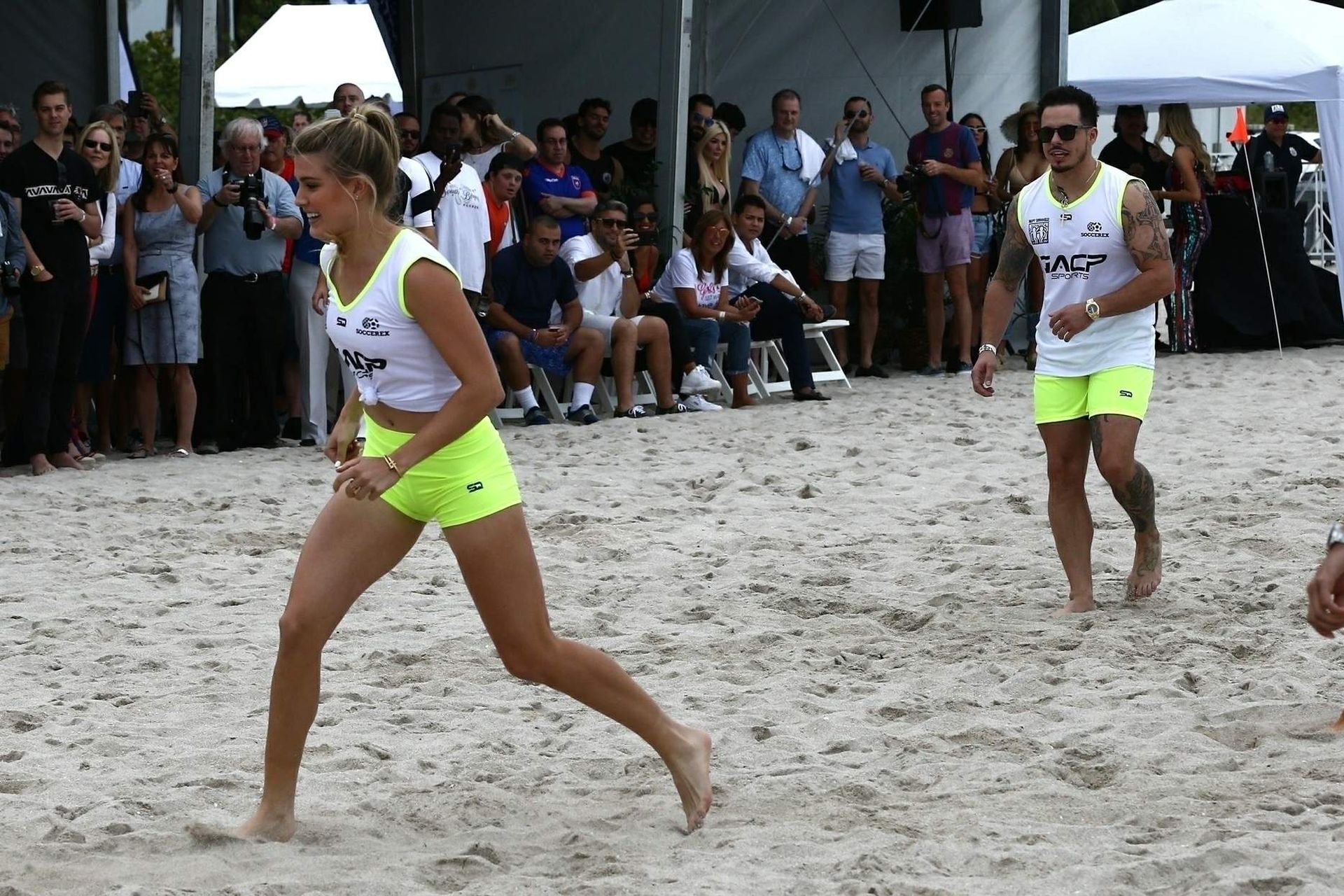 Теннисистка Юджини “Джинни” Бушар (24) удивила всех во время матча по пляжному футболу среди знаменитостей Sports Illustrated в Майами, 17.11.2018. Она была в белой майке и неоновых шортах, которые подчеркивали её соски и контур промежности.