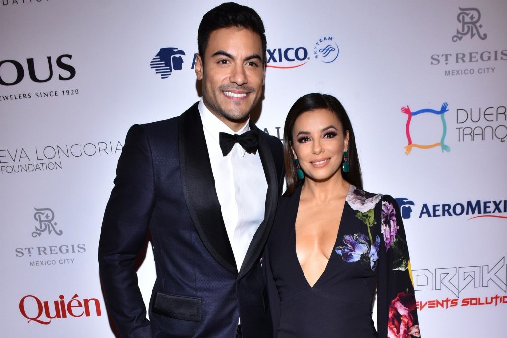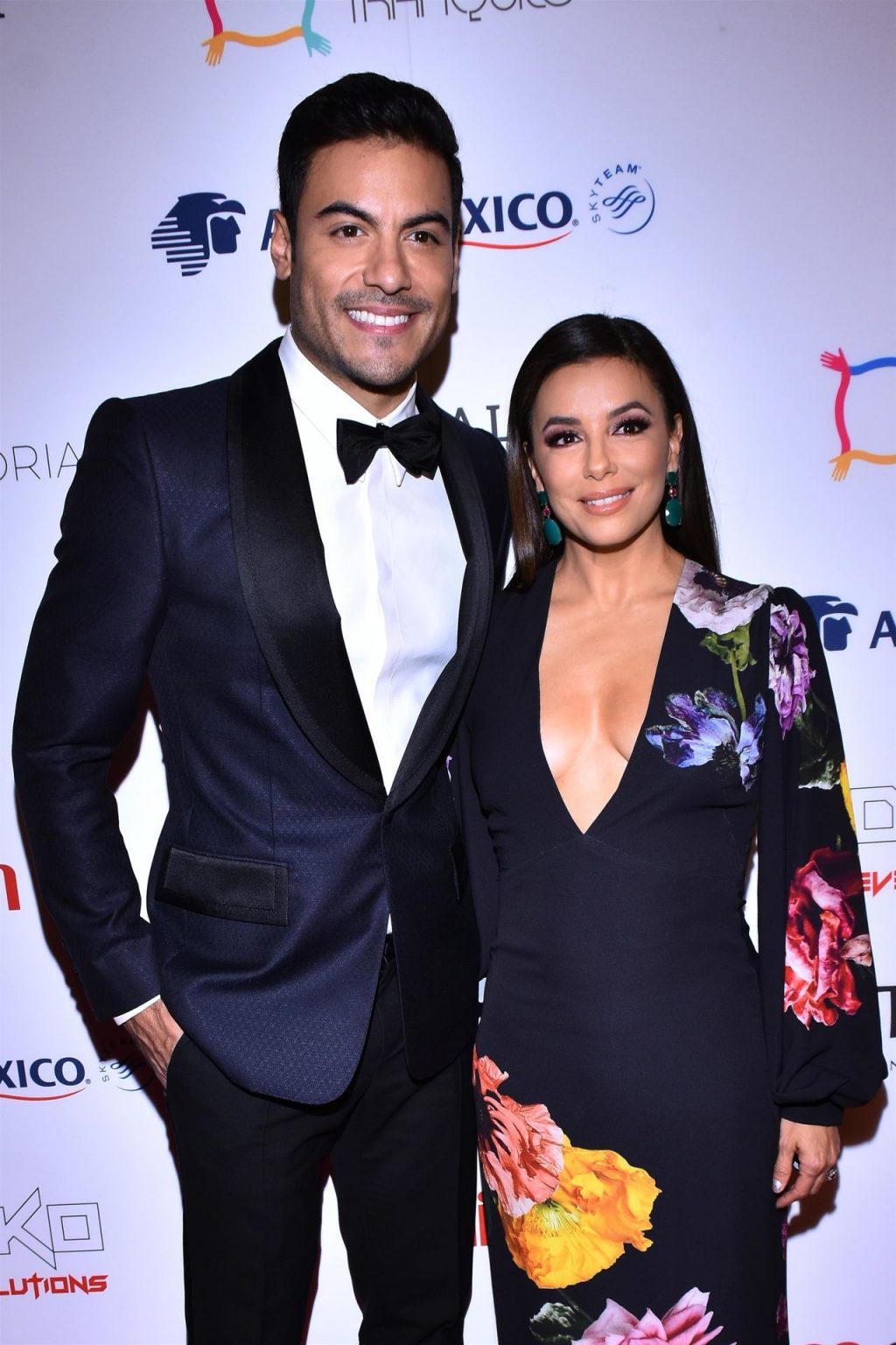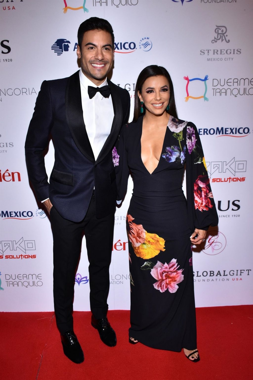 Актриса Ева Лонгория позирует для фотографий в синем платье с глубоким декольте на 5-м гала-вечере Global Gift Foundation в отеле St Regis в Мехико, 19.11.2019.
