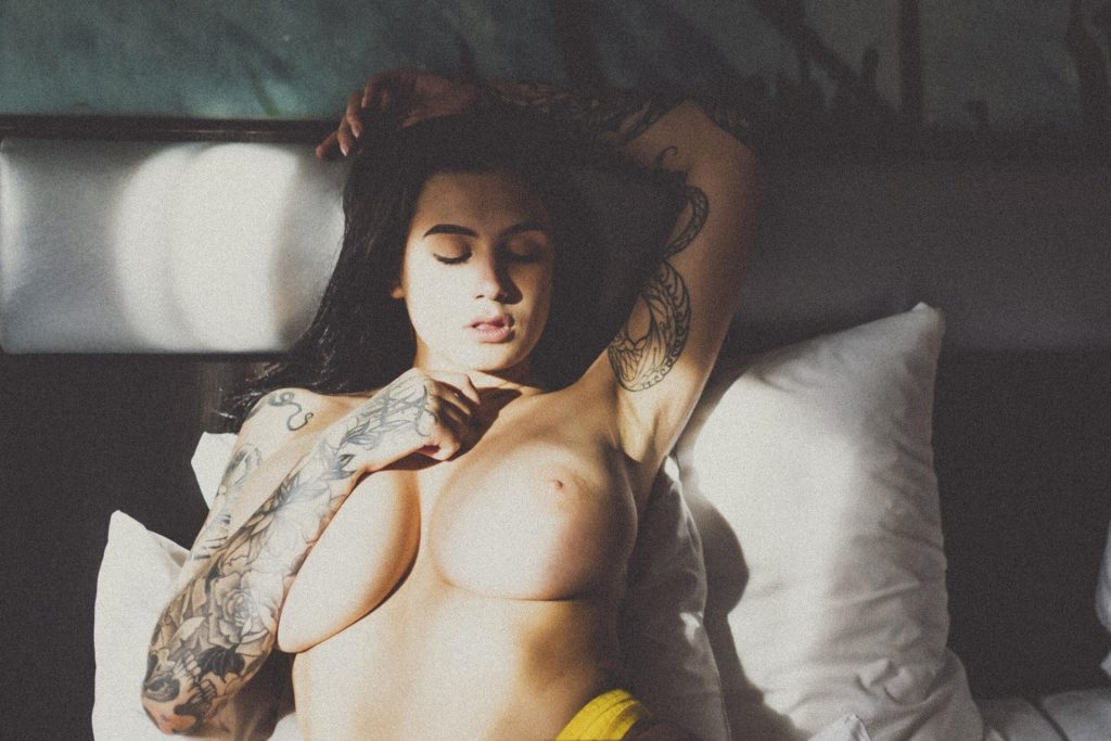 Пышногрудая татуированная российская модель Евгения Таланина, также известная как Джейн Фэй, снимает свое желтое бикини, чтобы показать свои достоинства в фотосессии Теймура Мадждерея, также известного как Teym The Beast (2020).